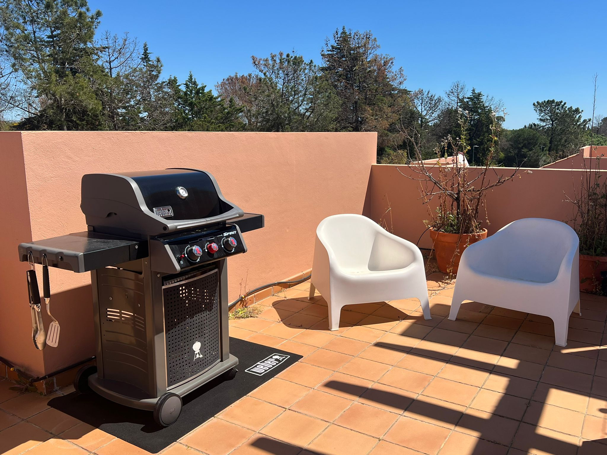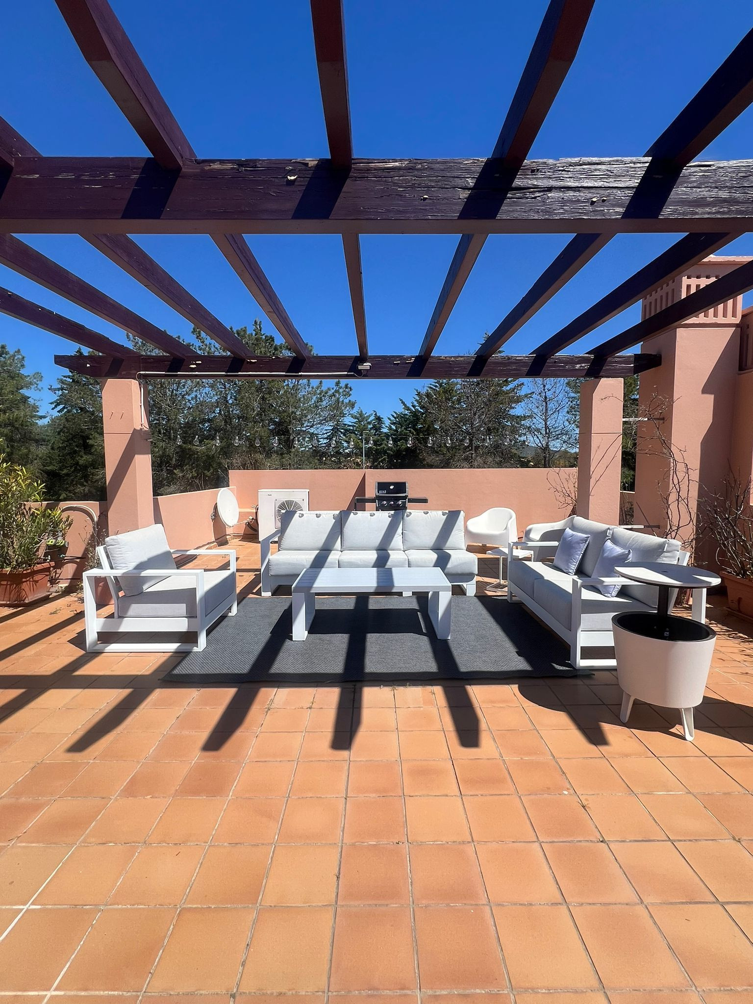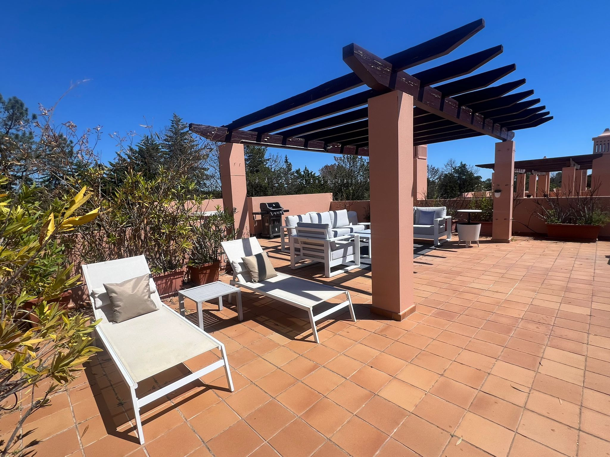 El punto culminante de este apartamento es su amplia terraza de 80 m², con muebles de jardín y una zona de barbacoa, perfecta para disfrutar de comidas al aire libre y momentos de ocio en familia o con amigos. Además, los huéspedes tienen acceso a una piscina compartida, ideal para refrescarse en los días más calurosos.