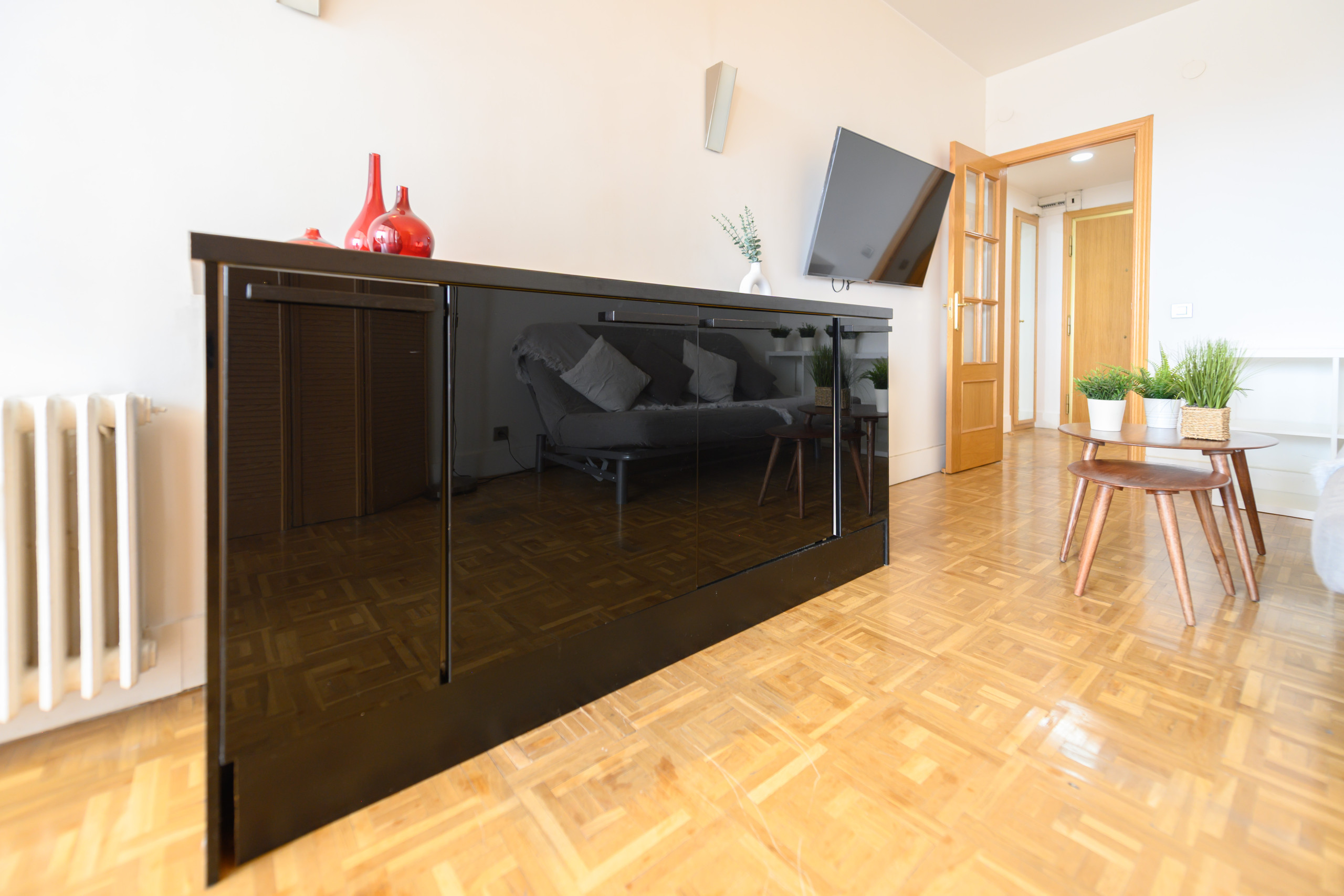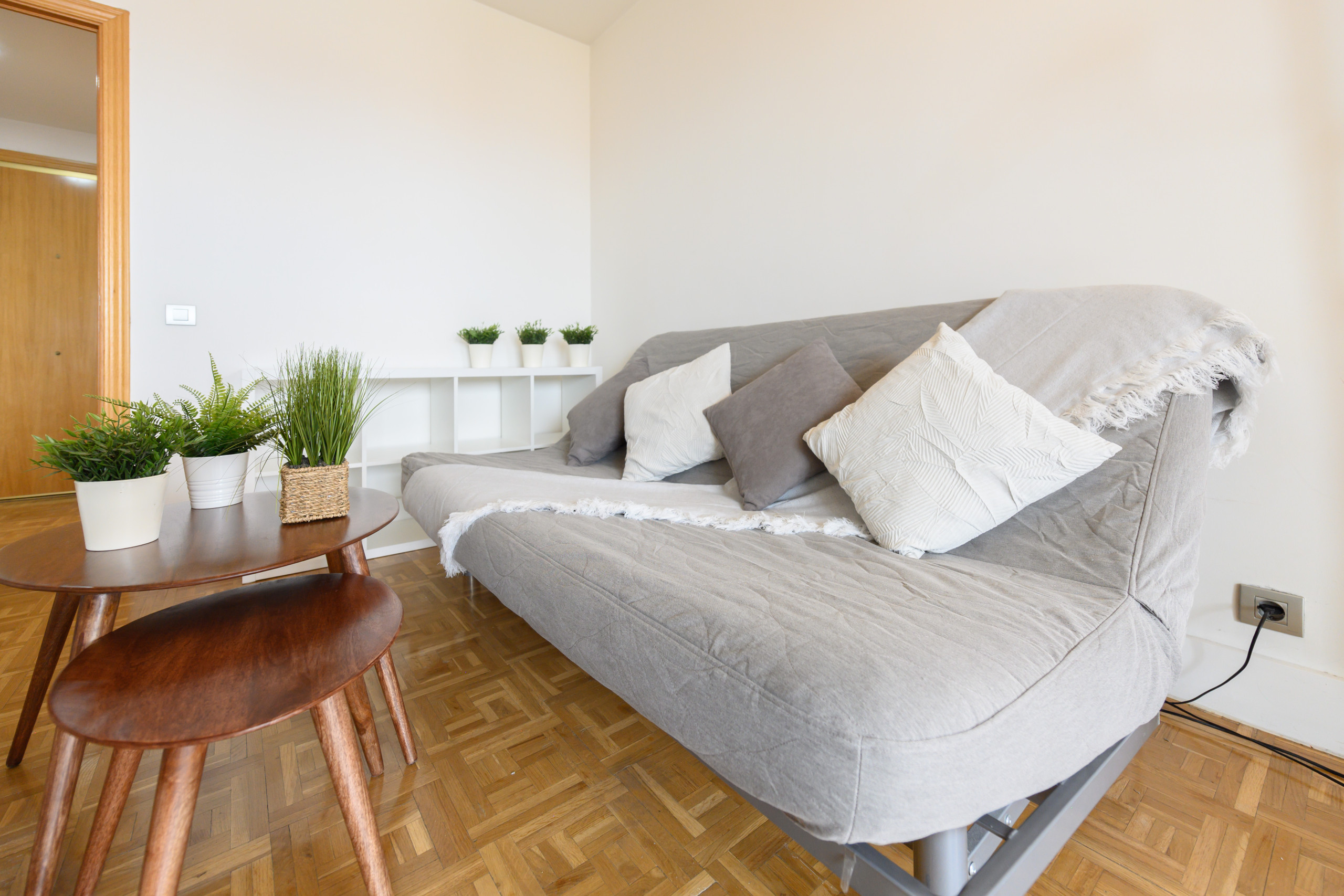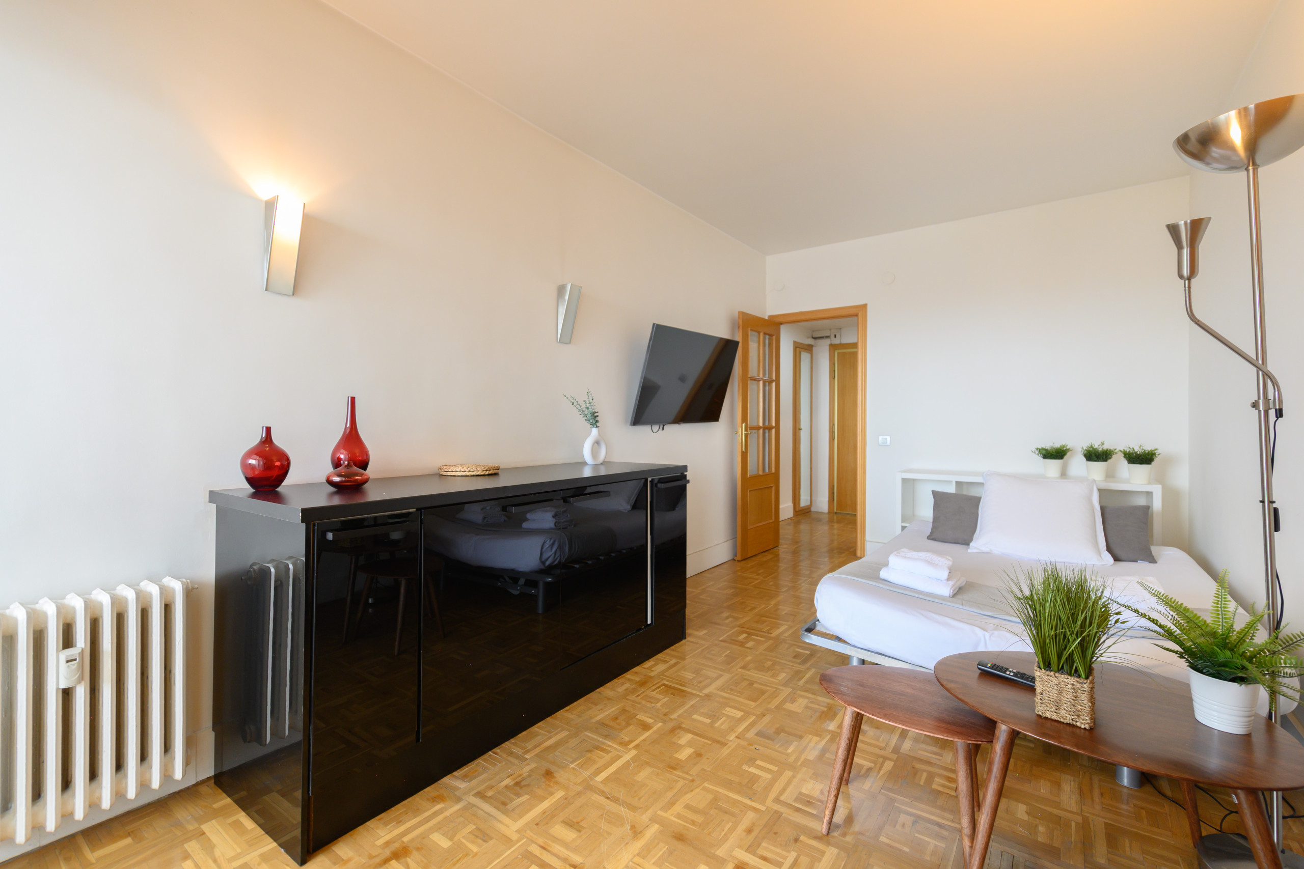 El salón es amplio y luminoso, perfecto para relajarse tras un día en la ciudad. Incluye un cómodo sofá cama, ideal para huéspedes adicionales, Smart TV, y una decoración cálida y moderna que invita a sentirse como en casa.