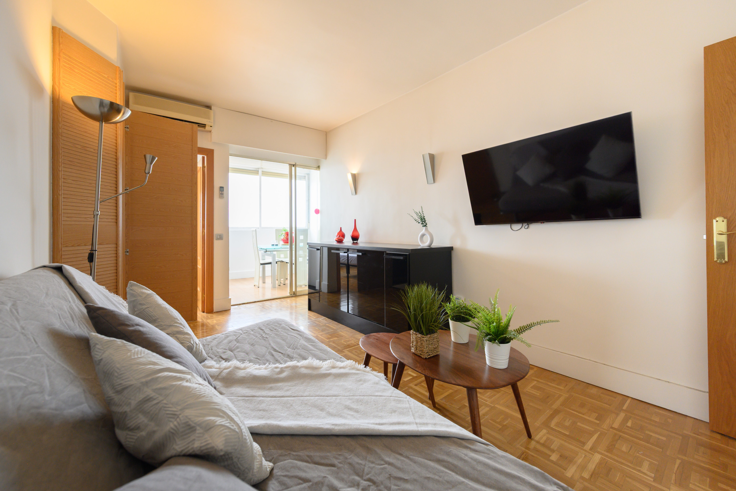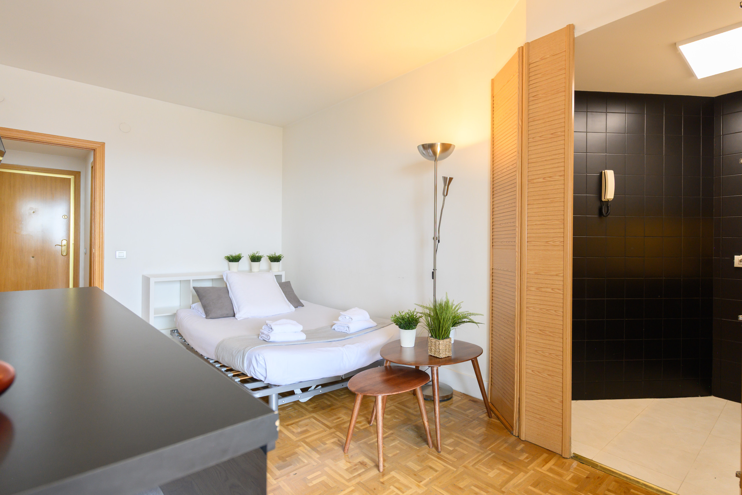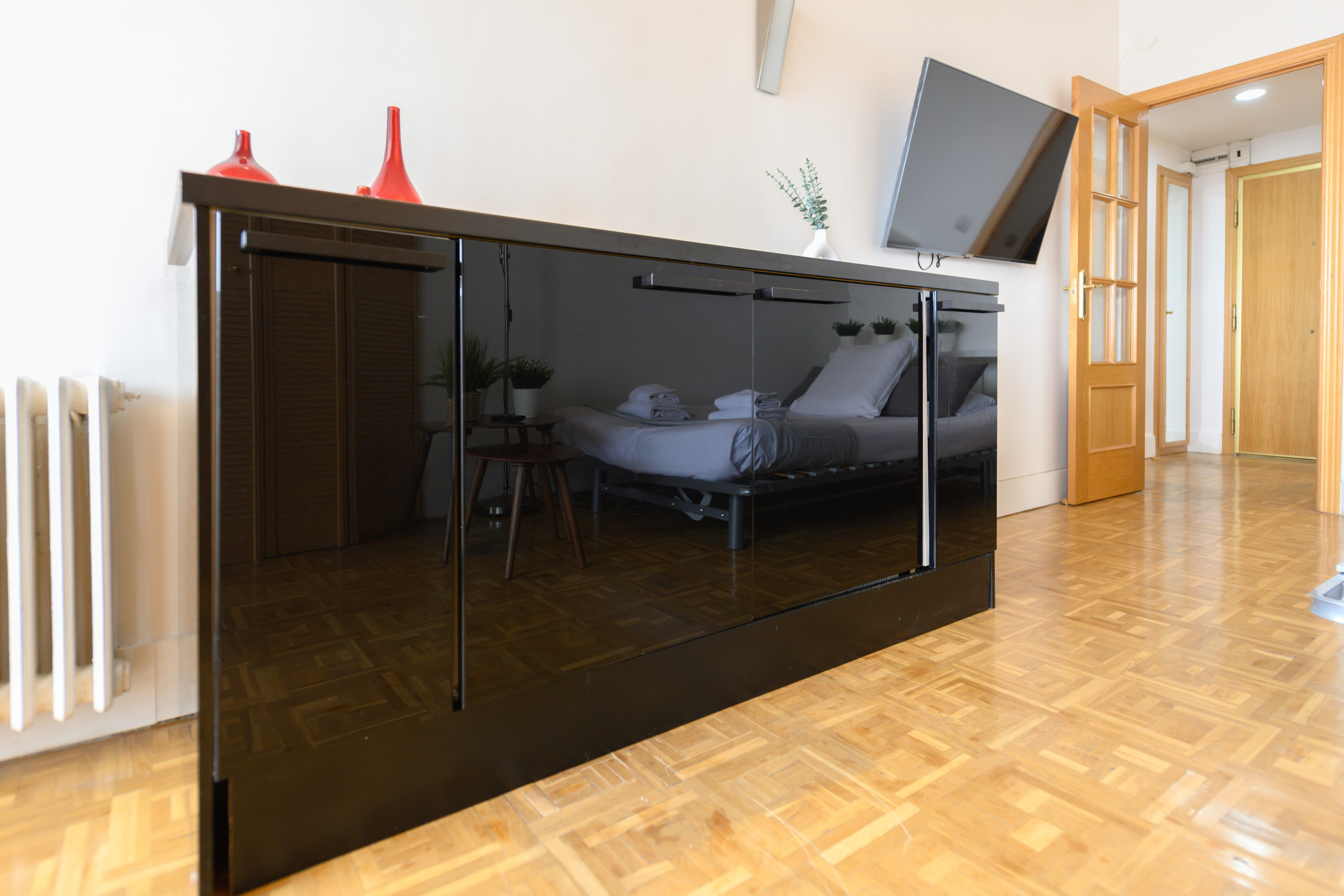 El salón es amplio y luminoso, perfecto para relajarse tras un día en la ciudad. Incluye un cómodo sofá cama, ideal para huéspedes adicionales, Smart TV, y una decoración cálida y moderna que invita a sentirse como en casa.