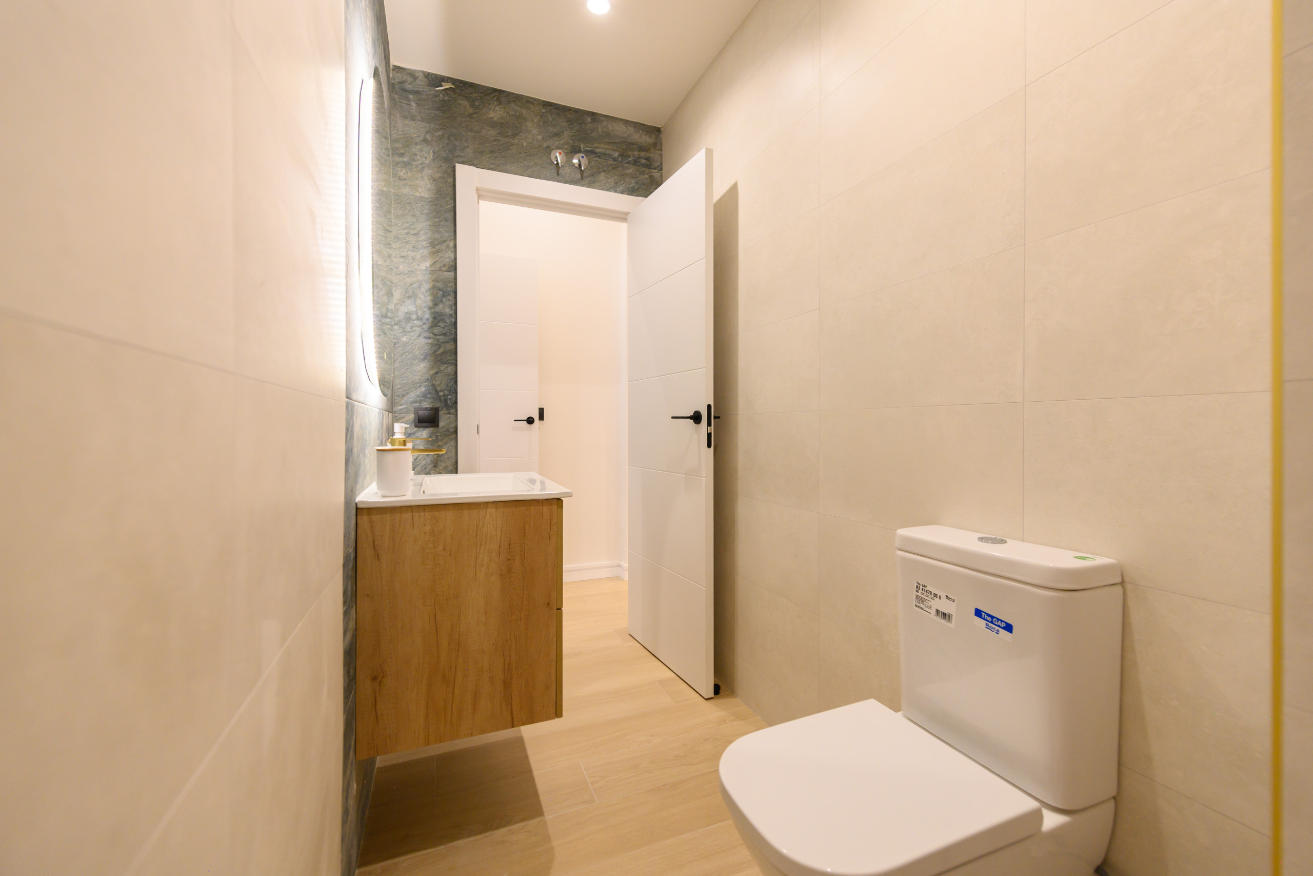 • Además, hay un tercer baño de uso general, también con plato de ducha, mueble de lavado y espejo.