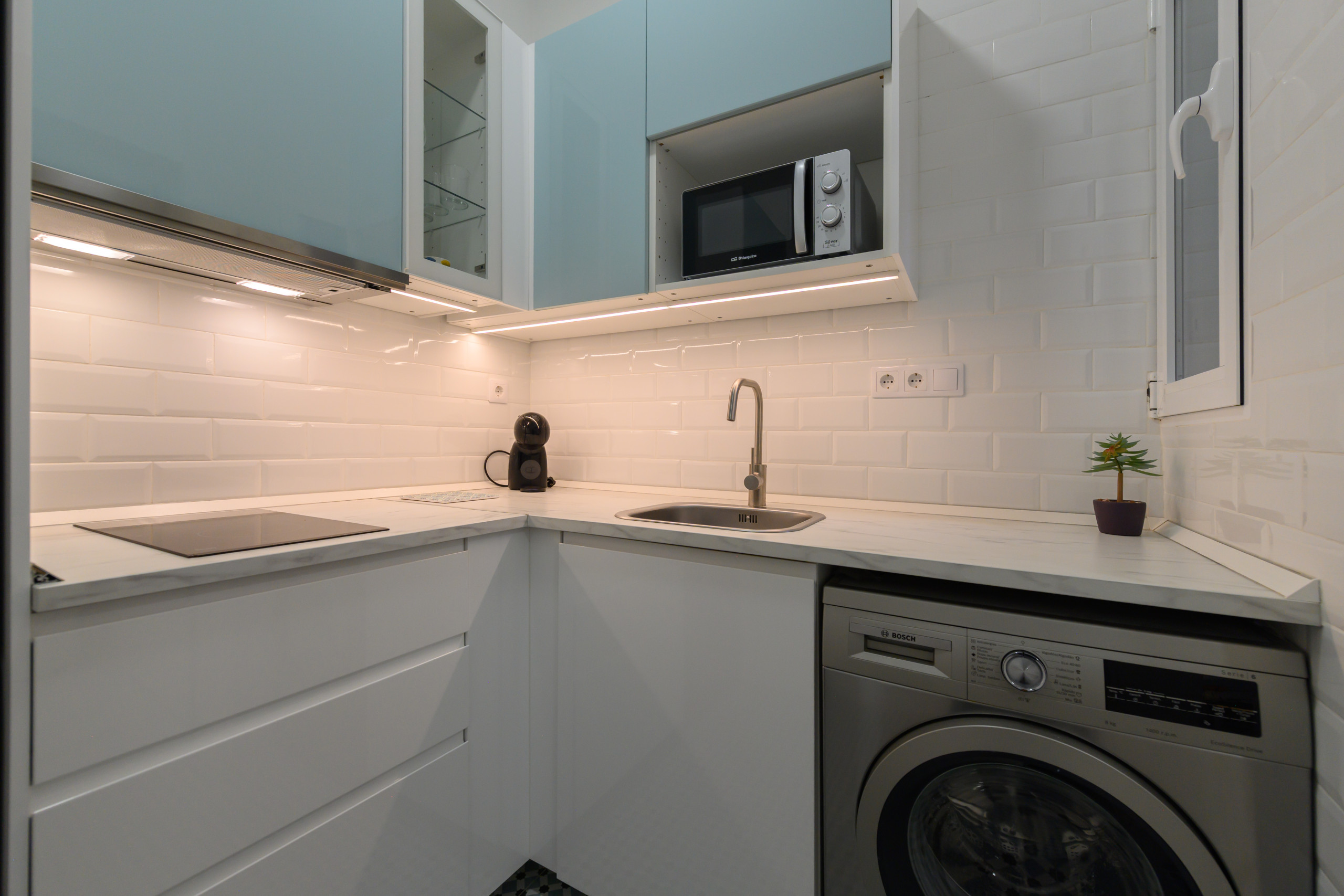 • Cocina americana totalmente equipada, lavadora, horno, microondas y nevera, ideal para preparar tus comidas favoritas.