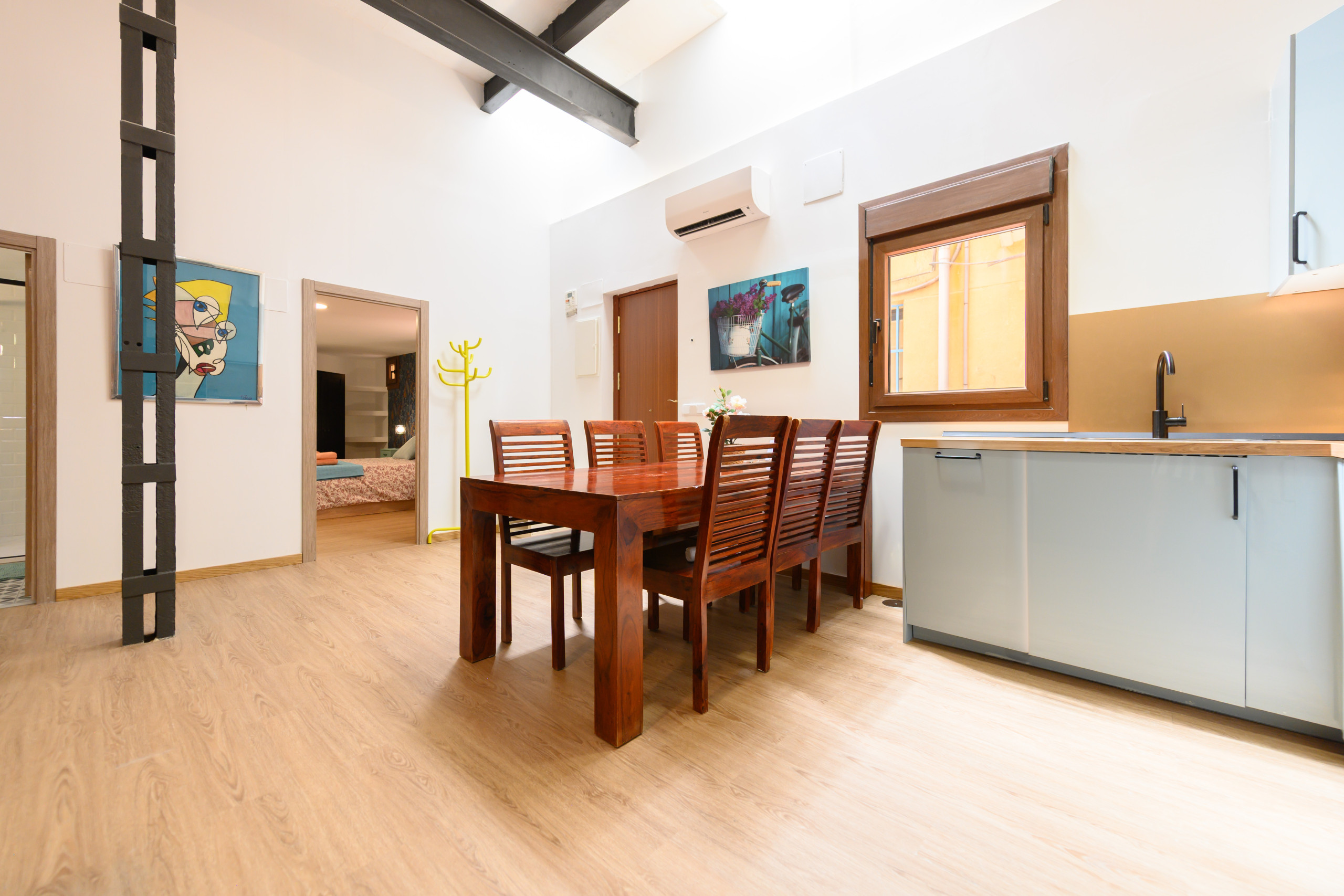 El salón-comedor se integra perfectamente con la cocina americana, creando un ambiente acogedor y práctico. En el salón encontrarás un sofá cama, televisión de pantalla plana, aire acondicionado y una mesa de comedor con capacidad para varios comensales.
