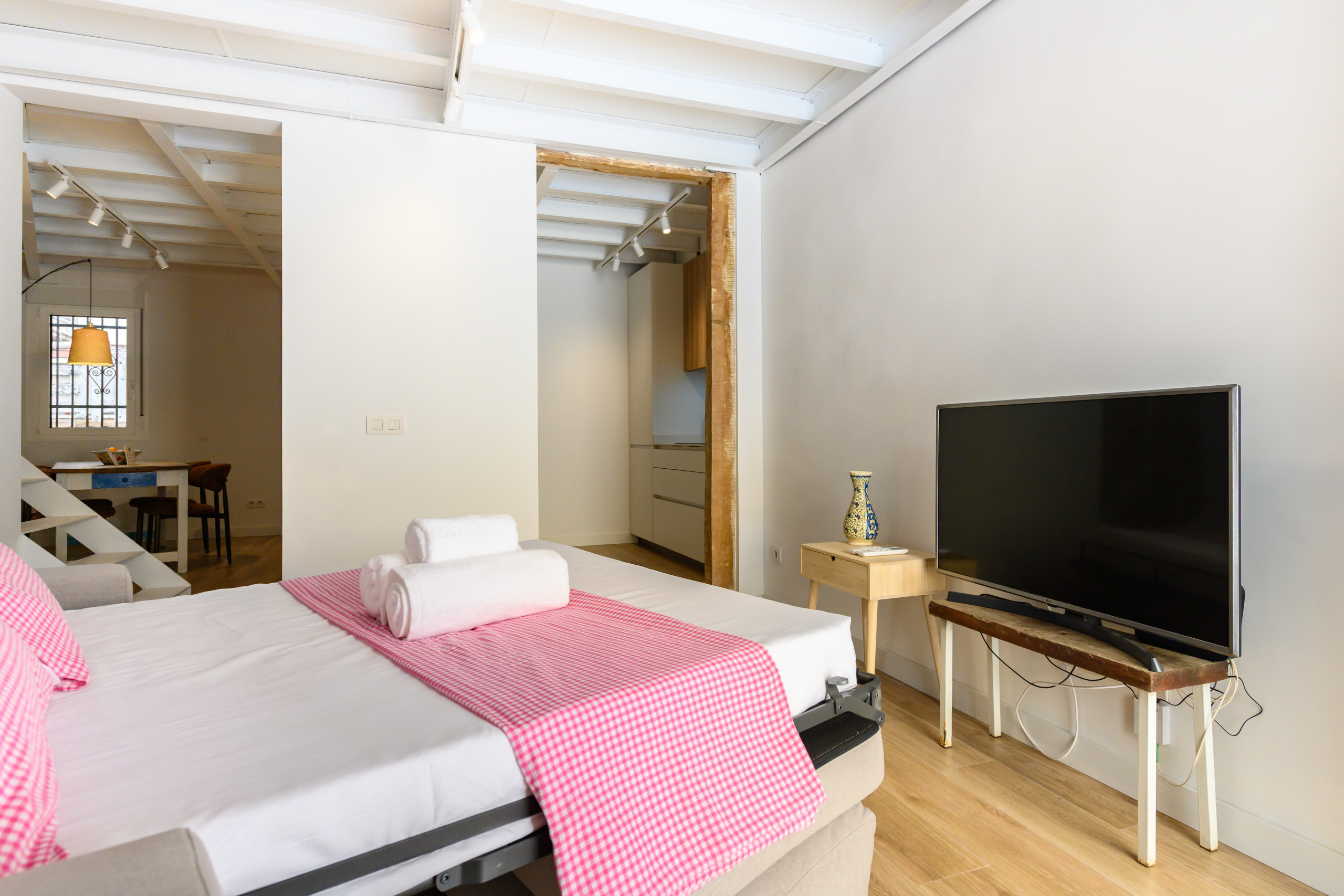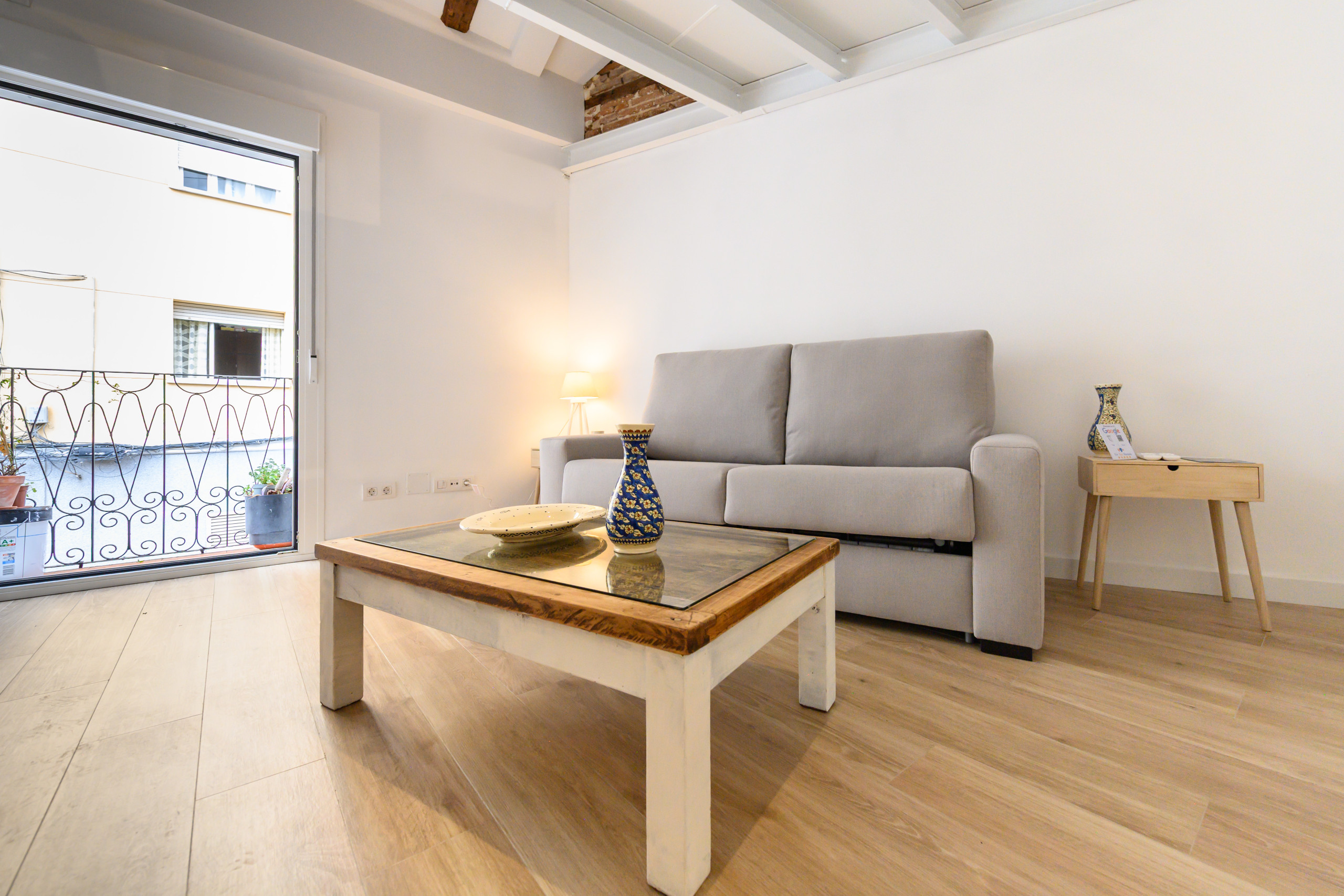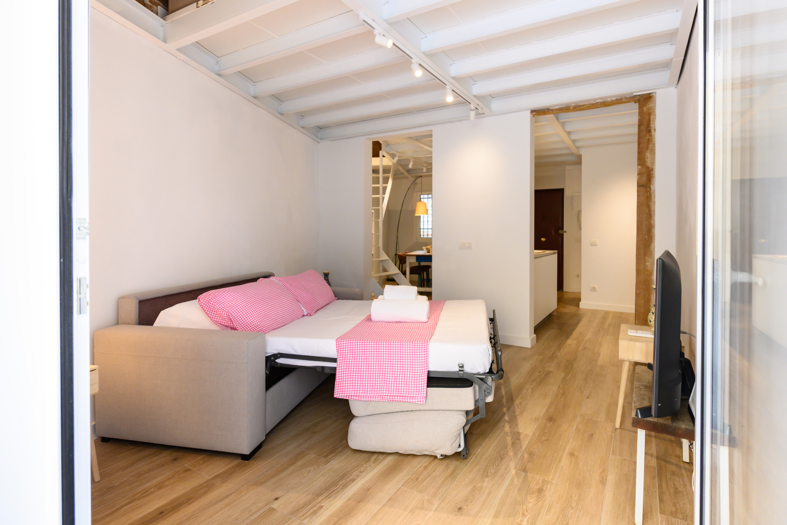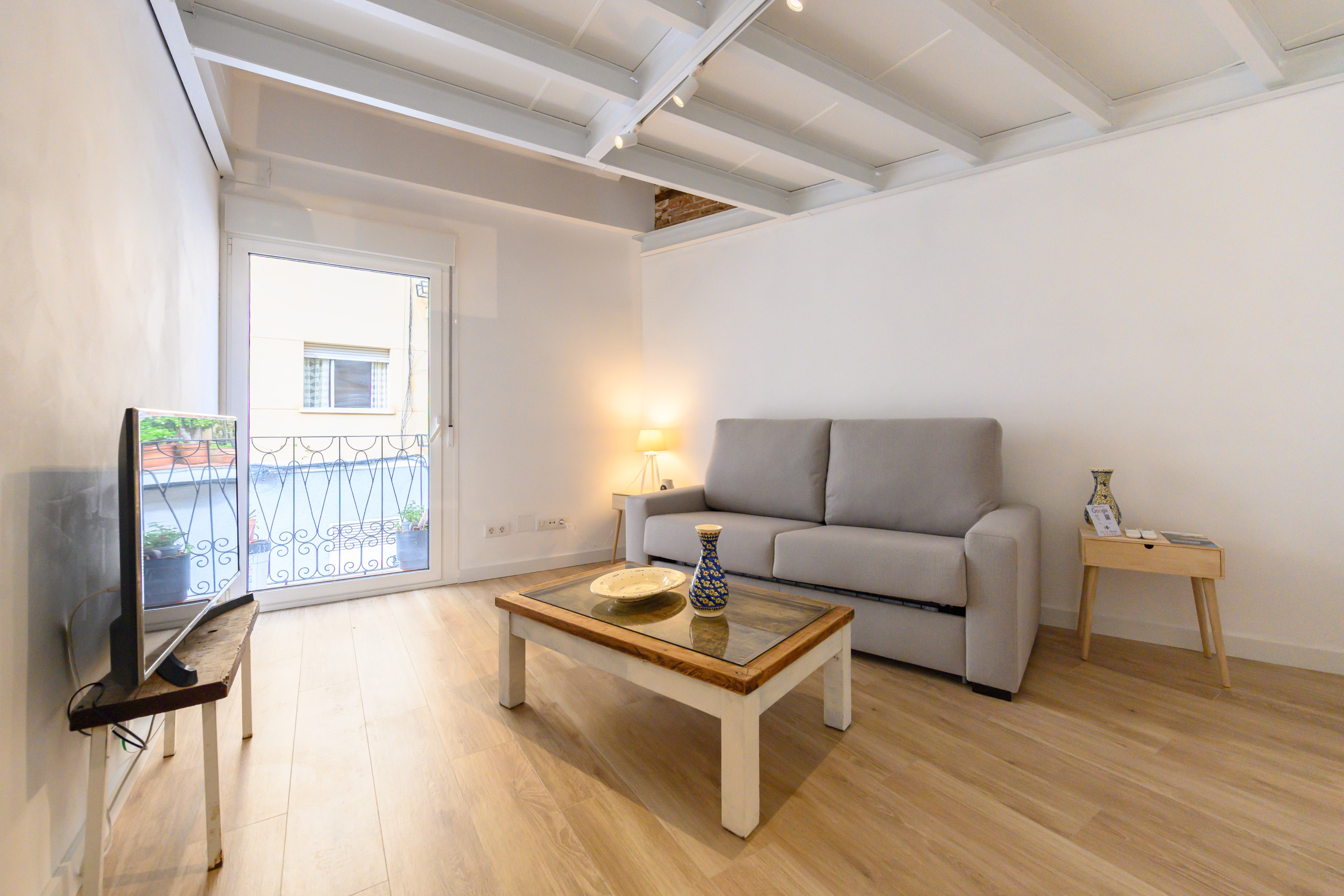 • Salón luminoso con sofá convertible en sofá cama doble, TV, mesa.