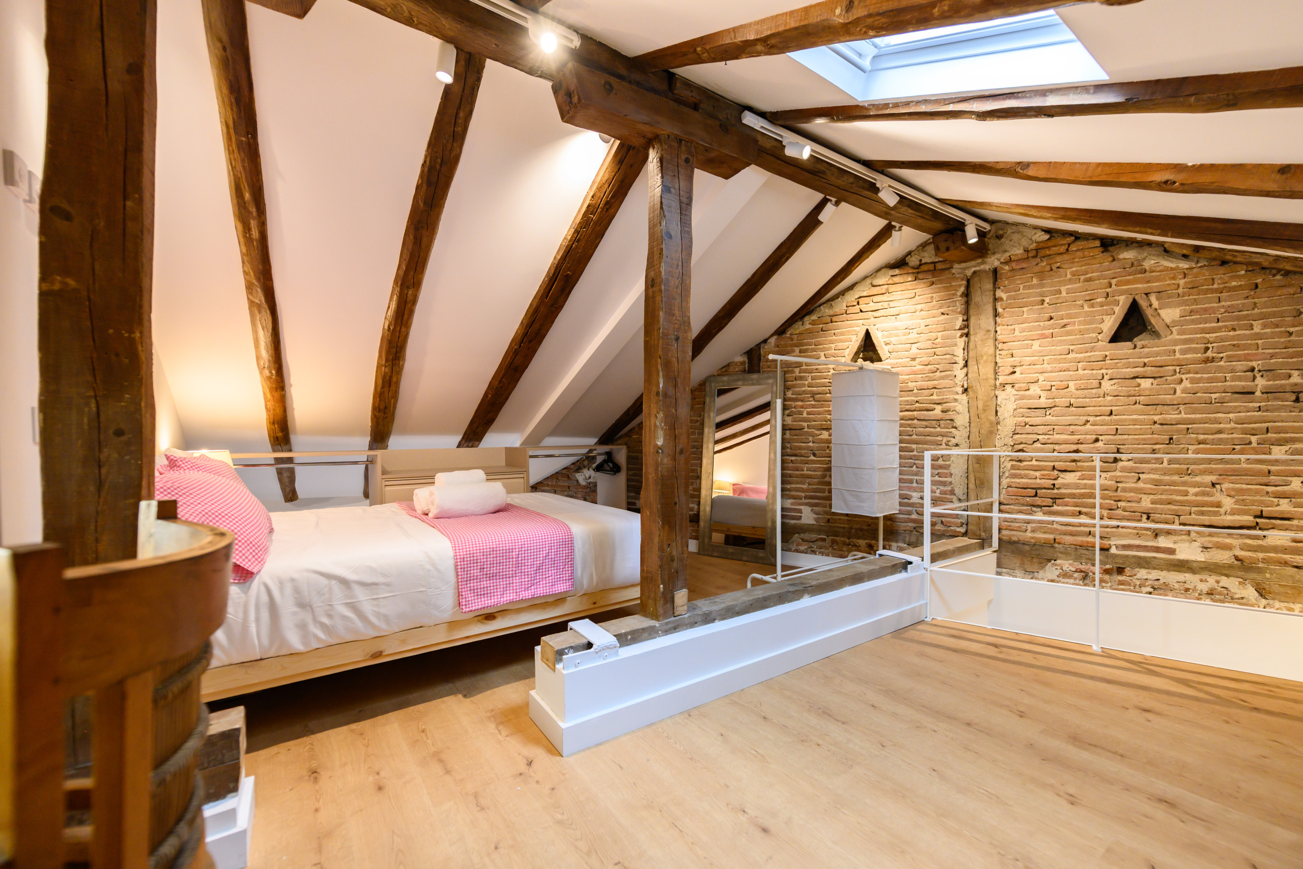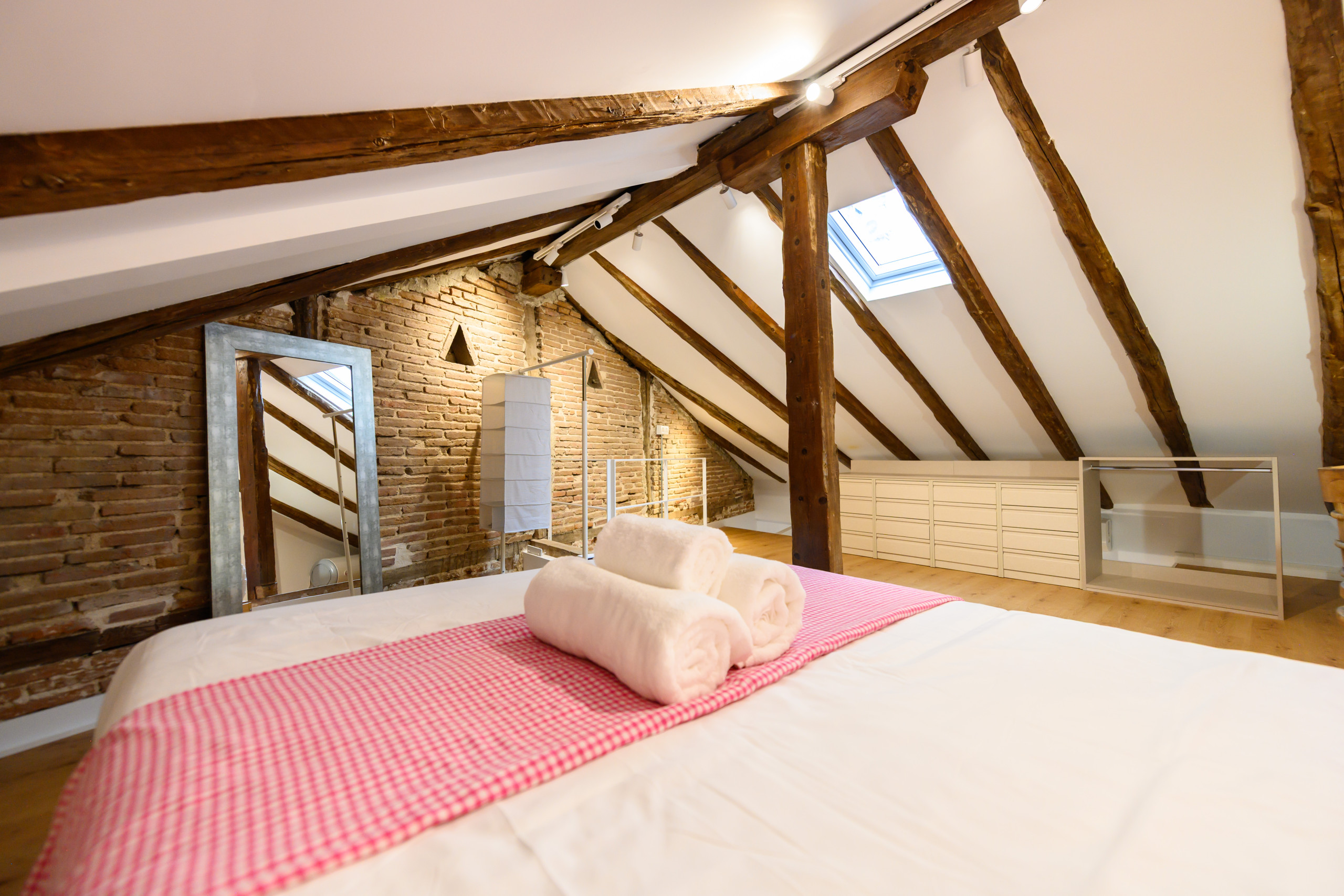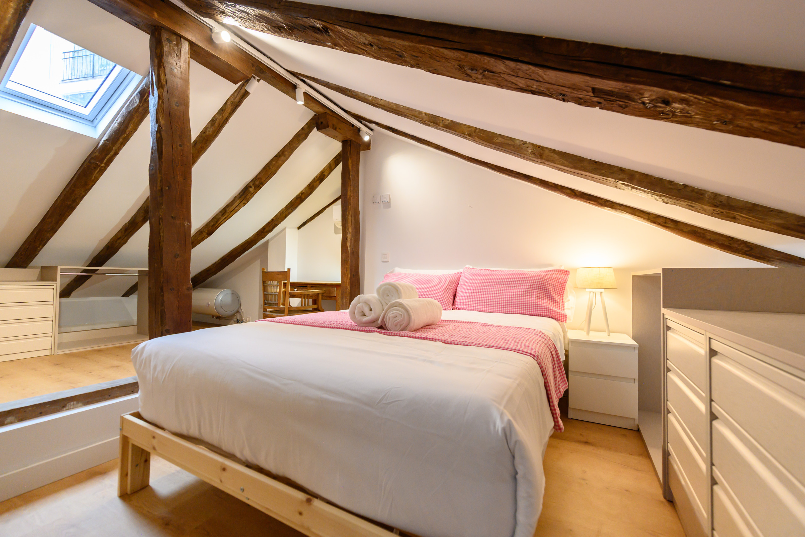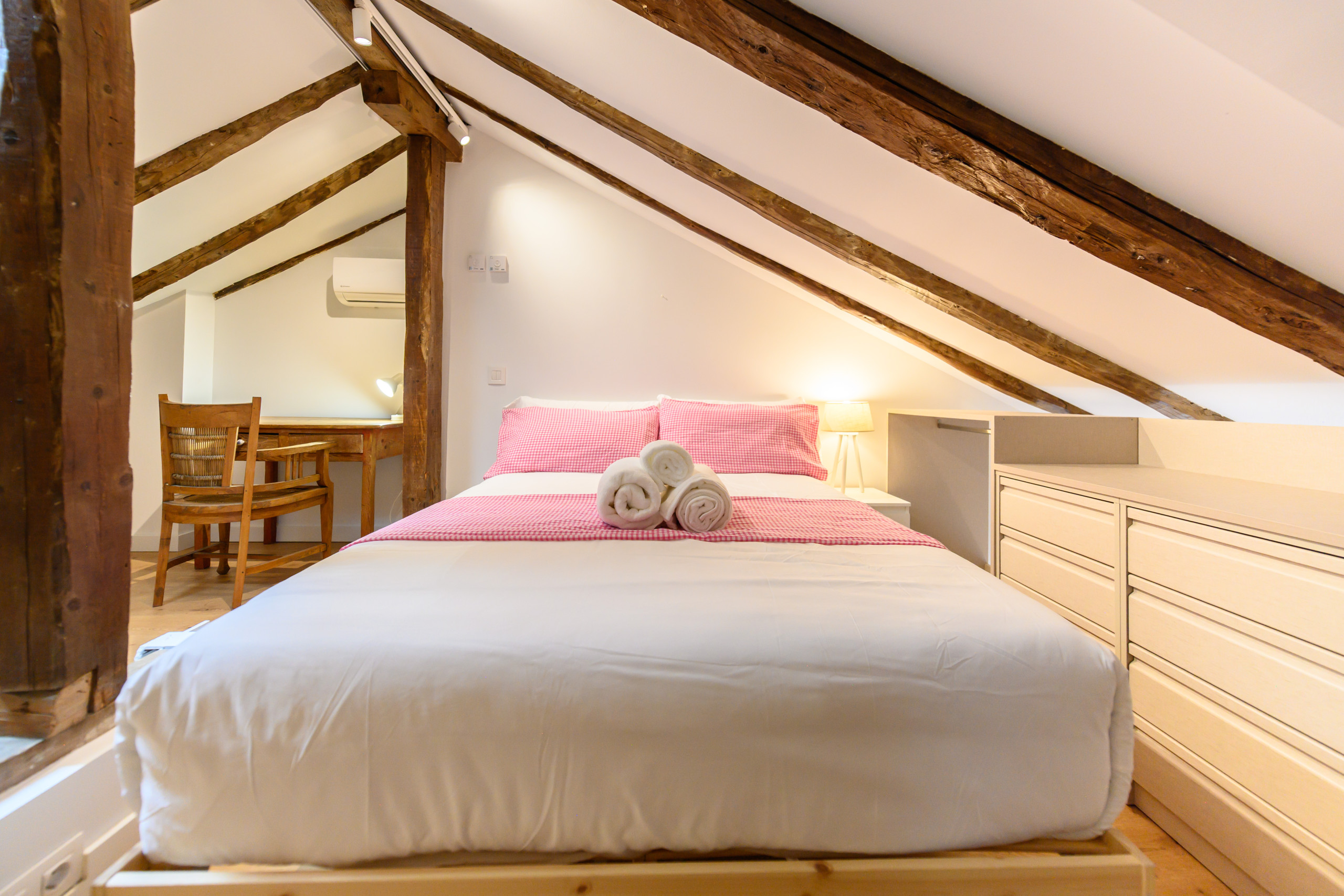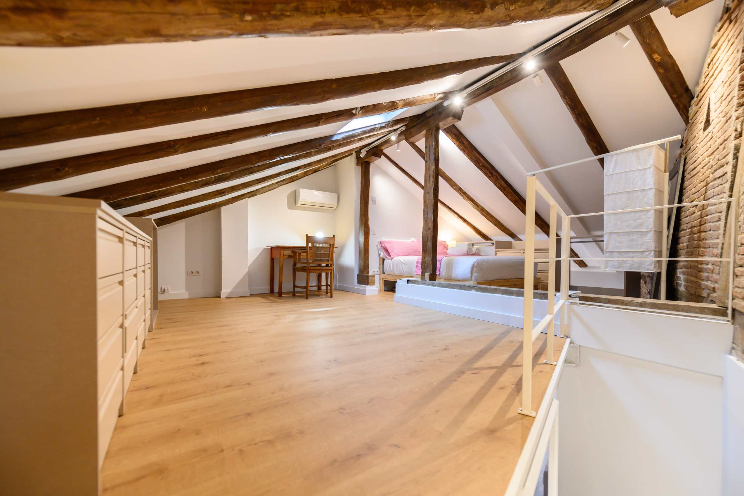 • Dormitorio en la planta superior con cama doble, escritorio ideal para teletrabajo o estudiar, cómodas amplias, perchero, espejo y aire acondicionado.
