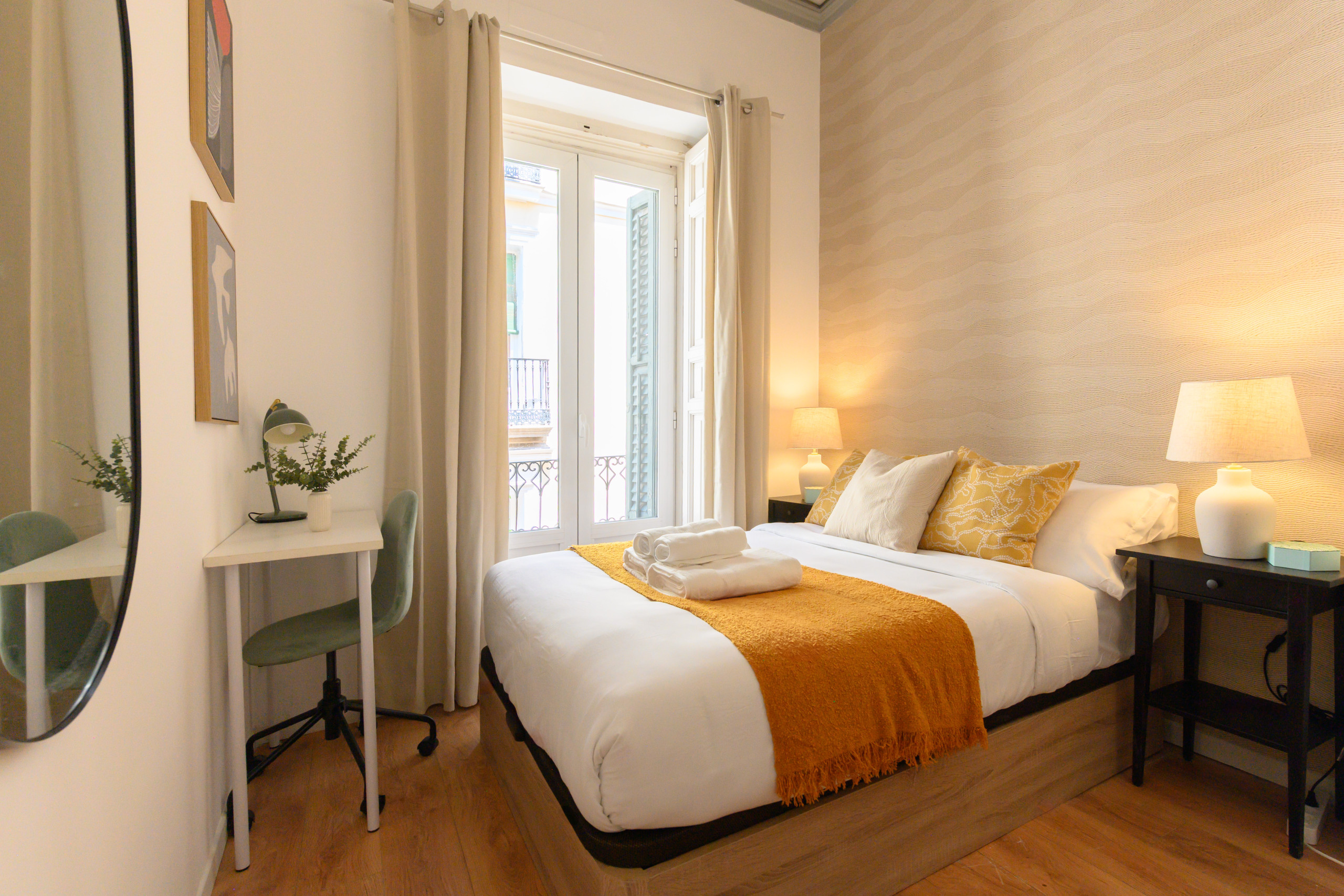 • Dormitorio independiente con cama doble cómoda, armarios para almacenamiento, escritorio de trabajo o estudio y acceso al balcón con vistas a una calle y llena de historia.