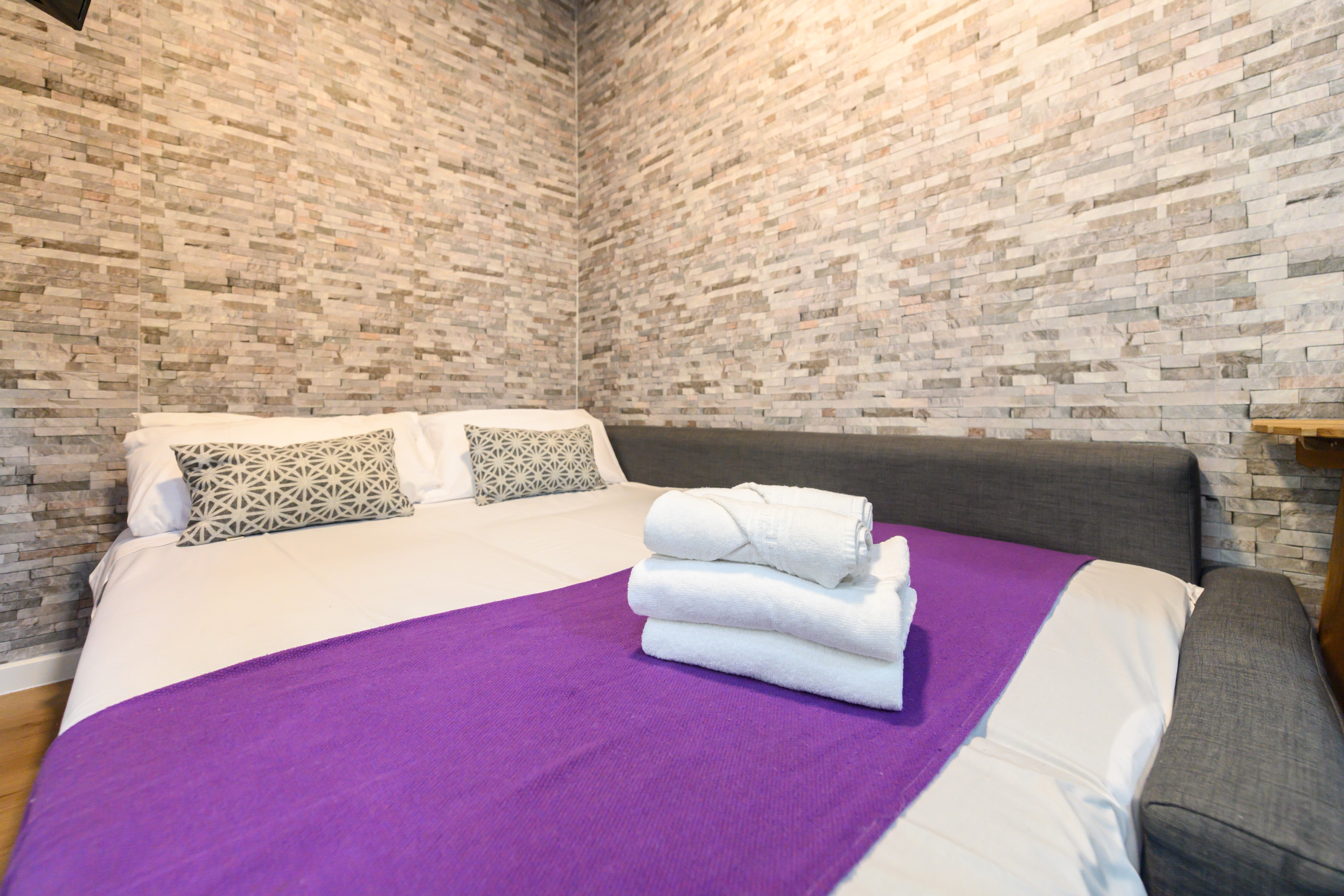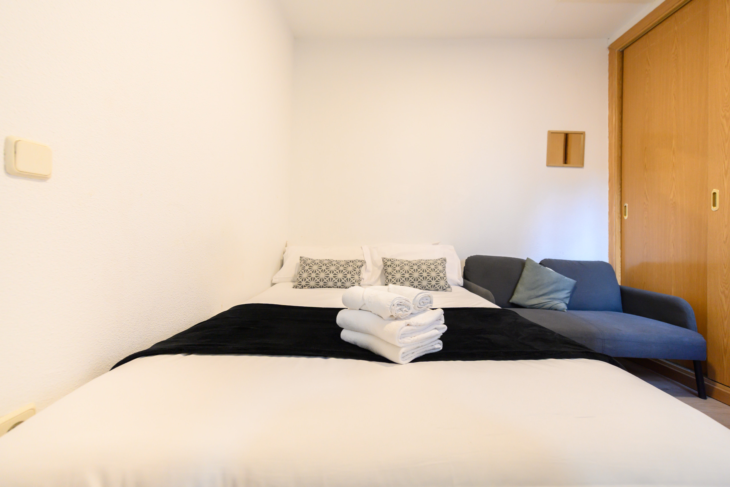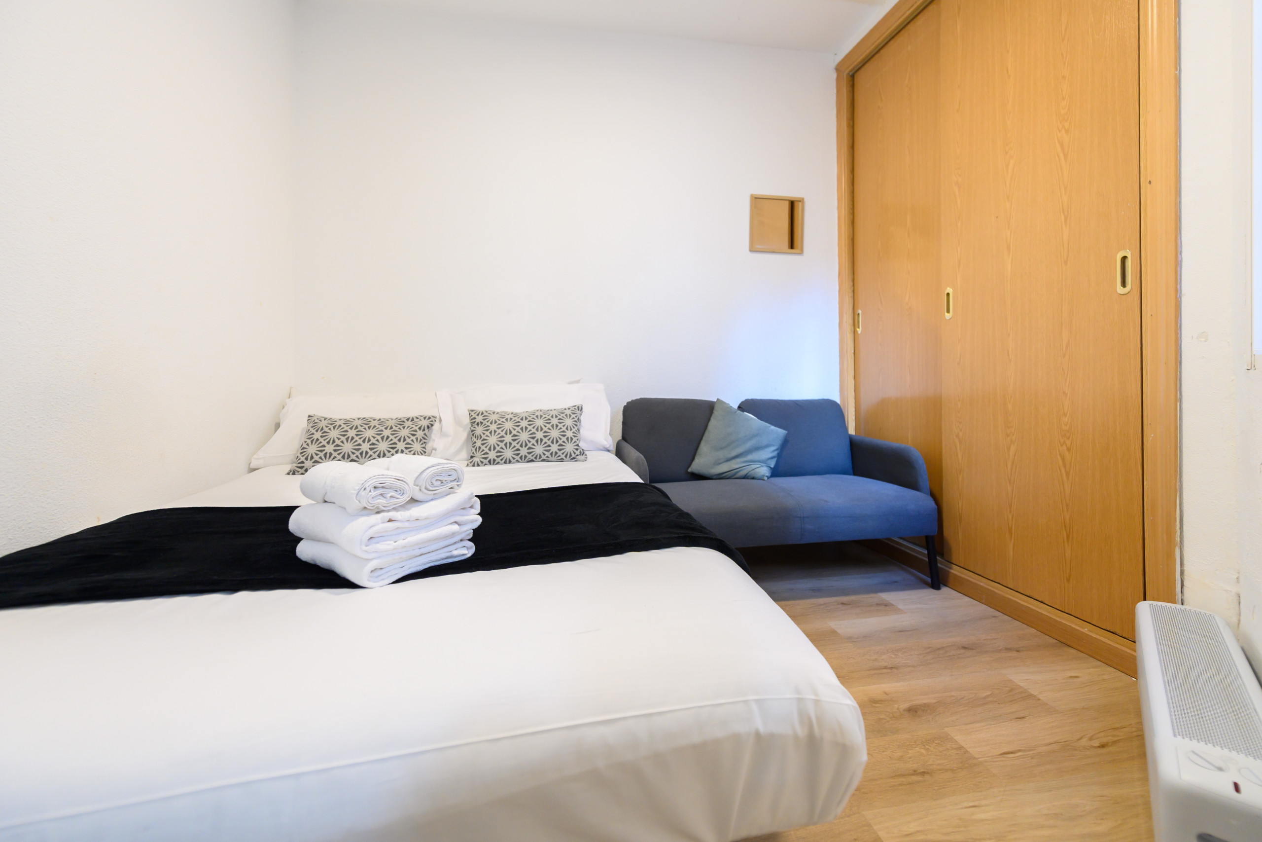 • Un dormitorio con cama doble, TV, armario empotrado, escritorio y sofá, perfecto tanto para descansar como para trabajar.
