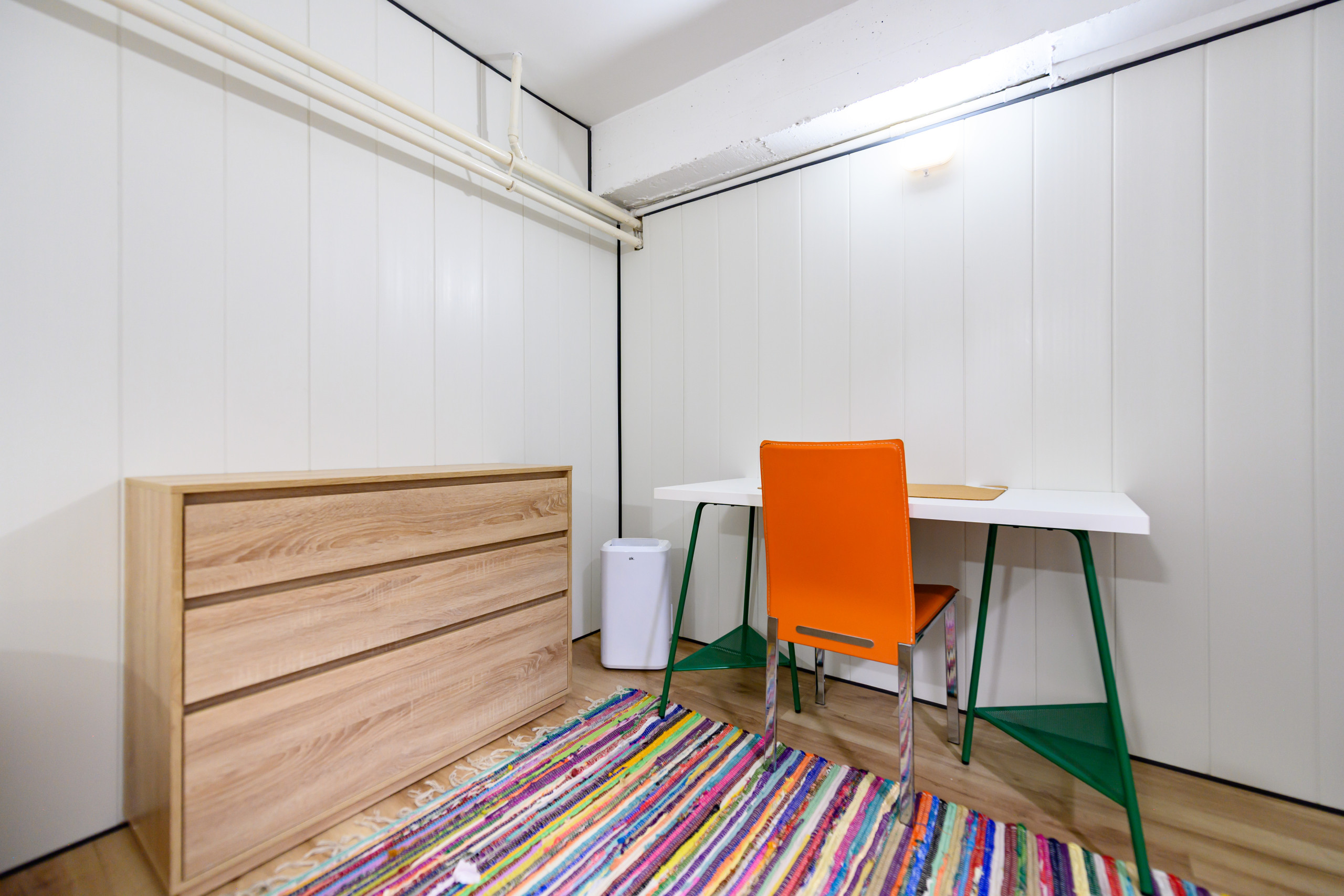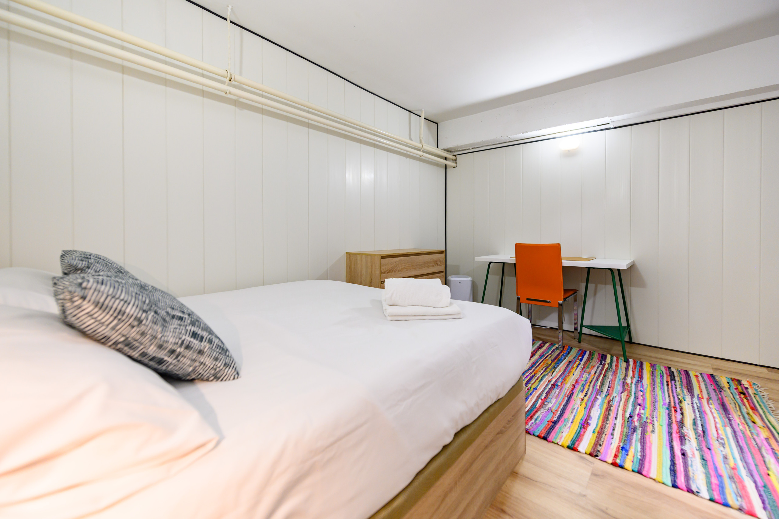 • Cuarto dormitorio con cama doble, escritorio, amplios muebles de almacenamiento y perchero, además de baño privado totalmente equipado.