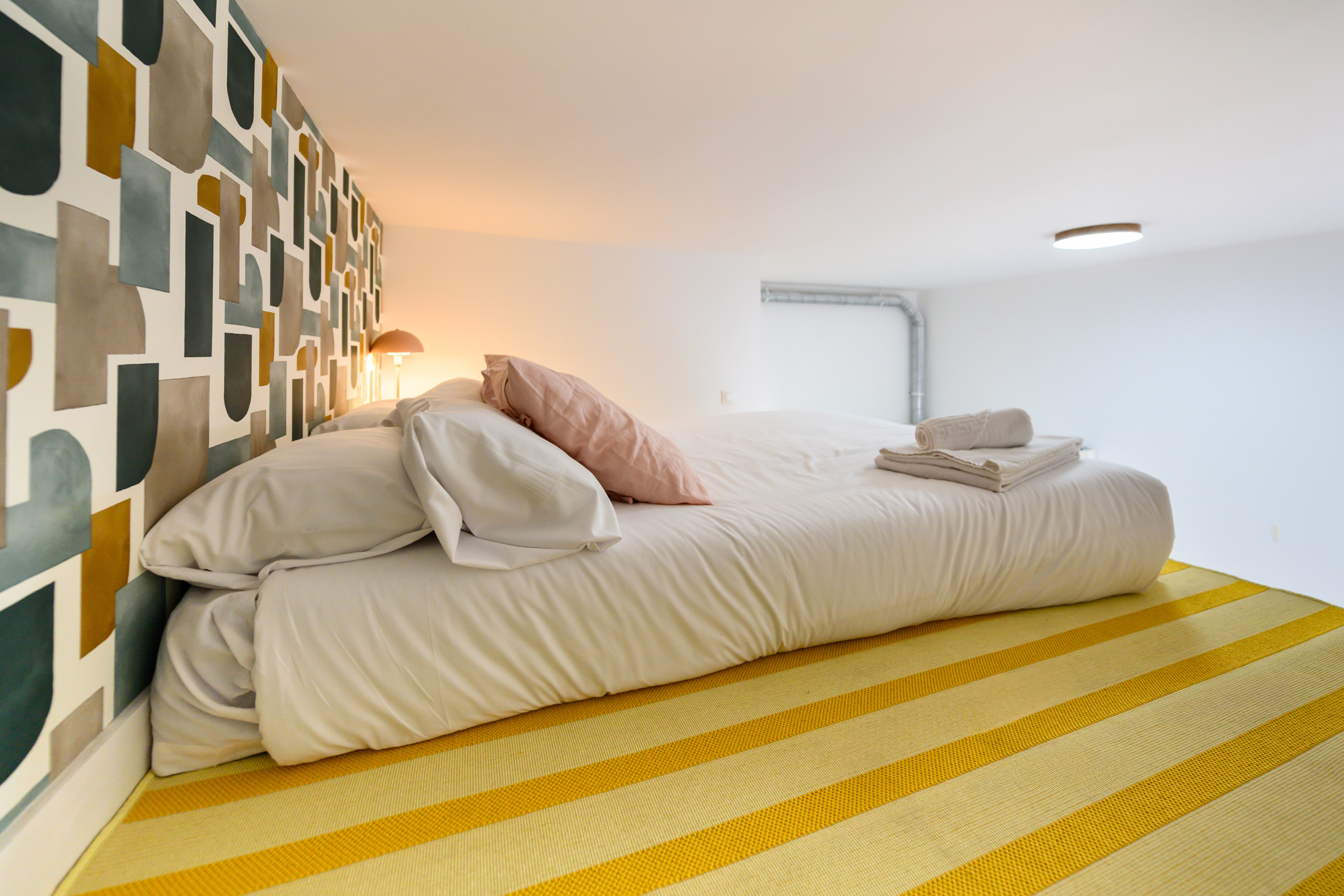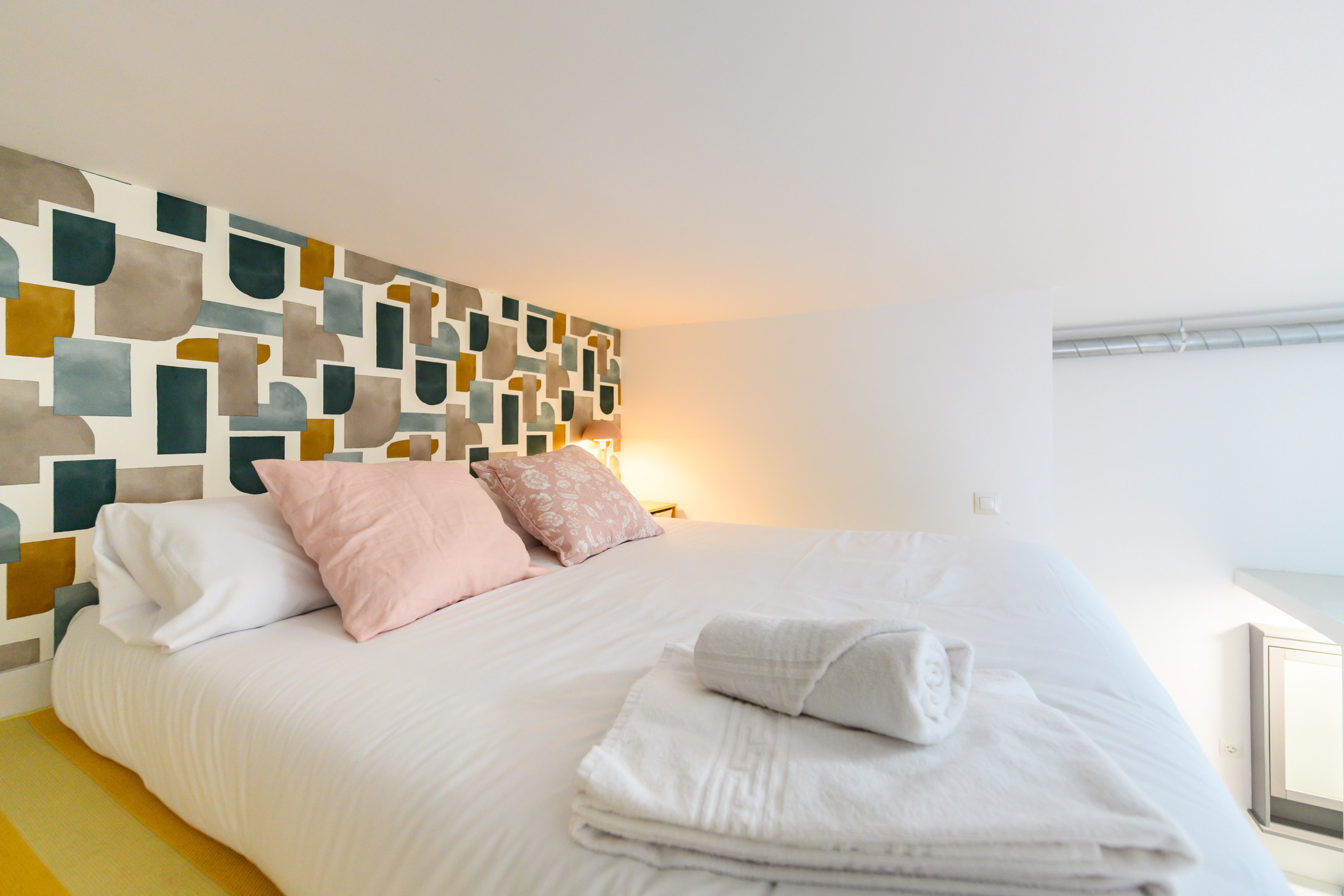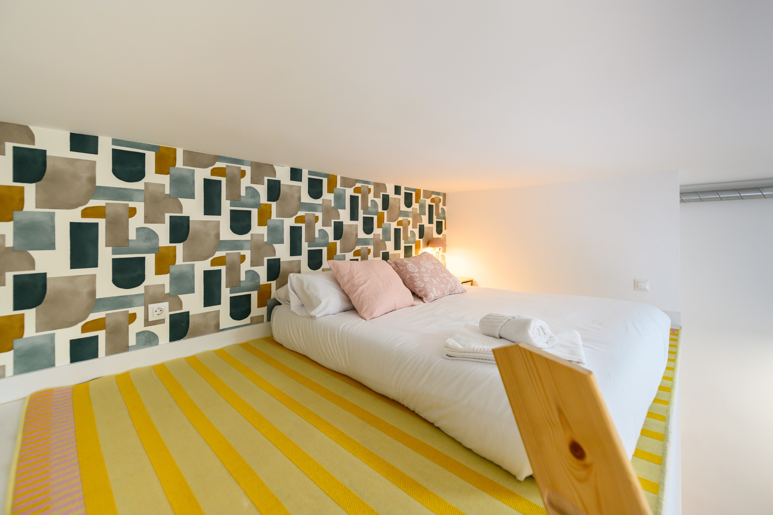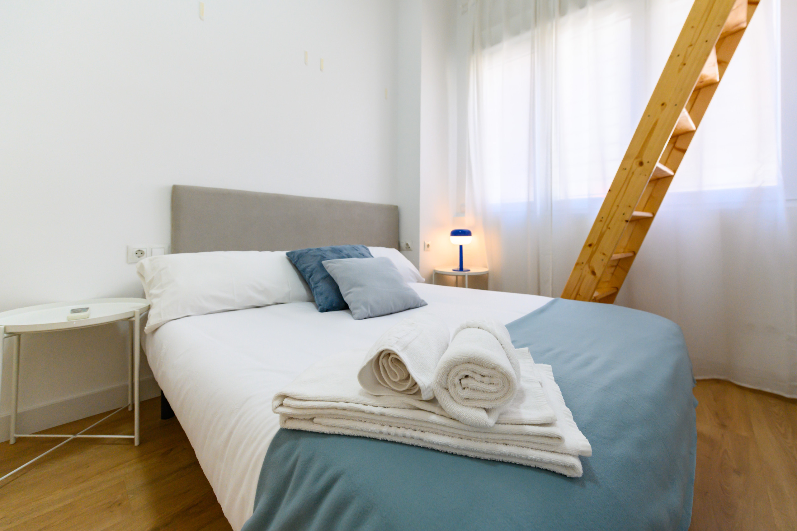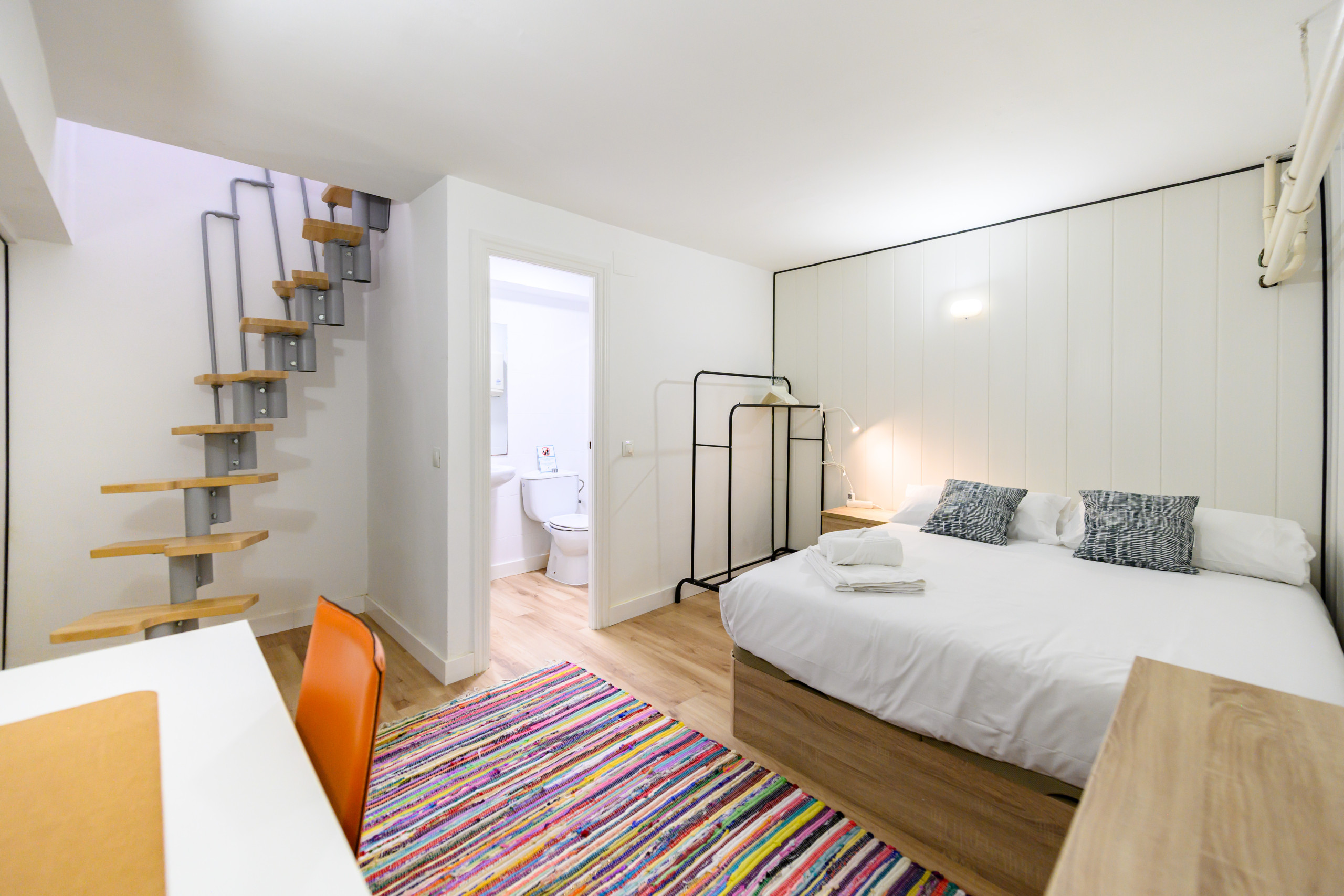 • Dormitorio tipo dúplex: en la parte inferior, cama doble, mesitas de noche, armario y baño privado con ducha. En la parte superior, otra cama doble con mesita de noche y espejo.
