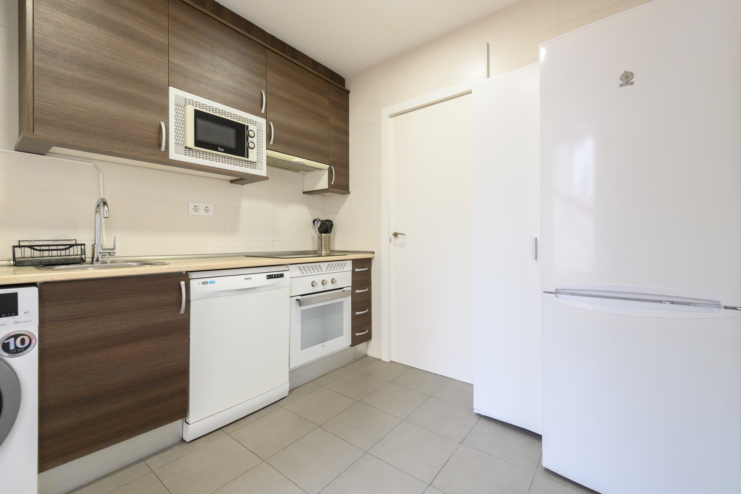 La cocina está totalmente amueblada y equipada con electrodomésticos modernos, incluyendo nevera, lavavajillas, horno y microondas, pensada para quienes valoran la comodidad y la practicidad.