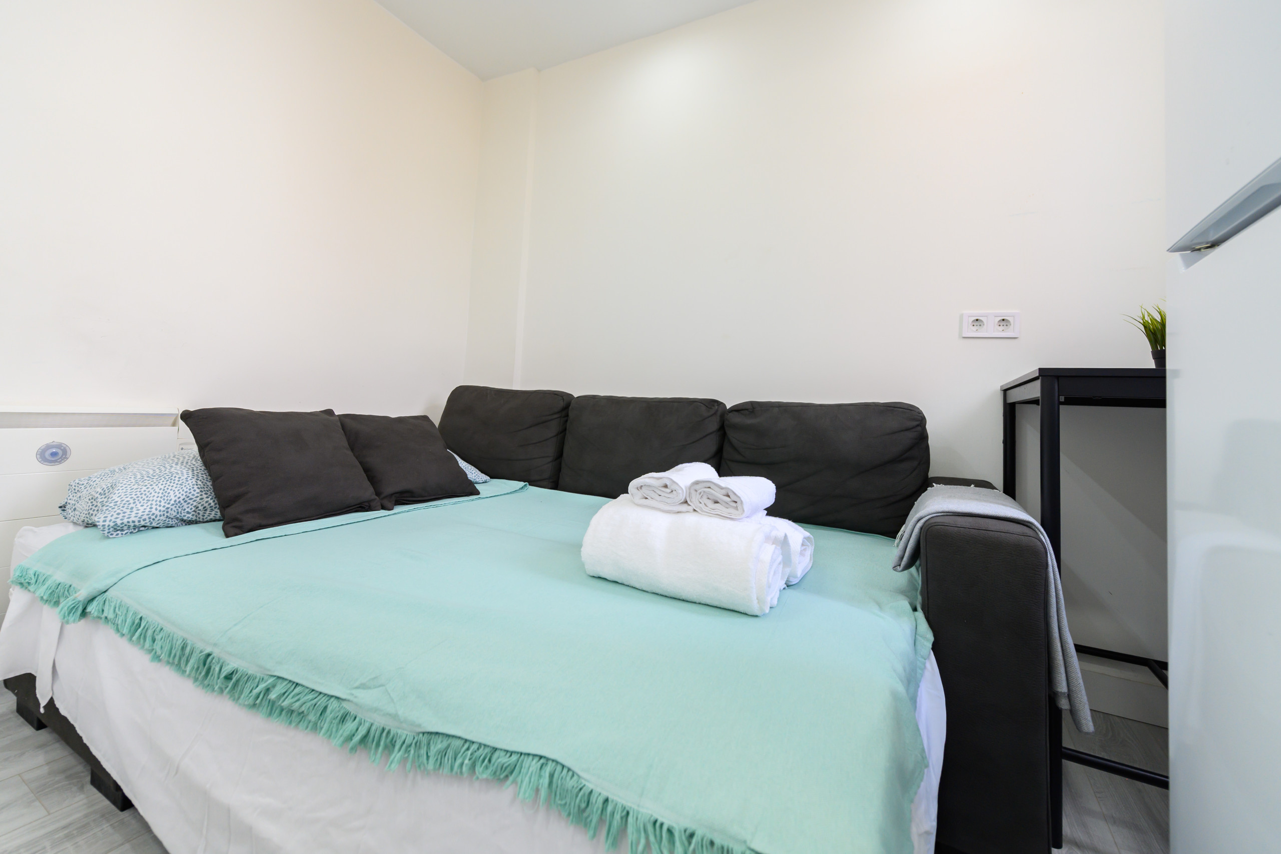 • Zona de estar: Espacio común con sofá convertible en sofá cama doble, mesa, cómoda, televisión, armario empotrado y buena iluminación natural.