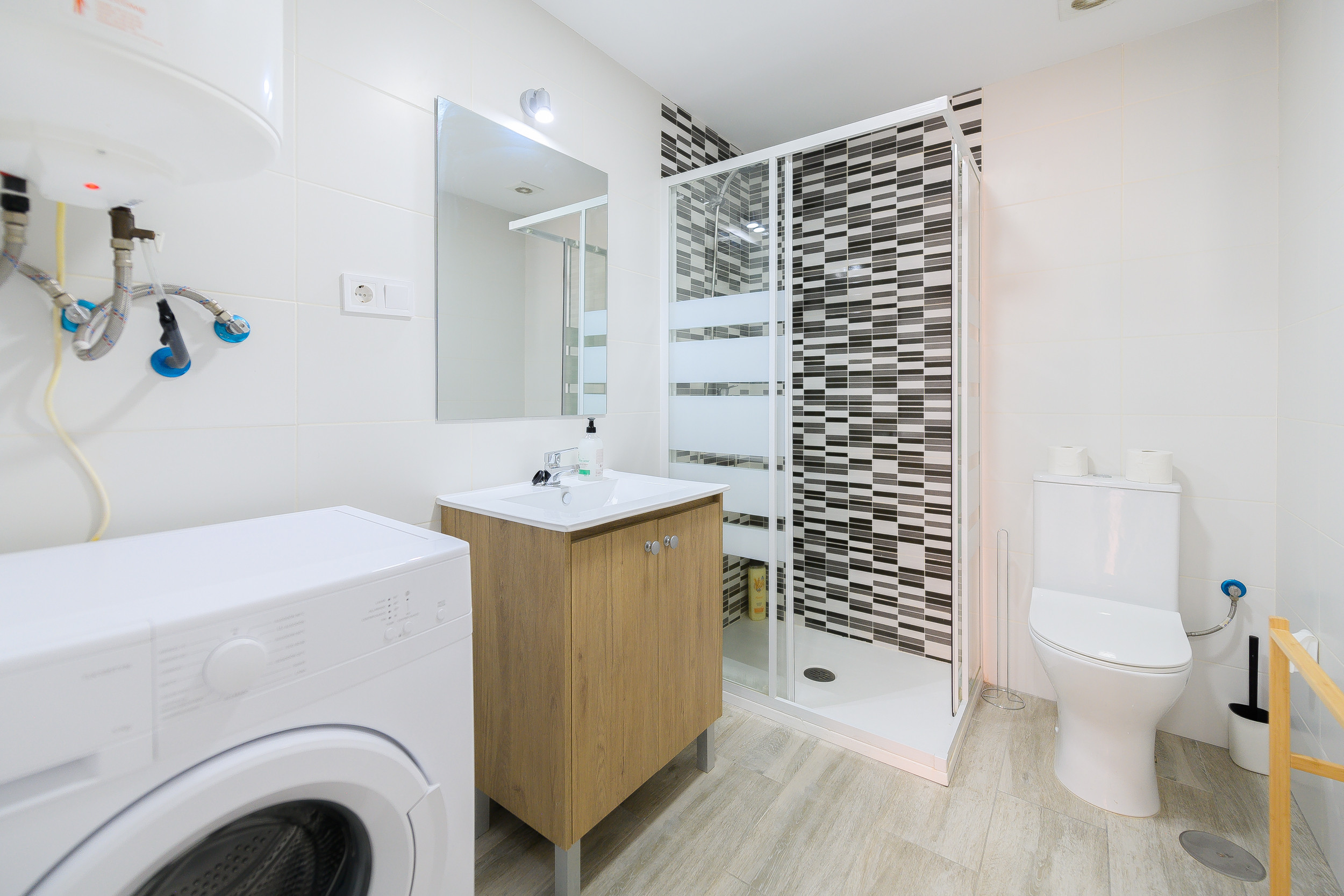 El baño es moderno y cuenta con un amplio plato de ducha con mampara de vidrio, lo que facilita el acceso y mantiene un aspecto limpio y elegante.