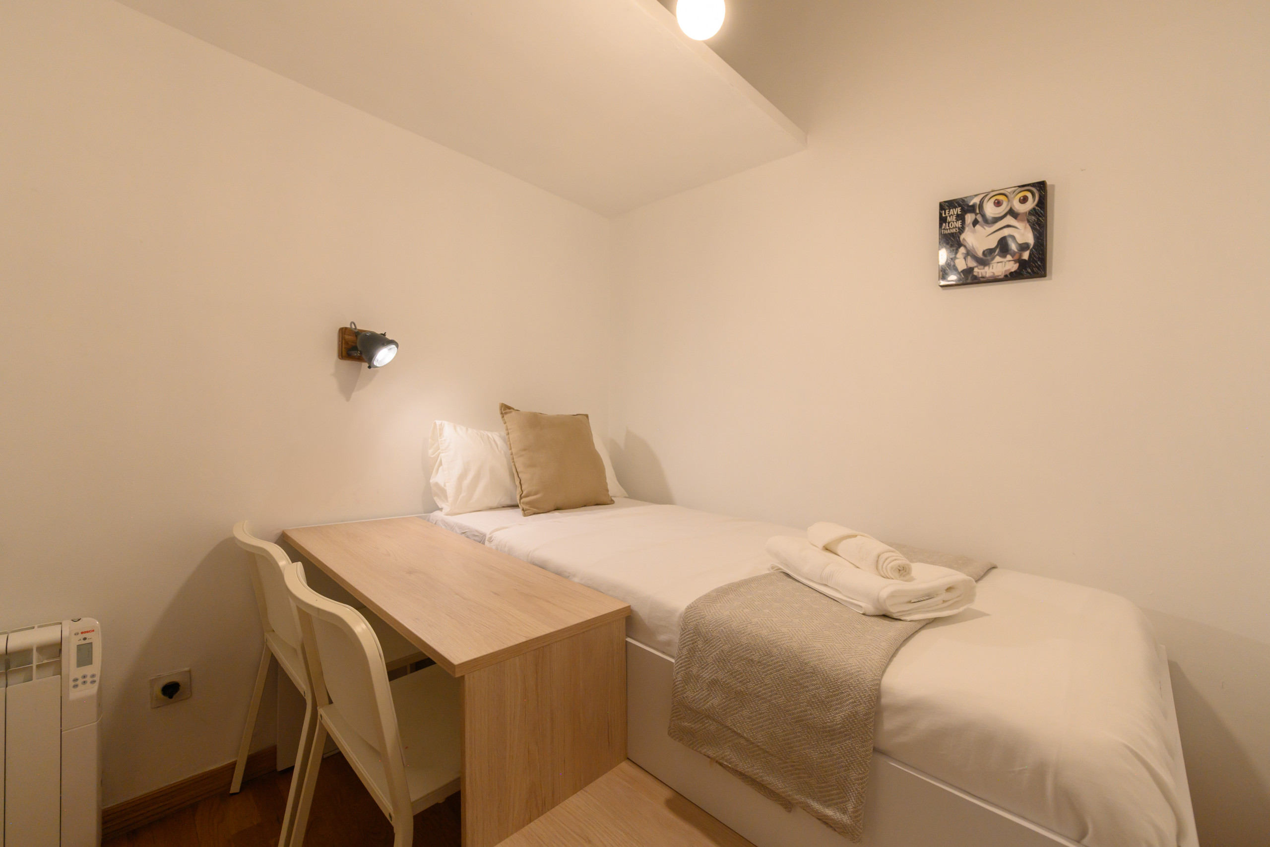 El dormitorio principal dispone de una cómoda cama doble, ideal para el descanso. El segundo dormitorio está diseñado de forma funcional con una cama alta individual y un escritorio, lo que lo convierte en un espacio perfecto tanto para niños como para quienes necesiten una zona de estudio o trabajo.
