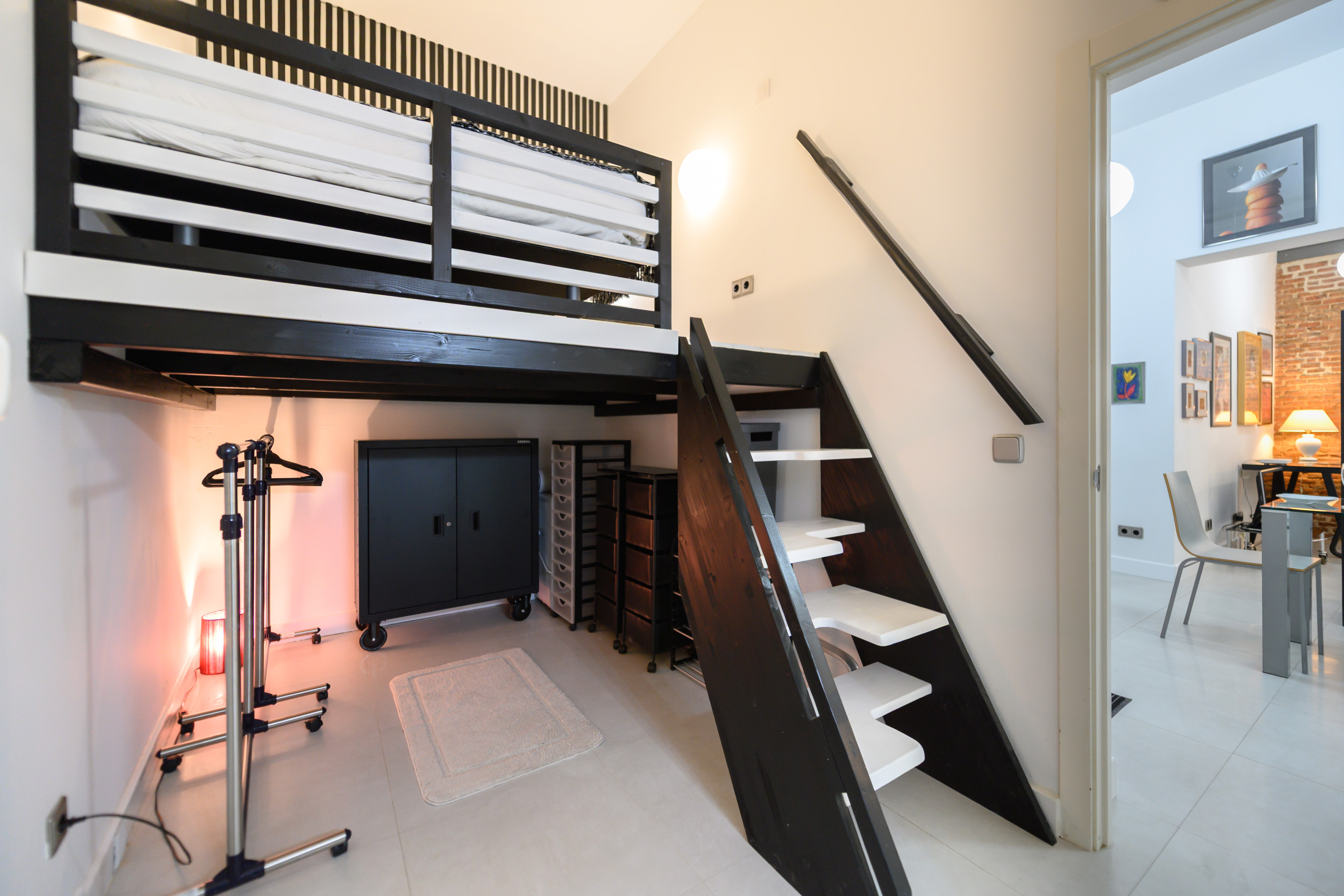- Dormitorio con cama doble, mesita de noche, perchero y amplio espacio de almacenamiento.