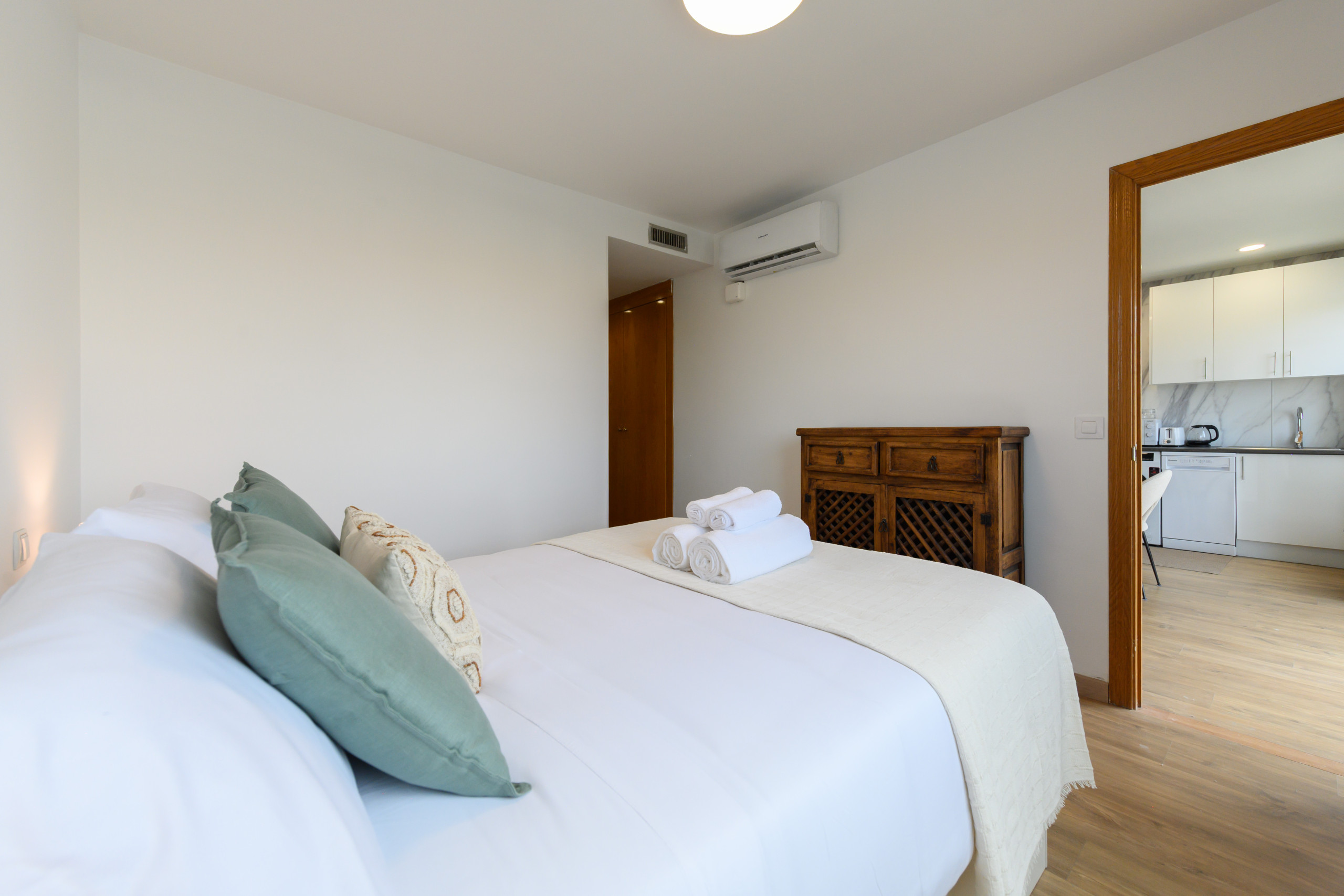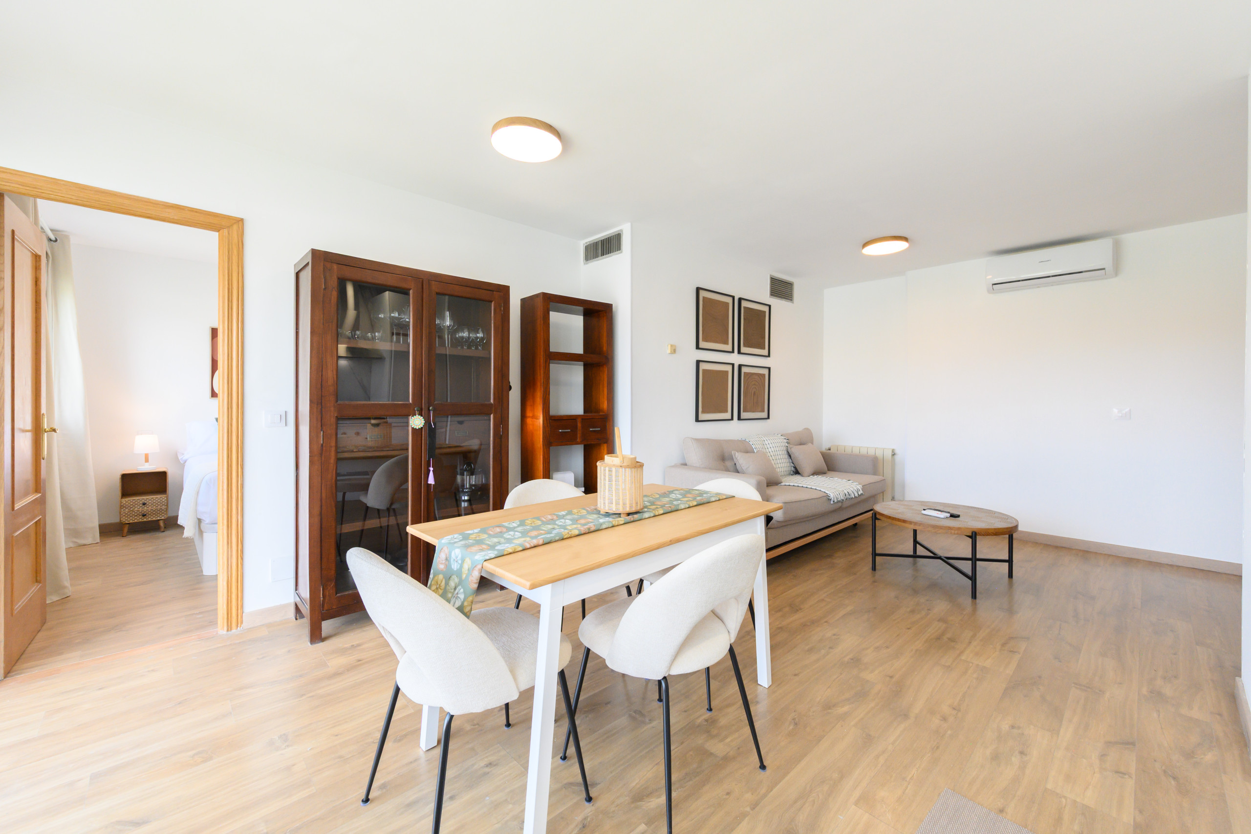 Al entrar, destaca un salón-comedor con grandes ventanales que inundan el espacio de luz natural, creando una atmósfera cálida y confortable. El salón está amueblado con un cómodo sofá cama, ideal para alojar a invitados ocasionales sin renunciar al estilo.
