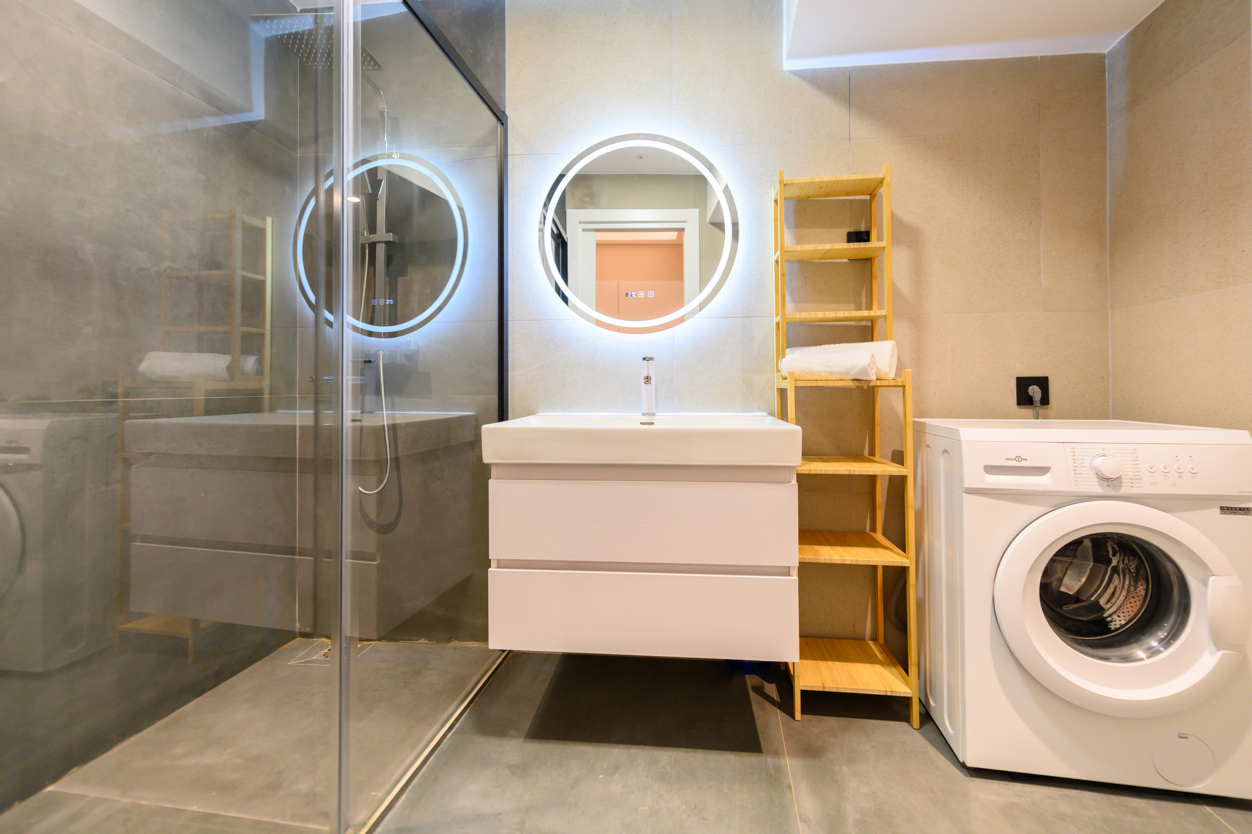 El estudio incluye un baño completo, con plato de ducha, mueble de lavabo y lavadora un diseño actual que aporta comodidad y funcionalidad.