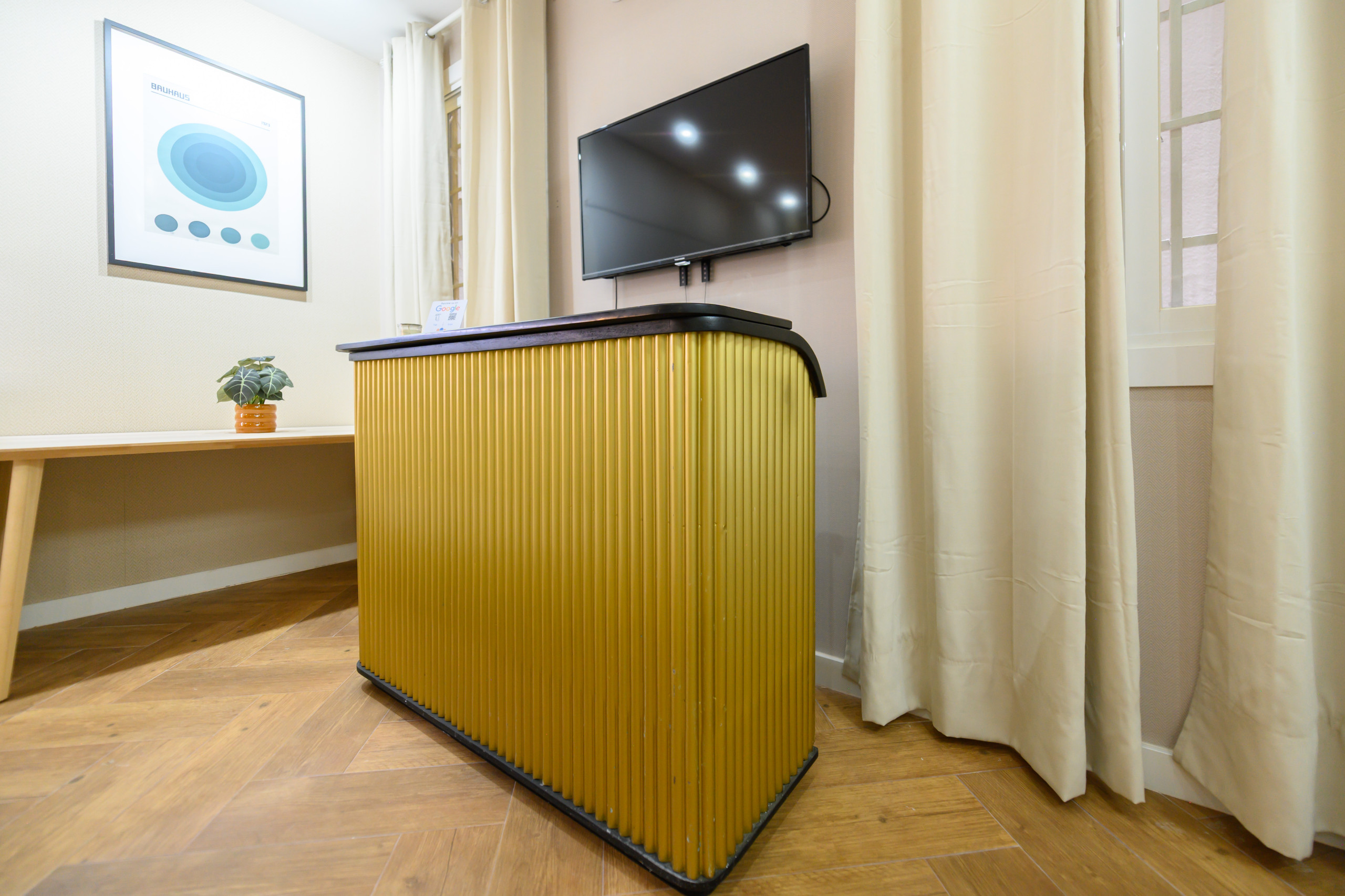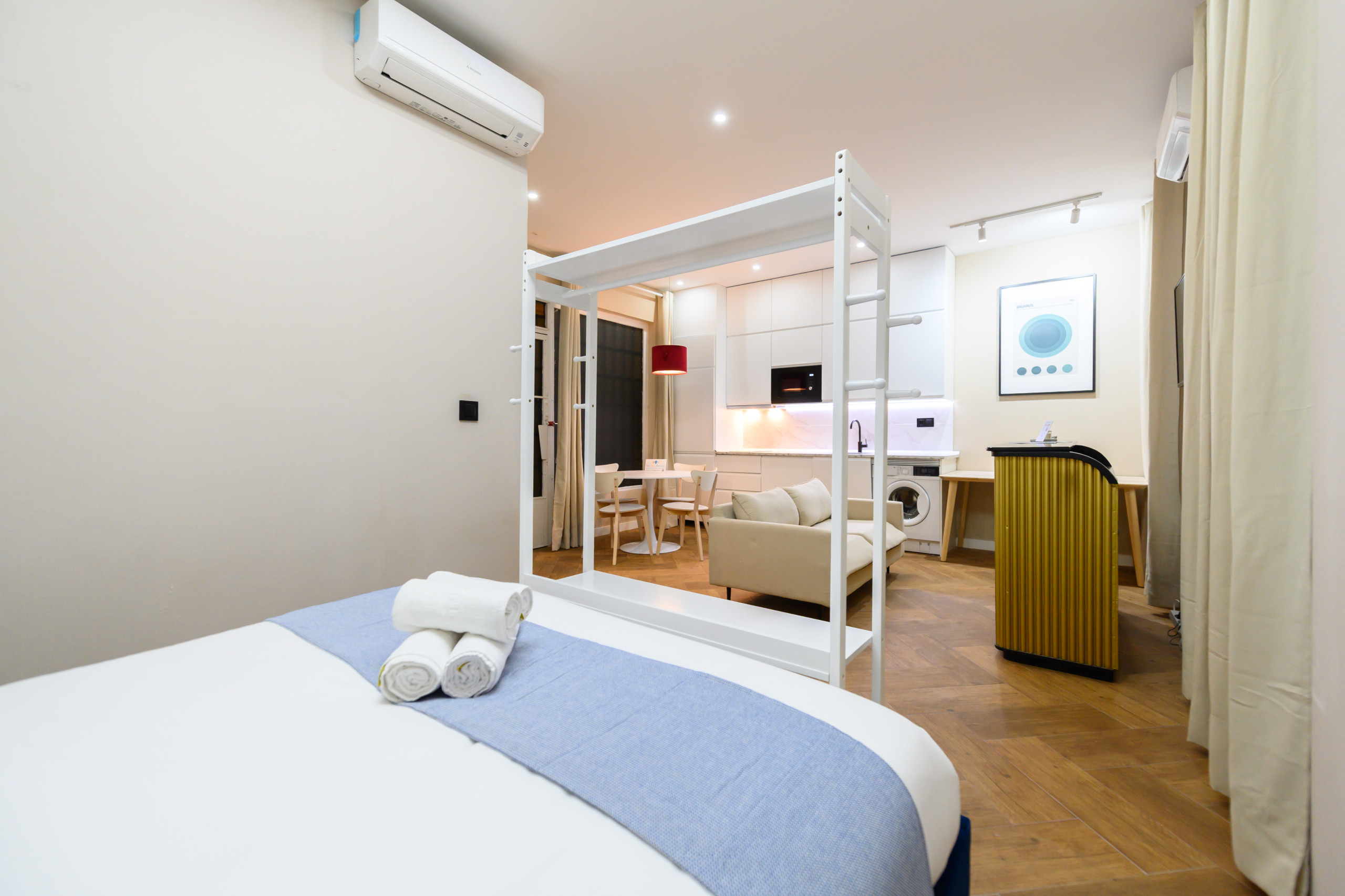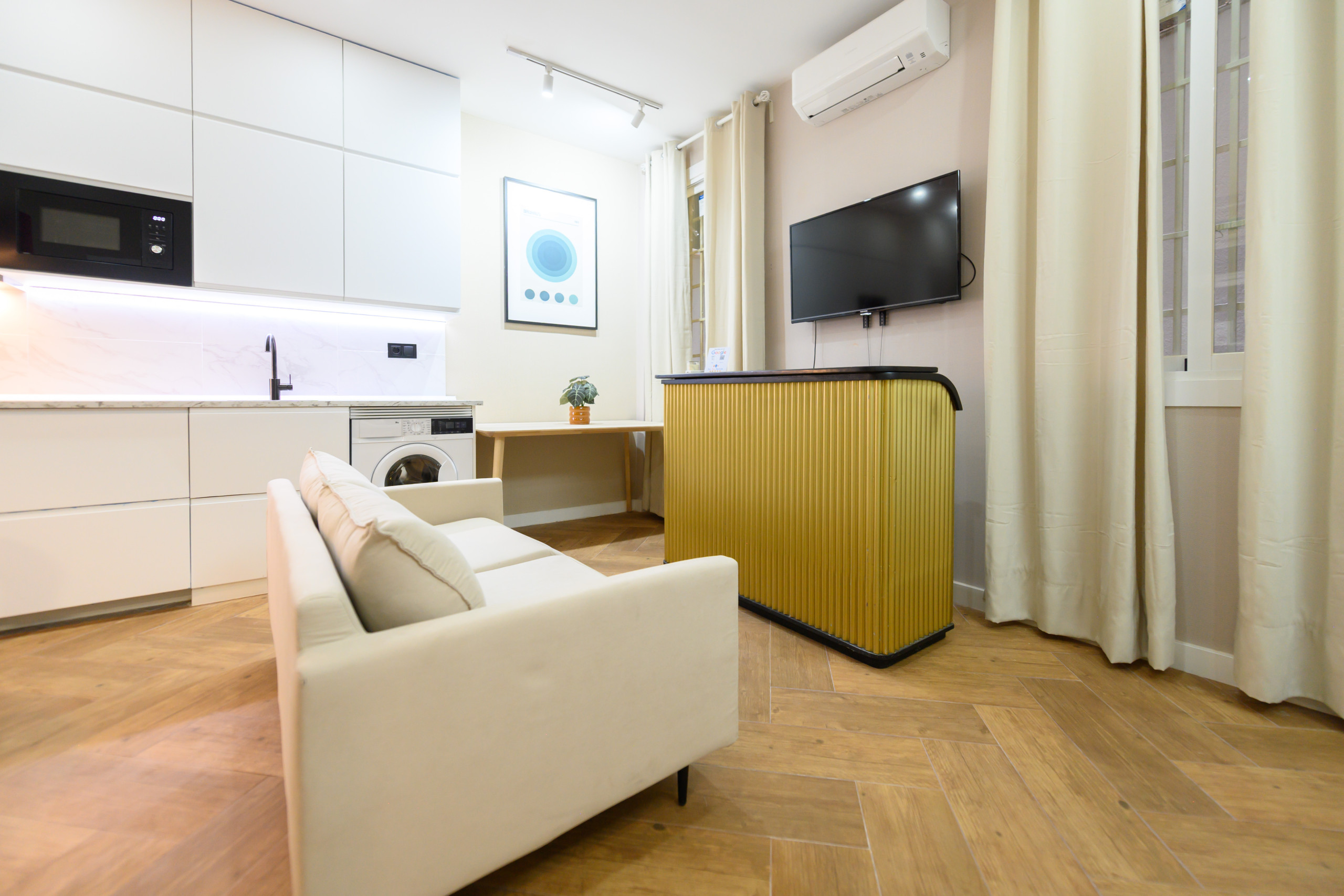 Este acogedor estudio interior de concepto abierto ofrece un espacio moderno, funcional y perfectamente equipado para disfrutar de una estancia cómoda y práctica.