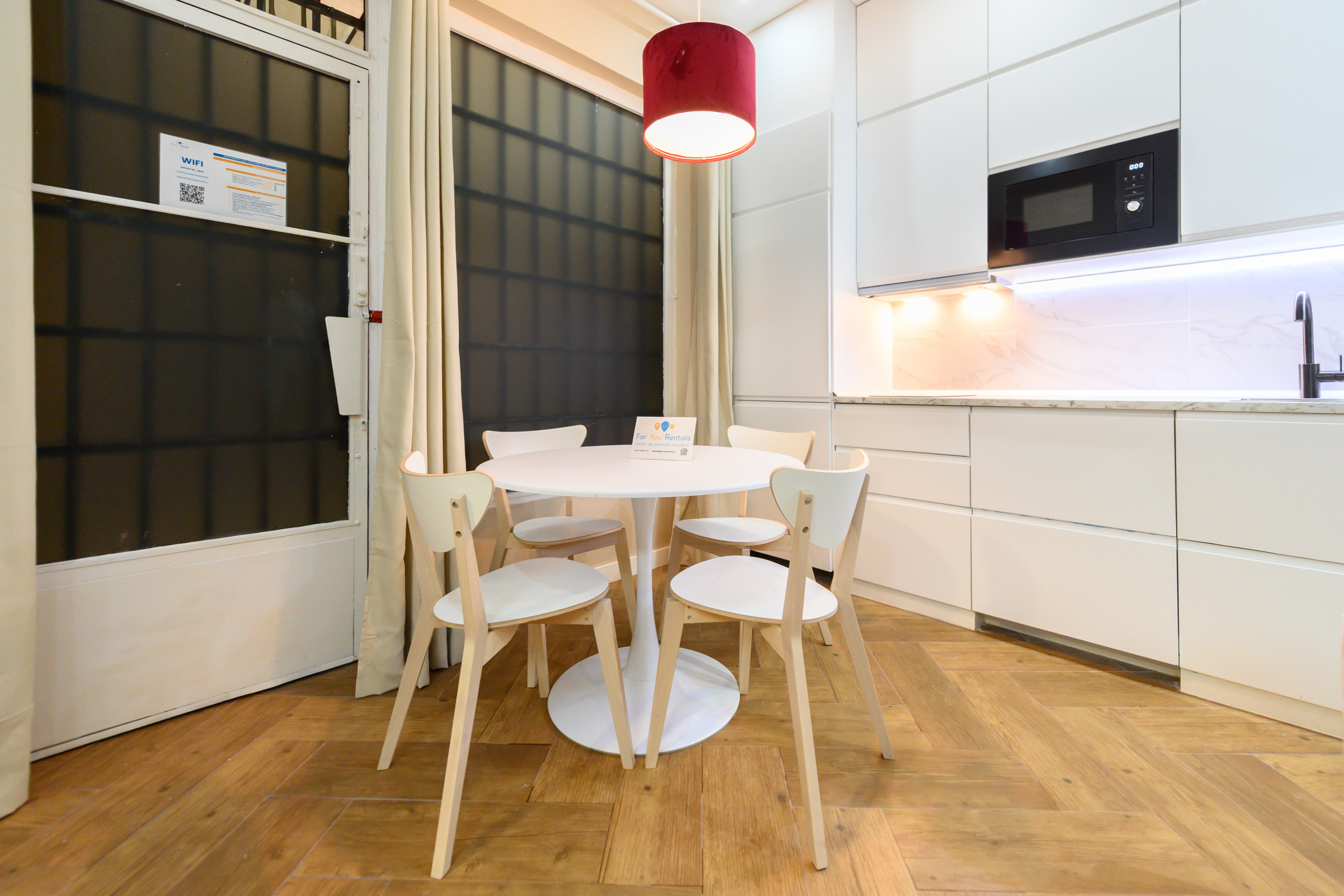 La cocina, totalmente equipada, dispone de lavadora, microondas, lavavajillas, nevera y todos los utensilios necesarios para cocinar como en casa. Junto a ella se encuentra una mesa de comedor, perfecta tanto para las comidas como para trabajar o estudiar.