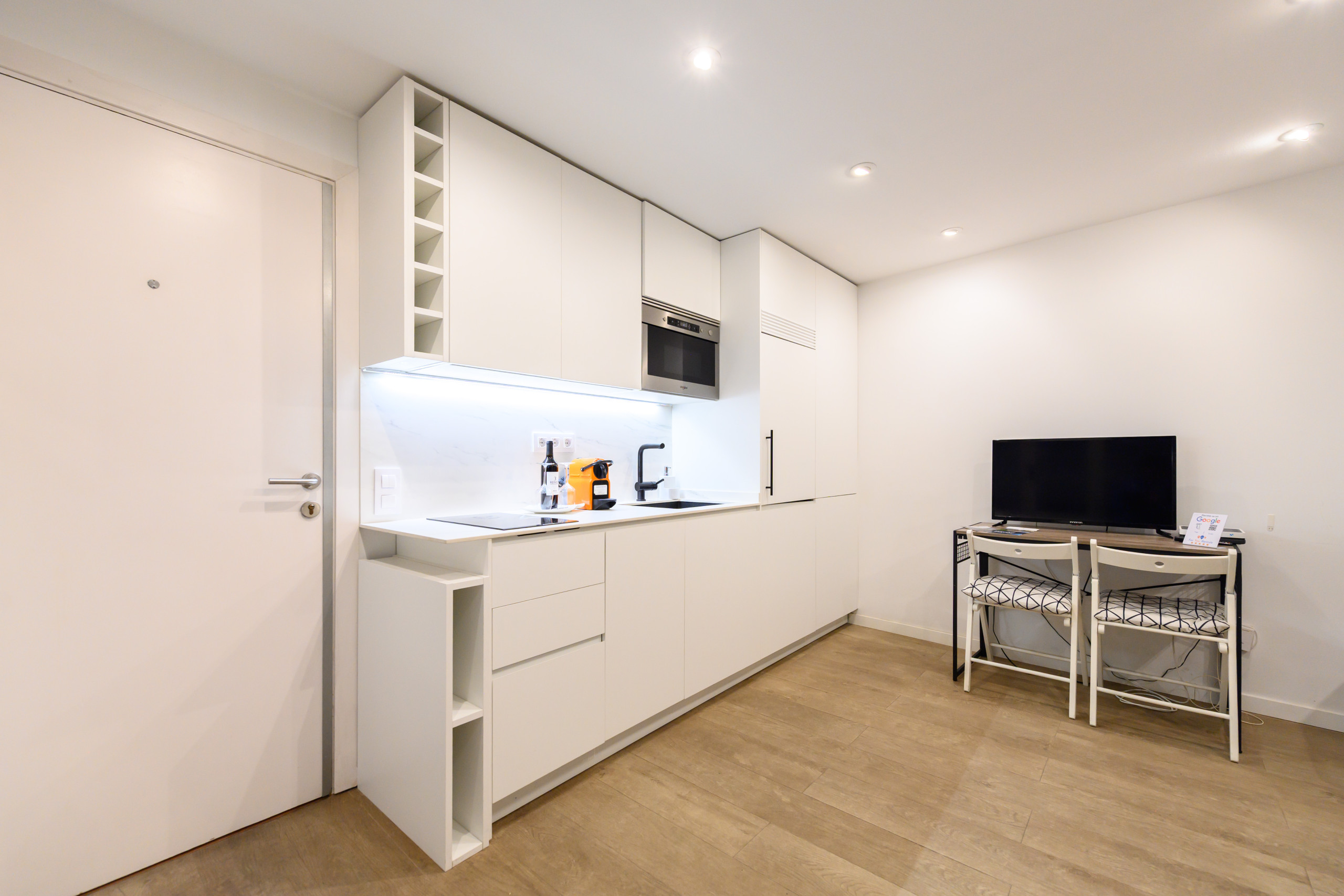 Sofá cama doble, cajones para almacenamiento, armario, escritorio, tv, aire acondicionado, secador de pelo. Baño completo con WC, ducha, espejo y espacio de almacenamiento. Cocina totalmente equipada con microondas, cafetera, lavadora, lavavajillas y frigorífico. El edificio dispone de ascensor.