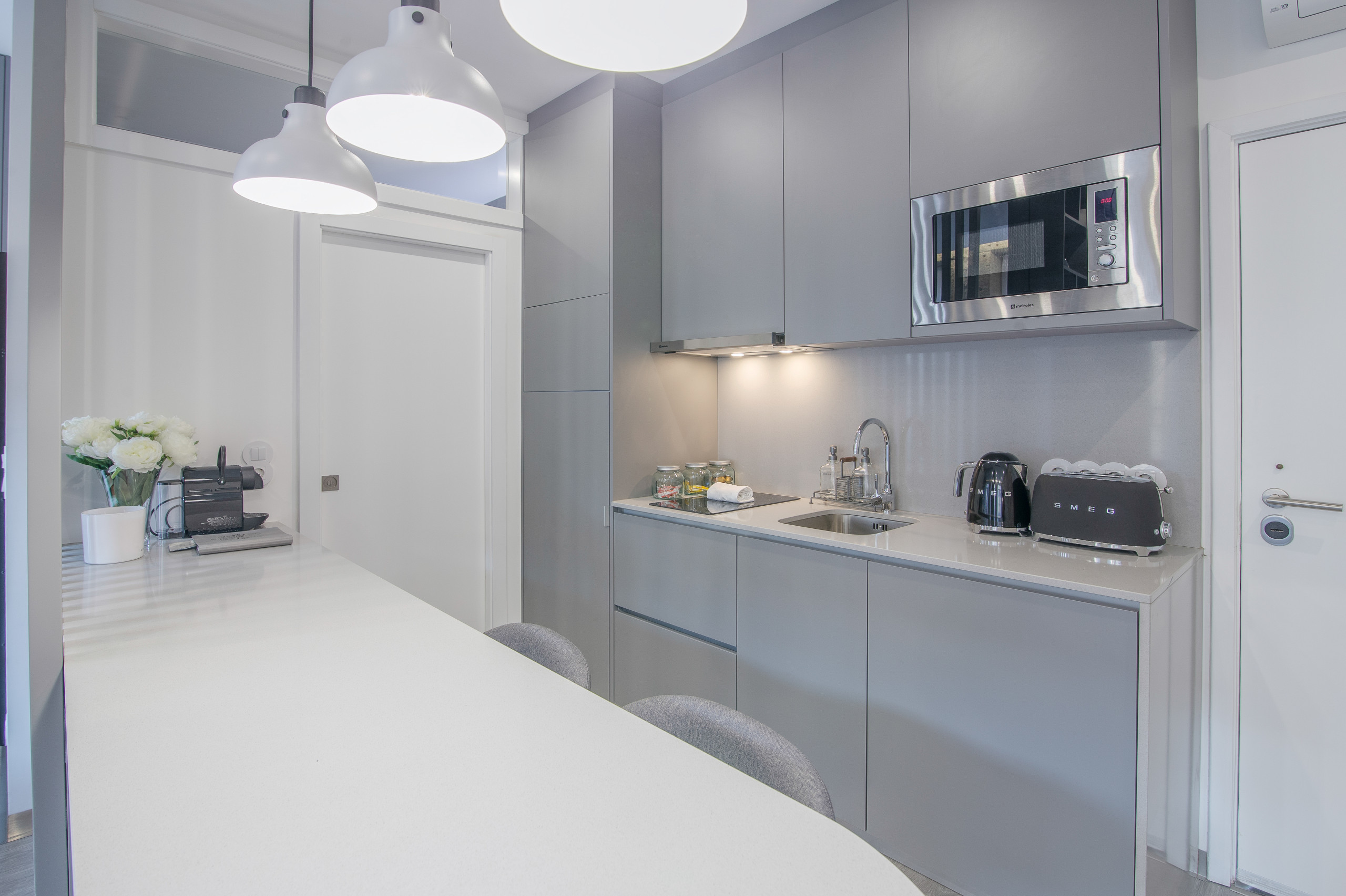 El apartamento cuenta con una cocina de estilo americano moderno completamente equipada con electrodomésticos esenciales, incluyendo una placa de vitrocerámica, frigorífico, congelador, microondas, cafetera, tostadora, hervidor y un juego completo de utensilios de cocina y vajilla. Las parejas pueden preparar fácilmente comidas románticas o disfrutar de desayunos rápidos antes de explorar la ciudad.