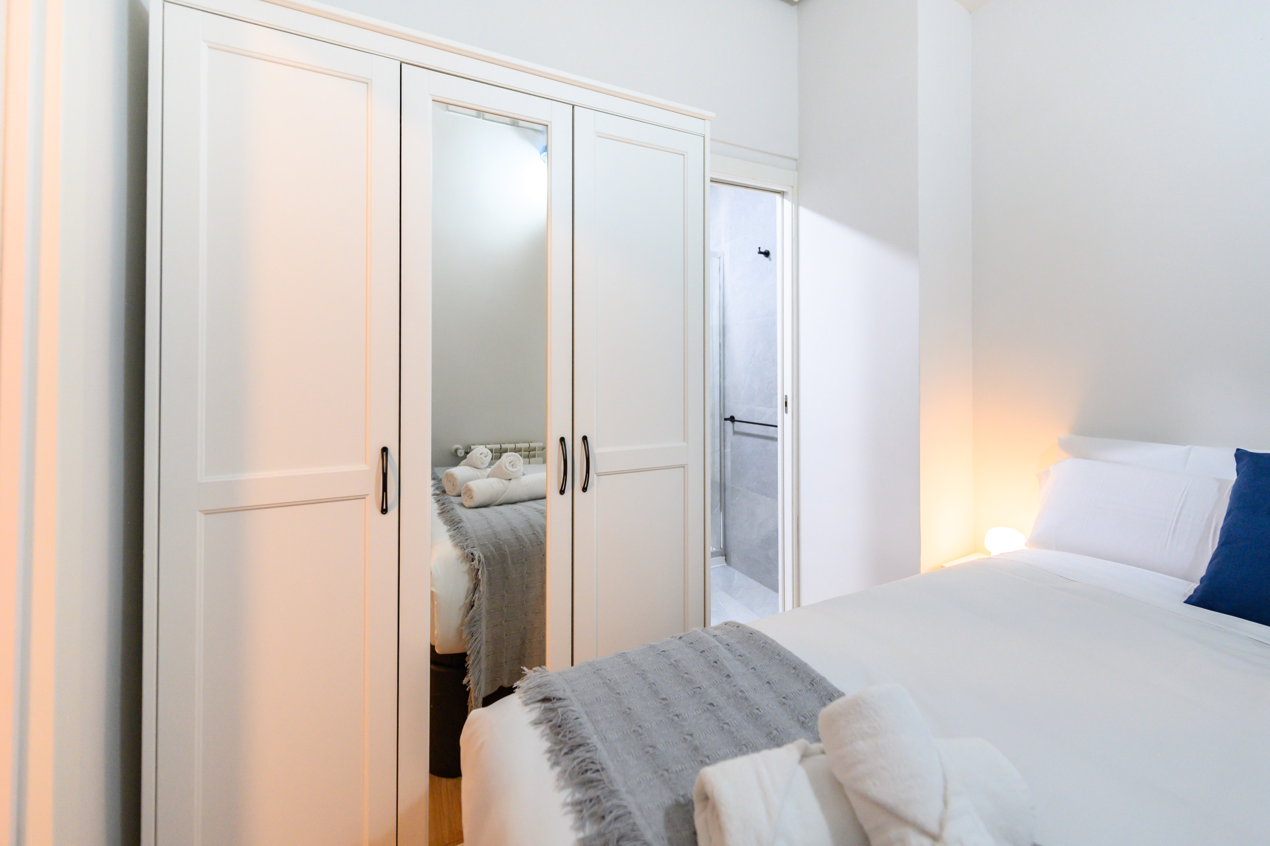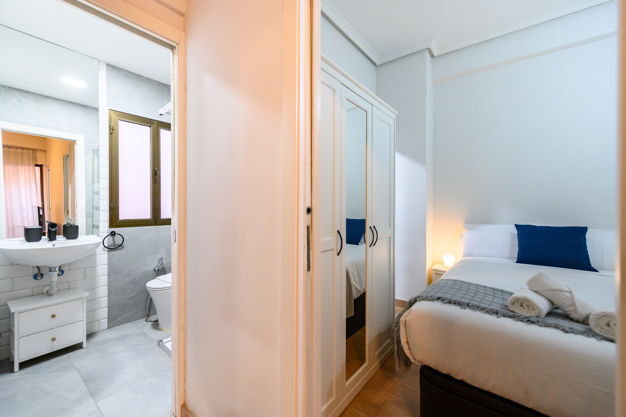 • Une chambre avec un lit double, miroir, armoire, tables de chevet et salle de bain attenante (avec WC, douche et miroir).