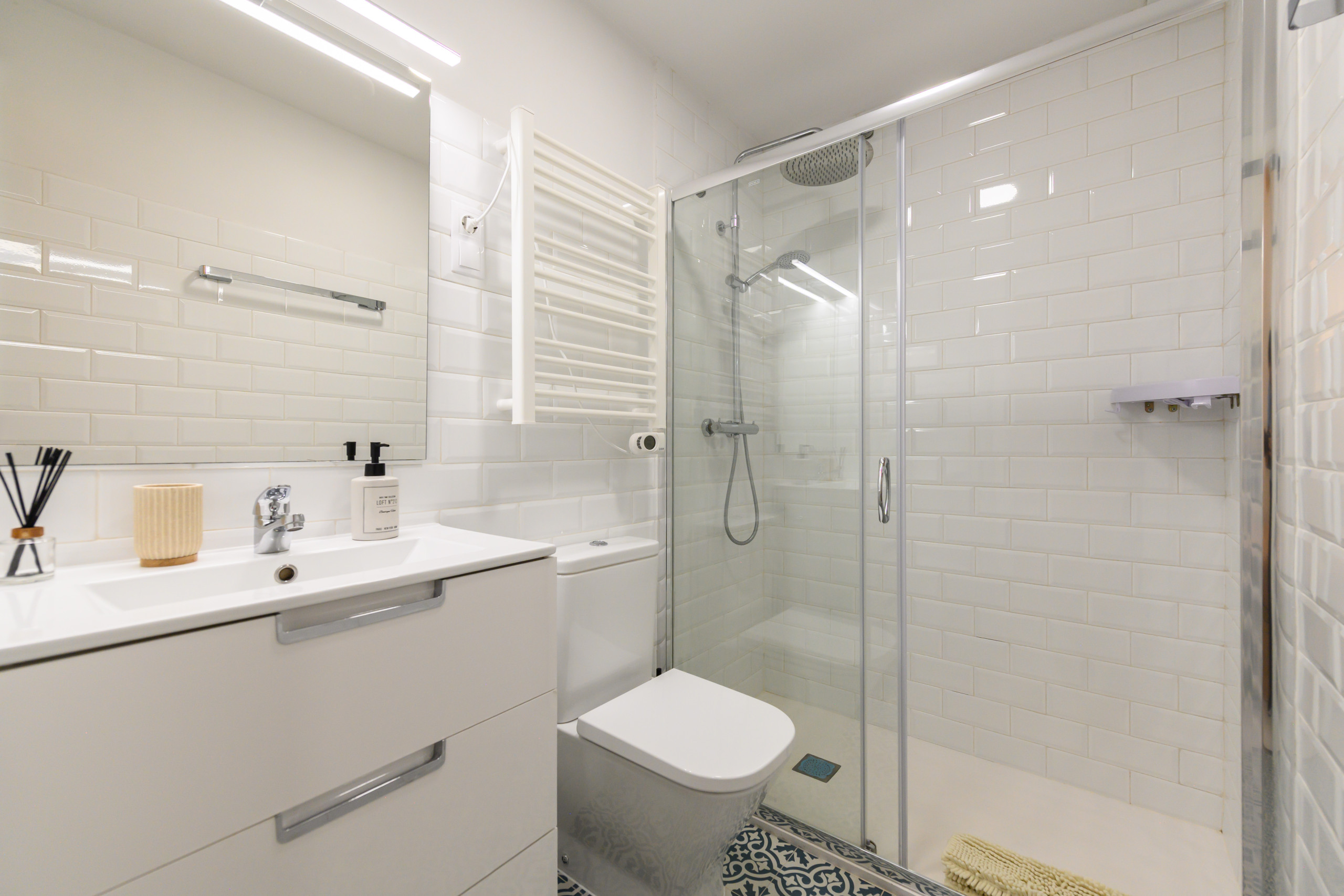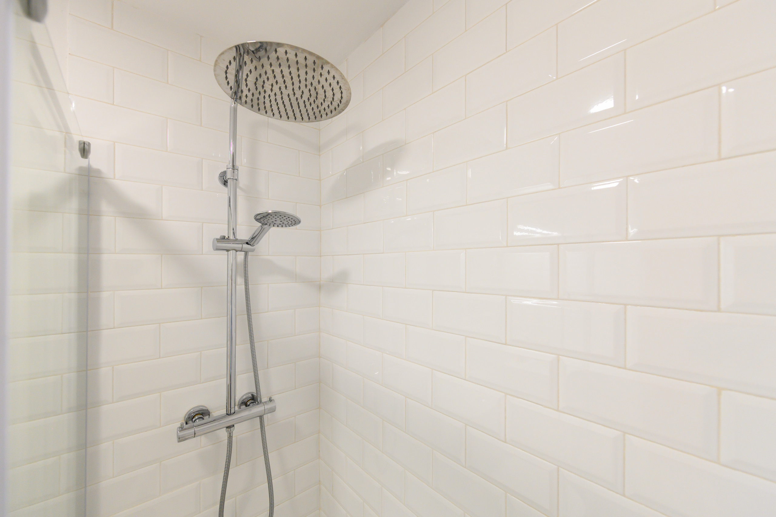 • Une salle de bain complète avec douche et miroir.