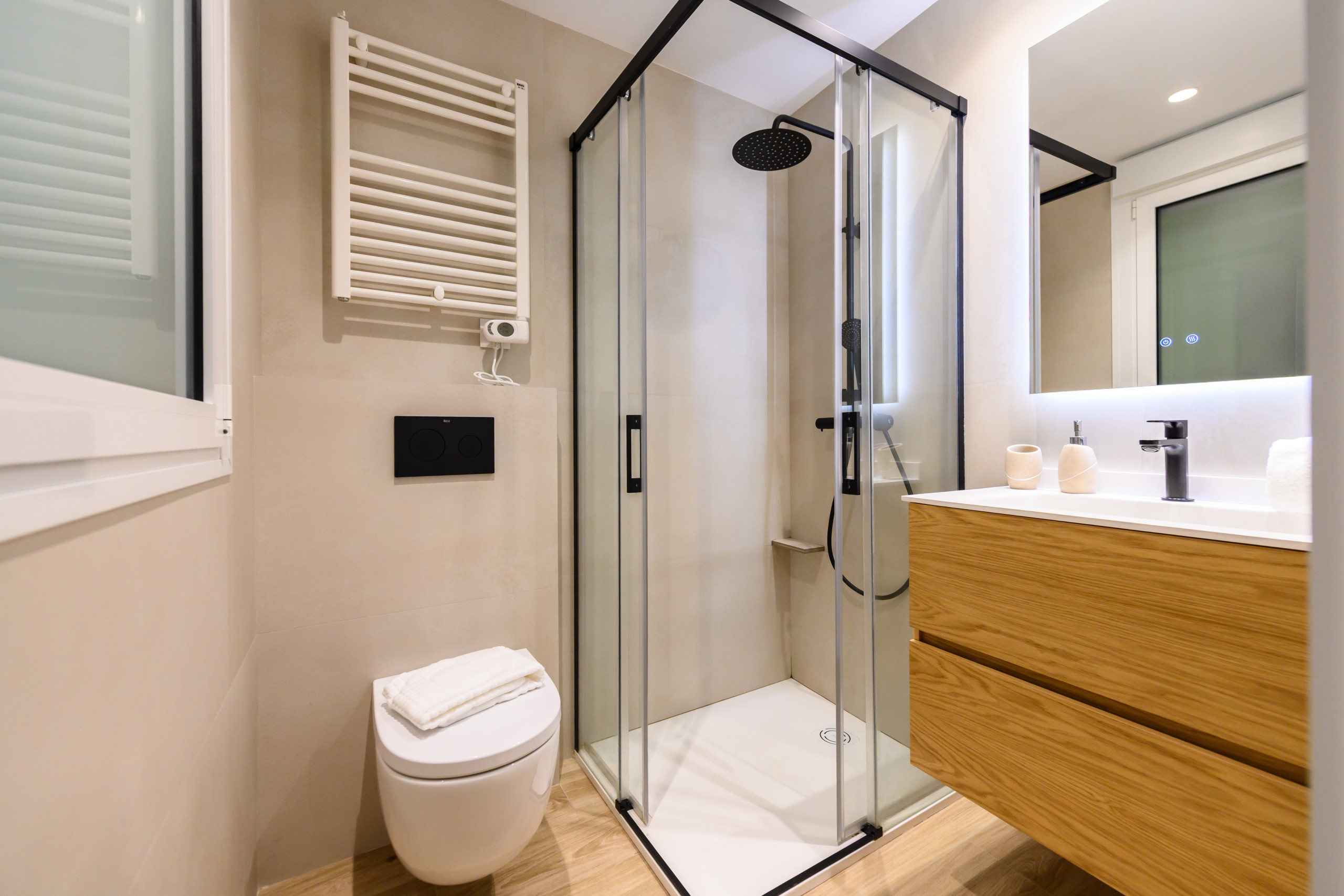 • Une salle de bain complète avec WC, grande douche, miroir et rangements.