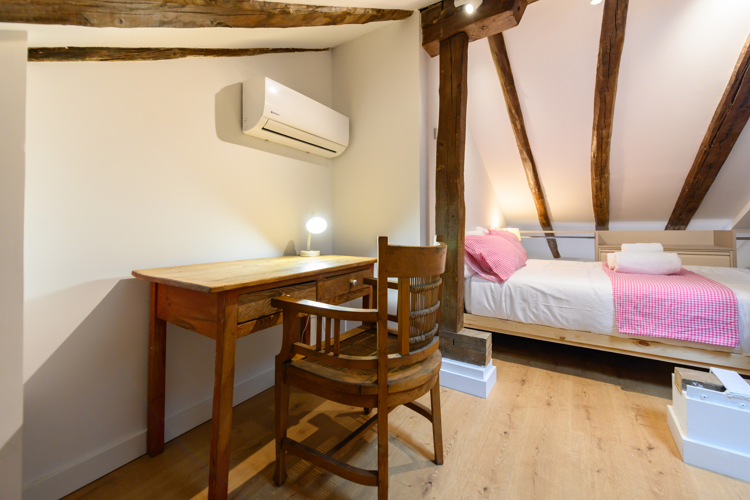 • Une chambre à l'étage avec un lit double, un bureau idéal pour le télétravail ou les études, de nombreuses commodes, un portant, un miroir et la climatisation.