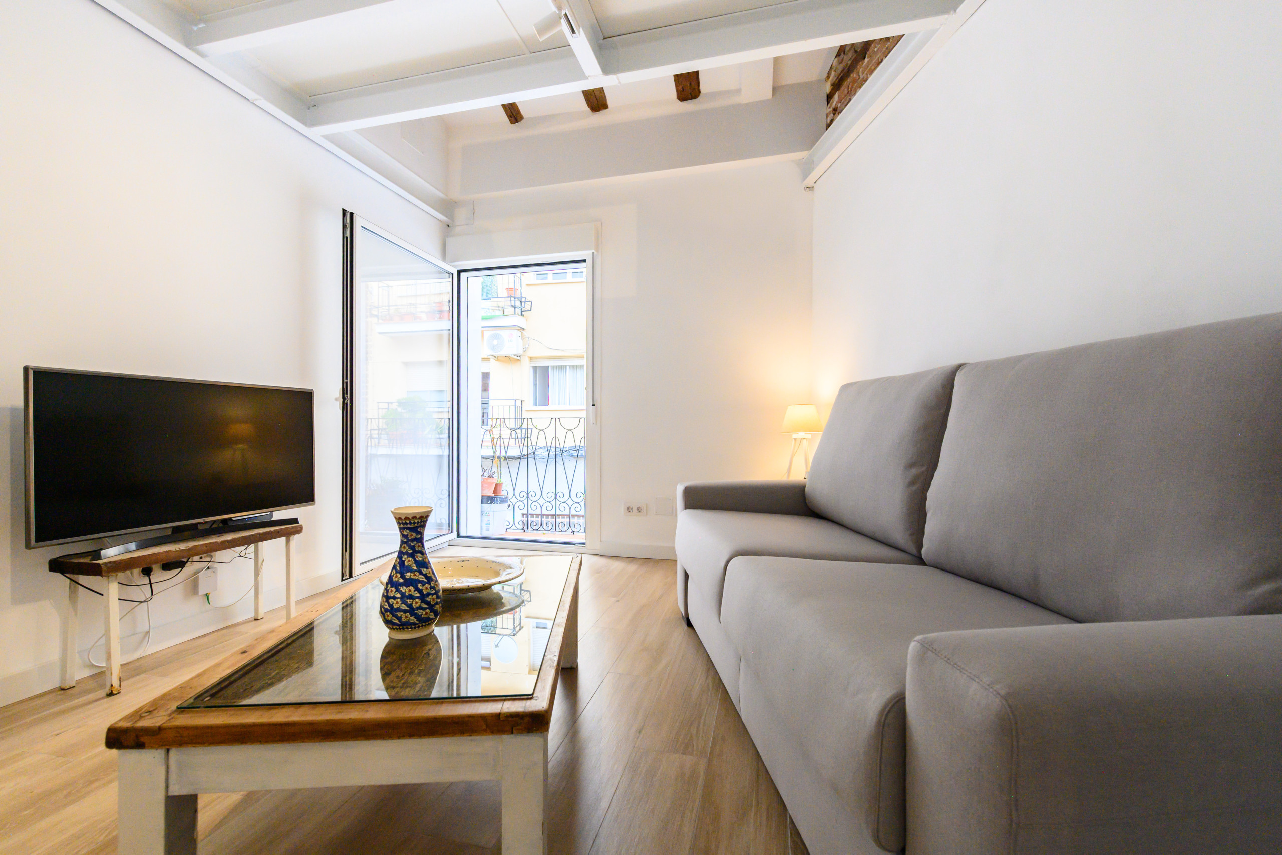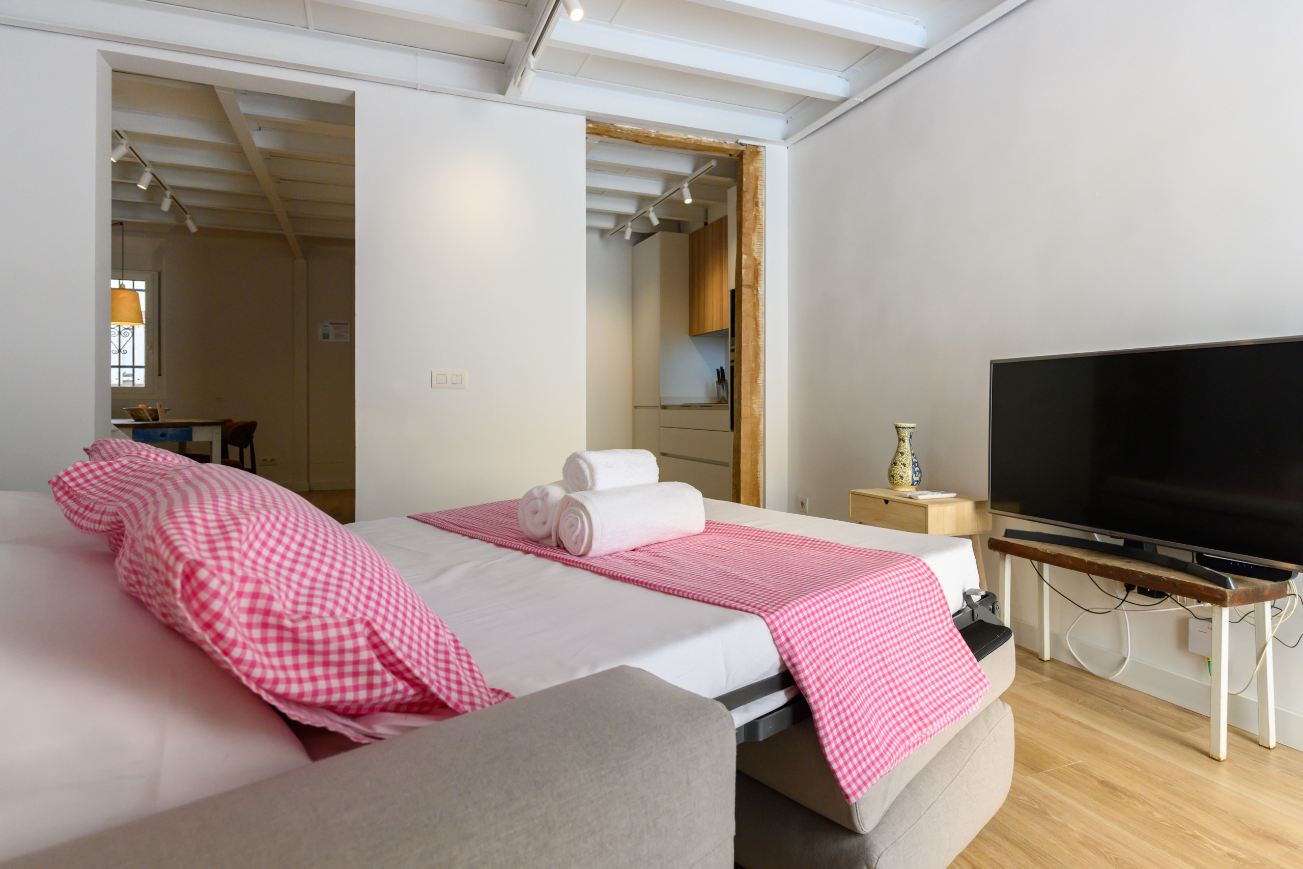 • Un salon lumineux avec un canapé convertible en lit double, une télévision et une table.