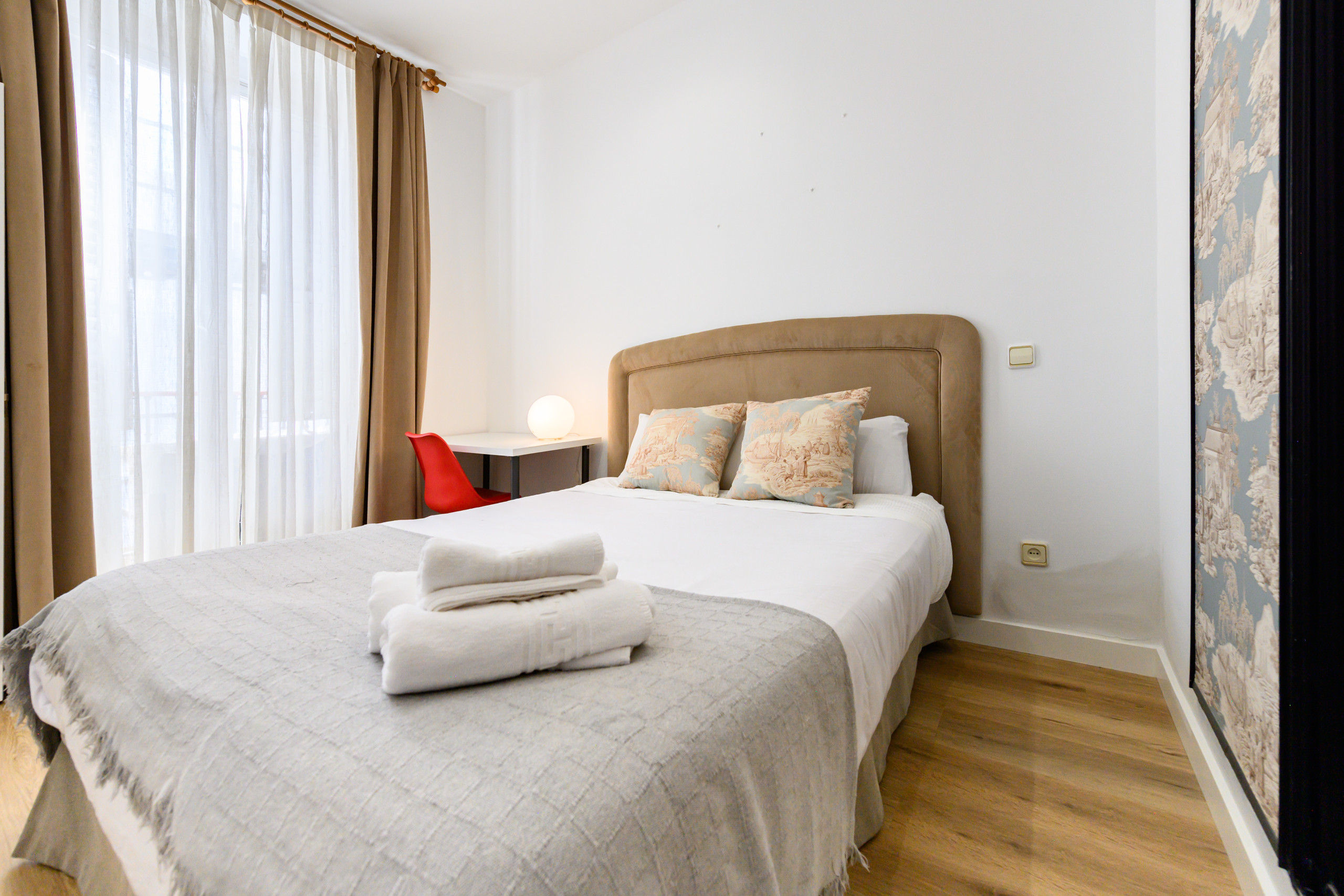 • Chambre 2 : Lit double, armoire intégrée, miroir, climatisation, bureau et grande fenêtre offrant une excellente luminosité naturelle.