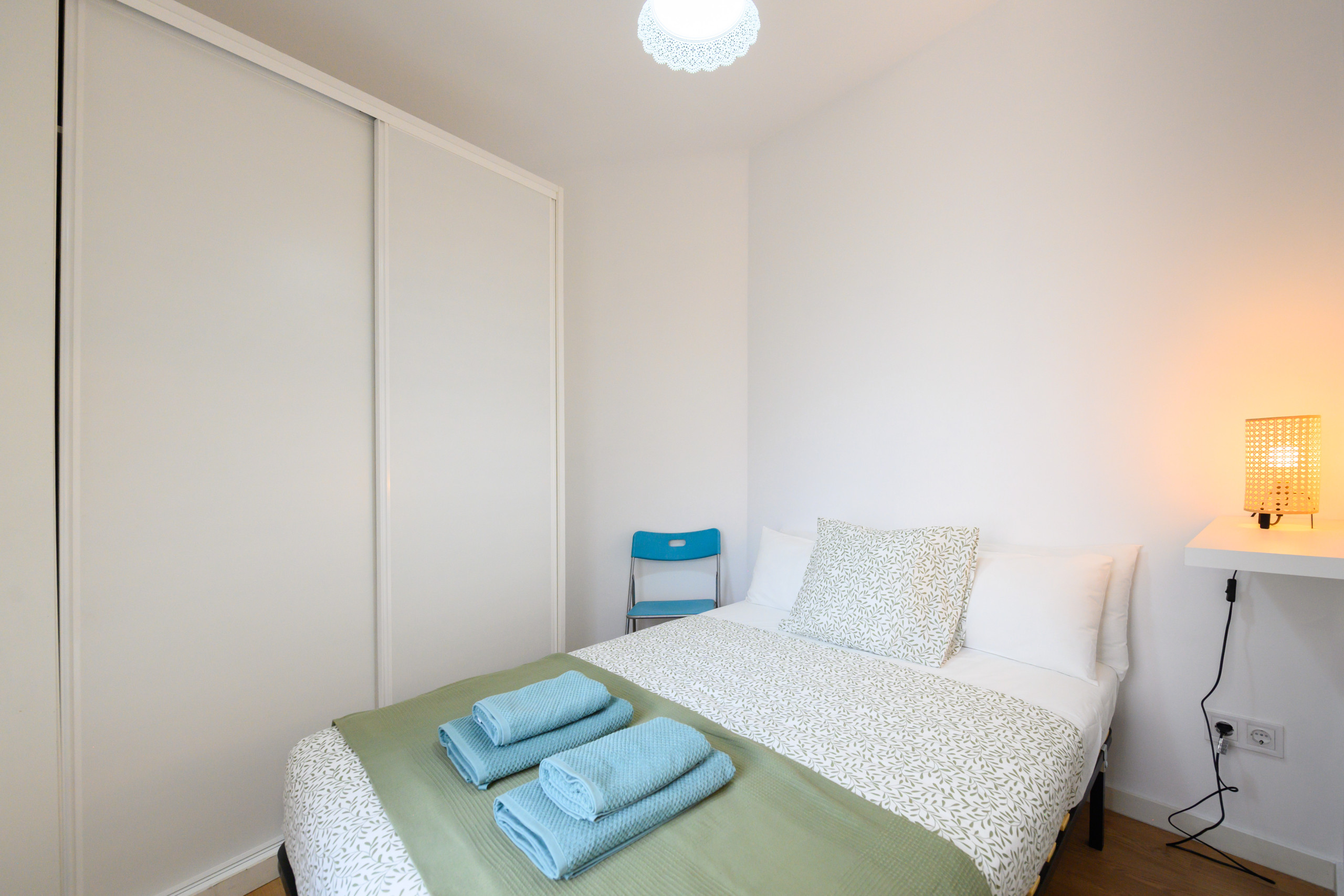 La chambre principale offre un lit matrimonial confortable et un placard pratique avec un grand espace de rangement.