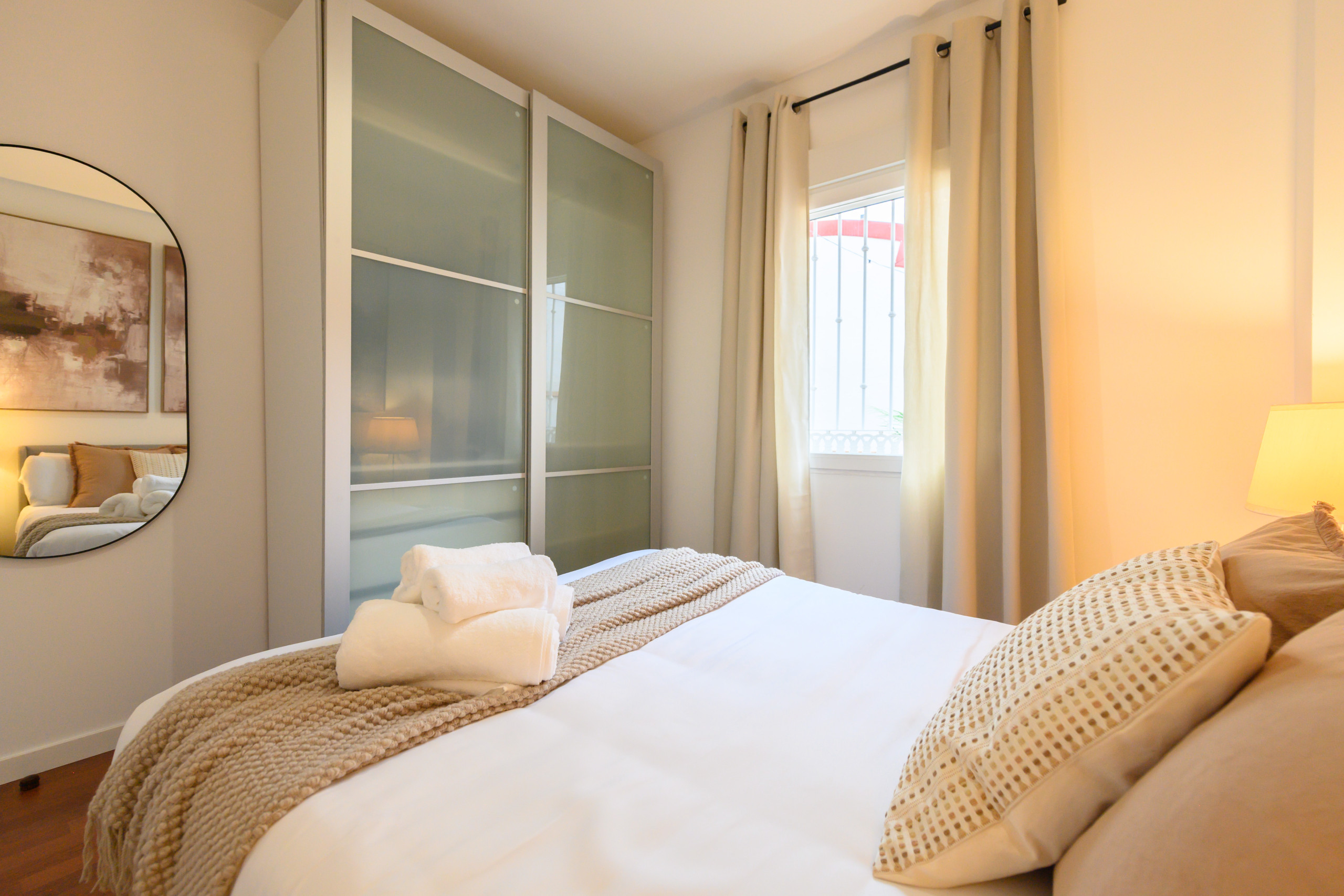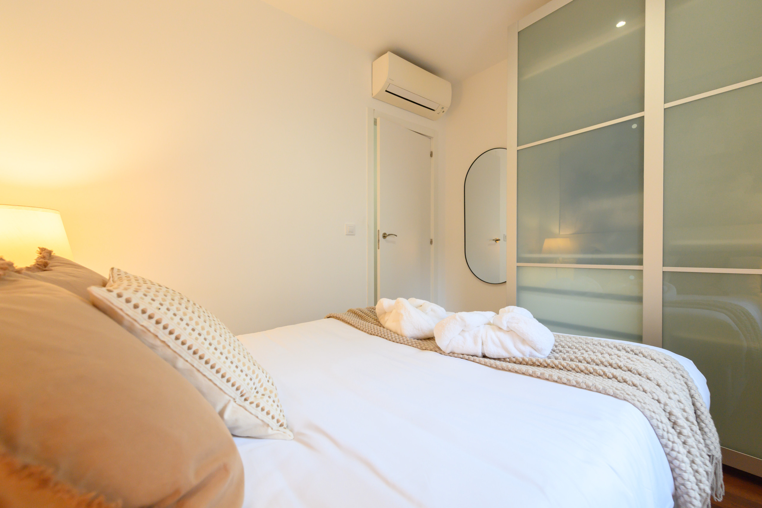 Il dispose de deux chambres, toutes deux équipées de lits doubles, de la climatisation et de grands placards, offrant confort et capacité de rangement.