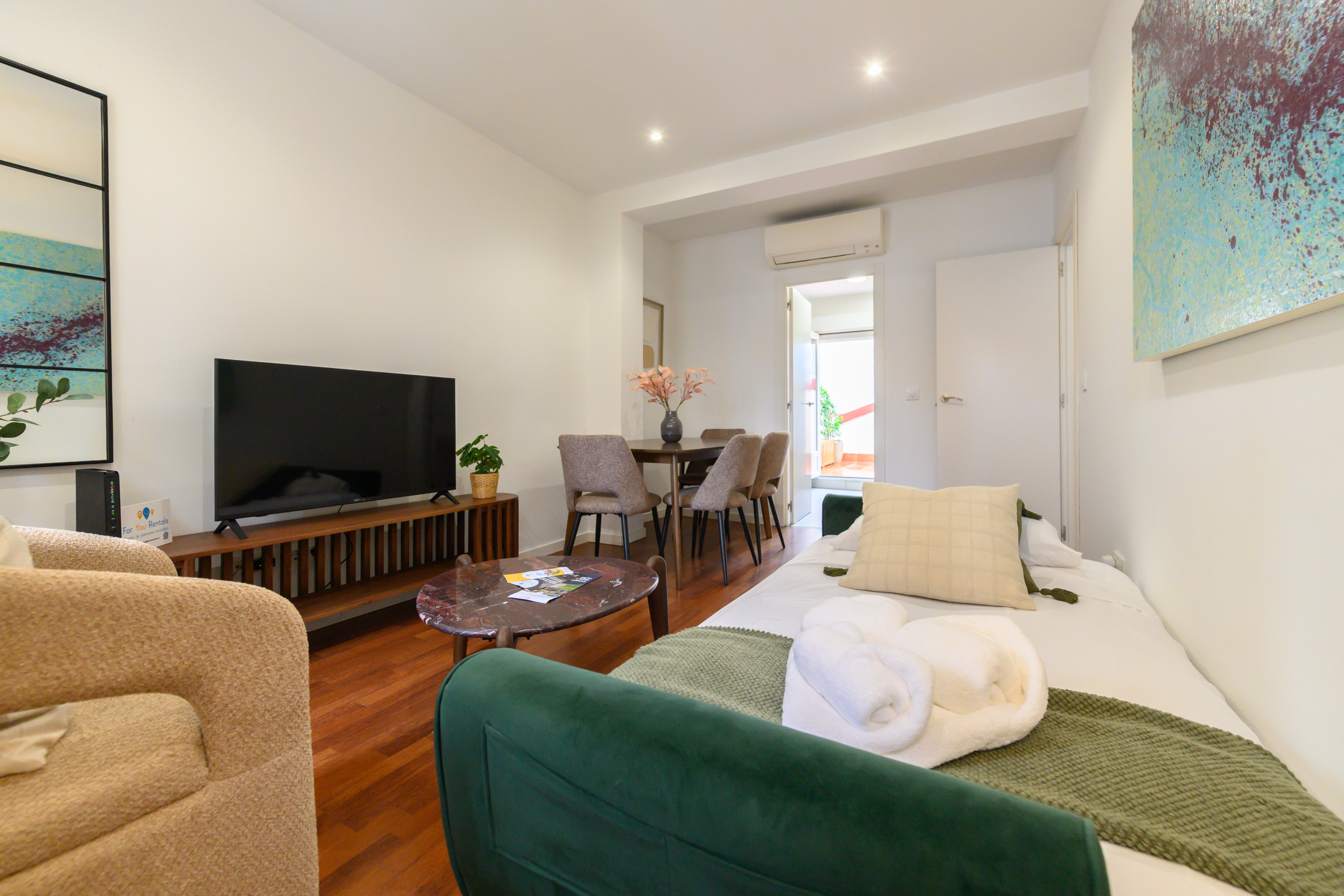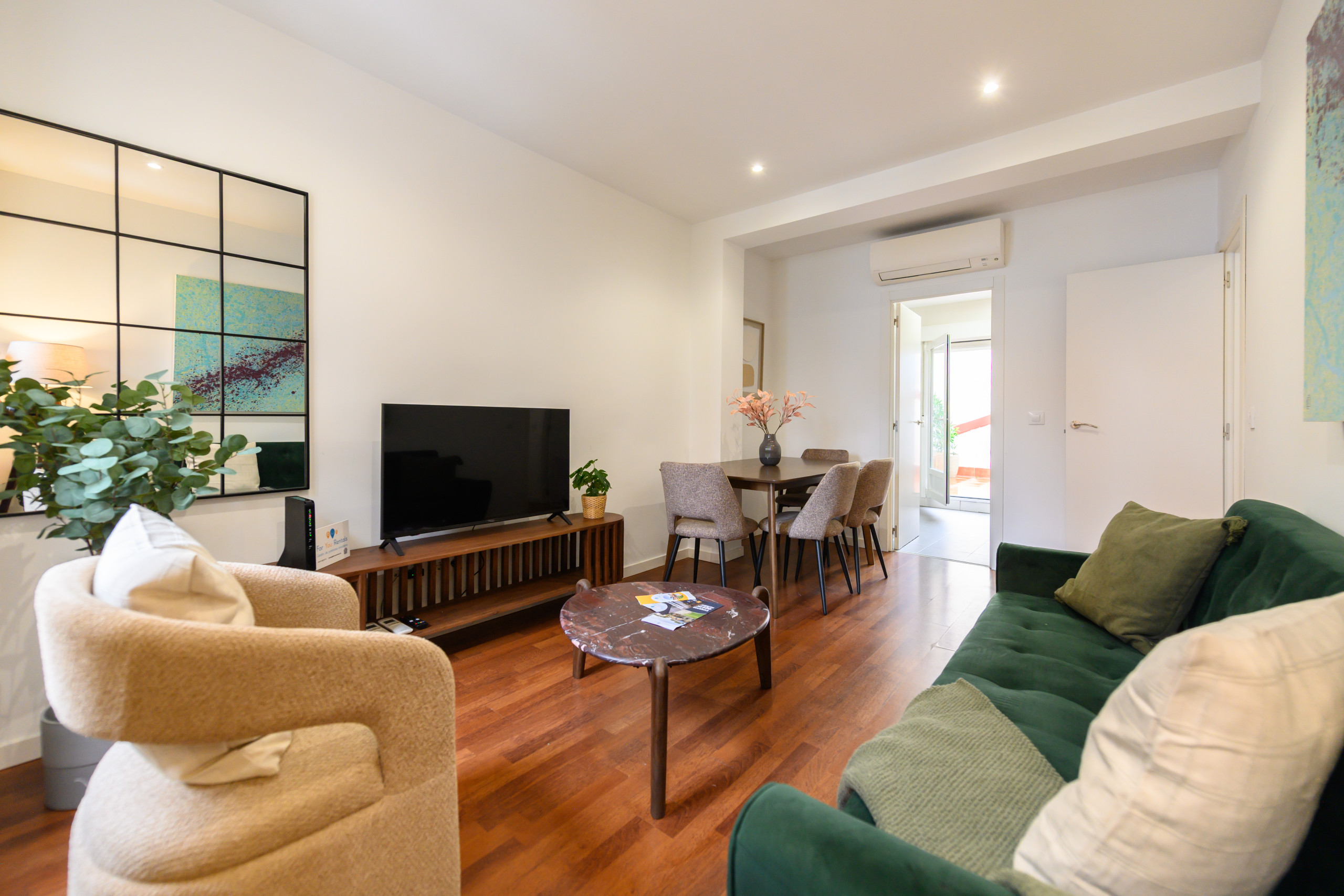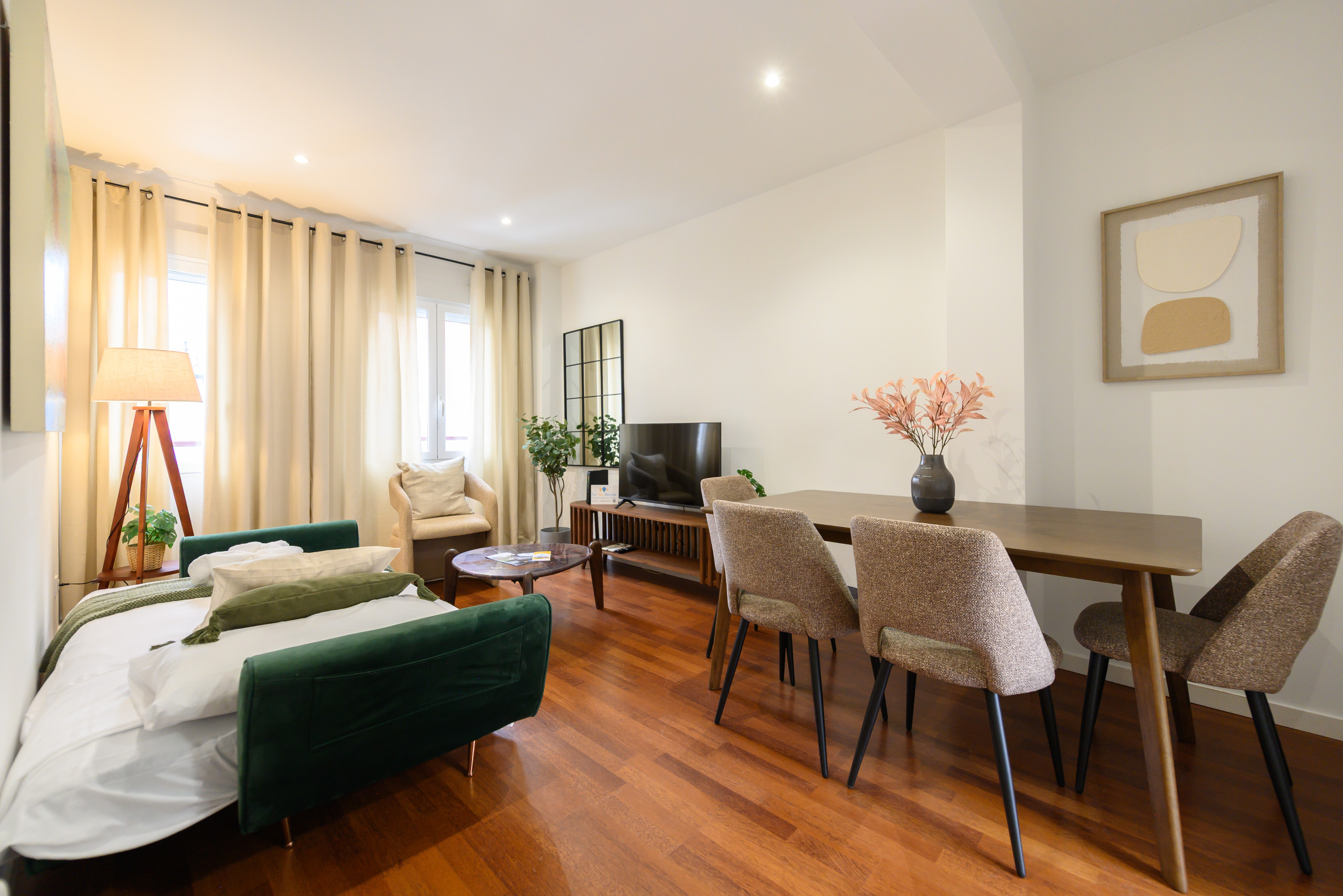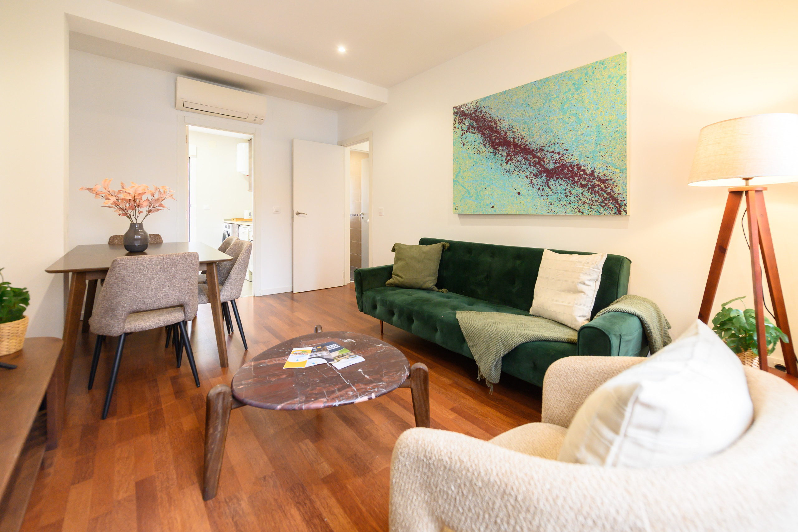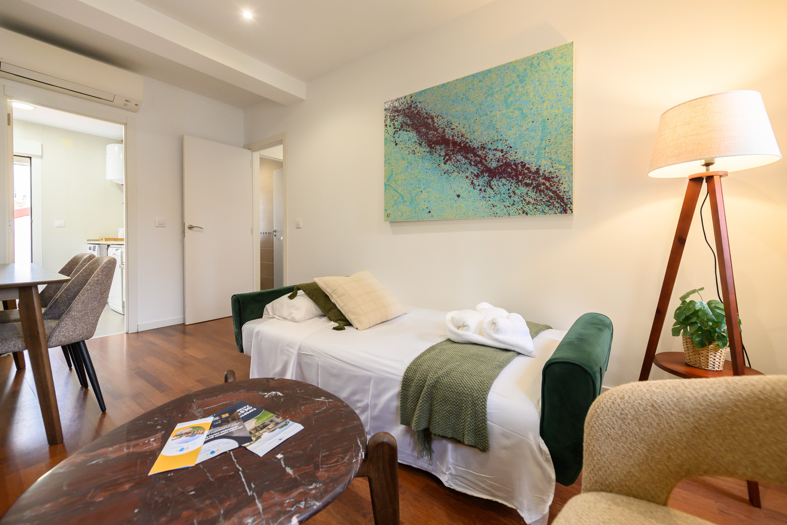 Le salon-salle à manger est spacieux et accueillant, avec un canapé-lit double, idéal pour profiter d'un espace confortable tant pour le repos que pour les repas et les réunions.