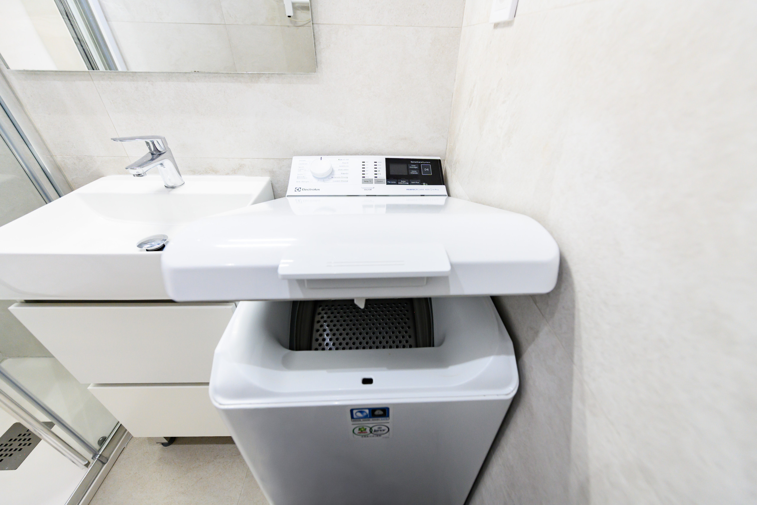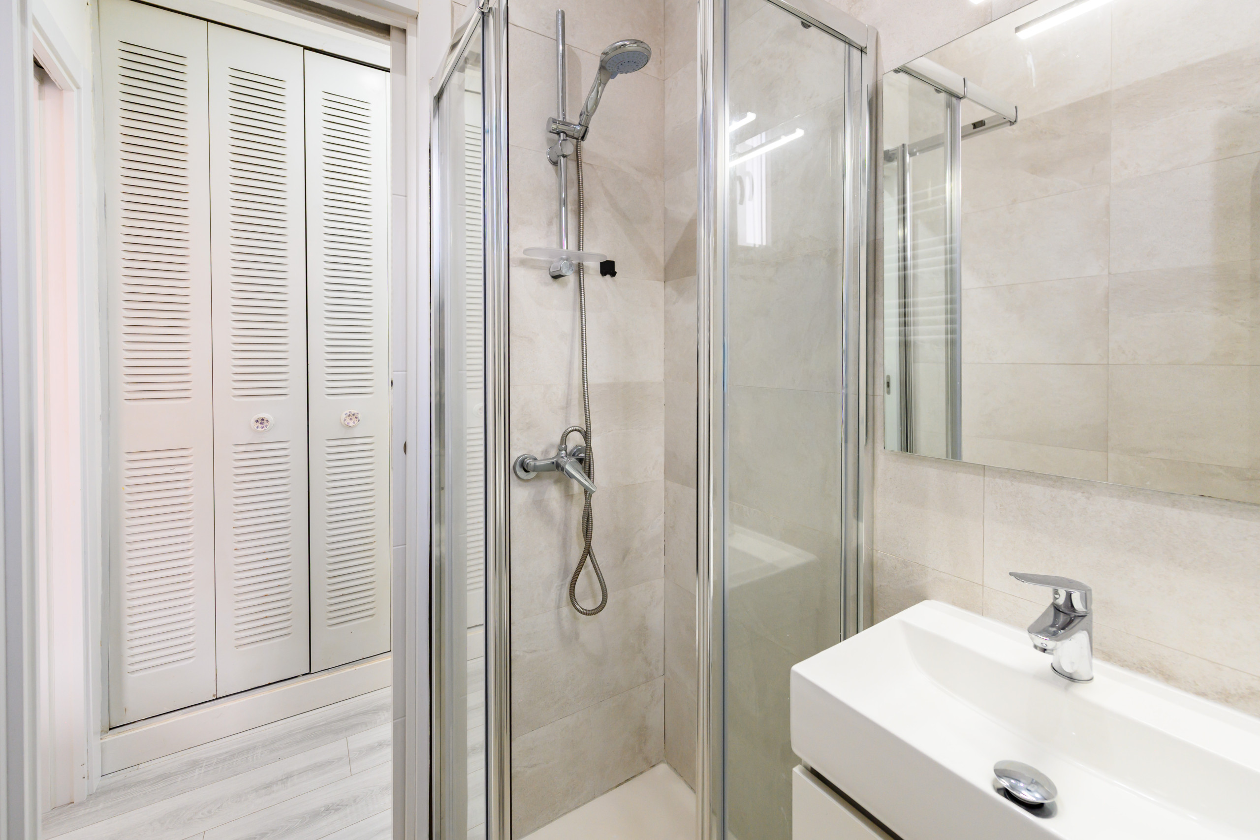 • Salle de bain : WC, douche, miroir, lave-linge et rangements.