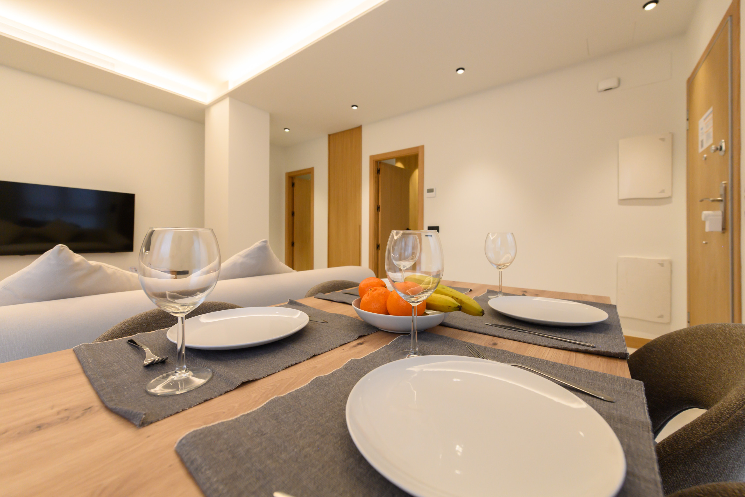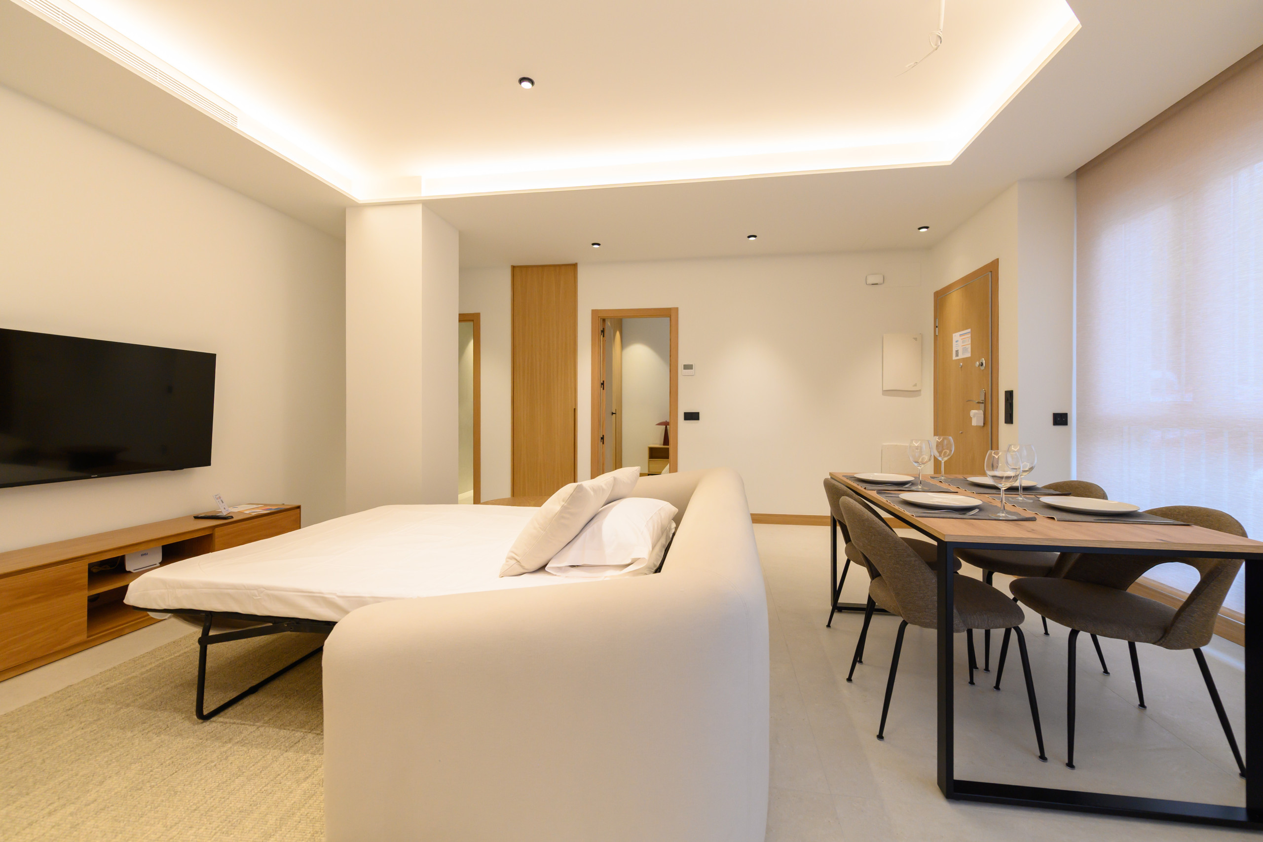 • Grand salon avec canapé-lit double, télévision, table à manger spacieuse, climatisation et chauffage, garantissant le confort à toute époque de l'année.