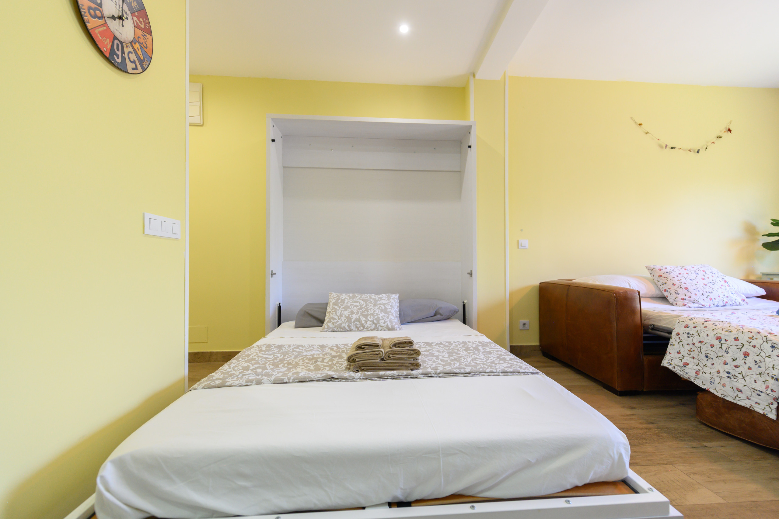 Situé au quatrième étage d'un immeuble avec ascenseur et gardien physique, cet appartement lumineux offre une terrasse et un balcon depuis lesquels on peut contempler le coucher de soleil en silence, sans bruit ni trafic. Son intérieur, chaleureux et fonctionnel, est entièrement équipé : lit escamotable, canapé-lit italien, climatisation centrale et une décoration soignée qui invite à rester.
