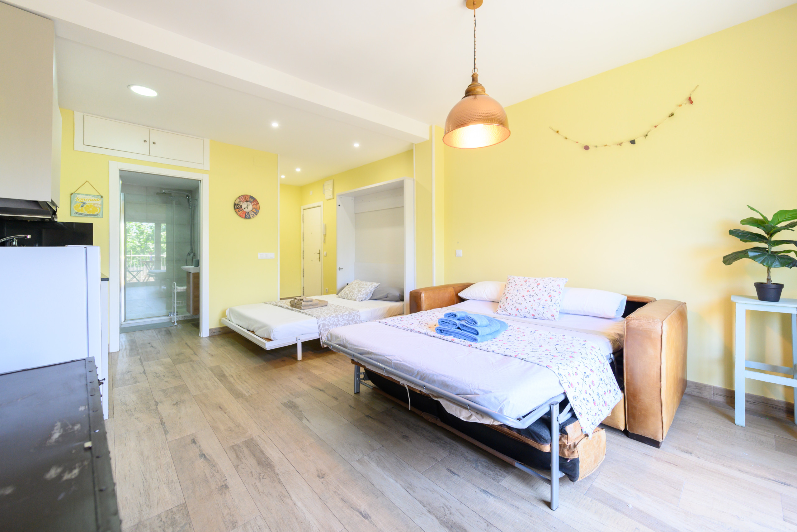 À l'intérieur, vous trouverez un salon ouvert qui combine un confortable lit de matrimoniale avec un canapé-lit, s'adaptant à vos besoins.