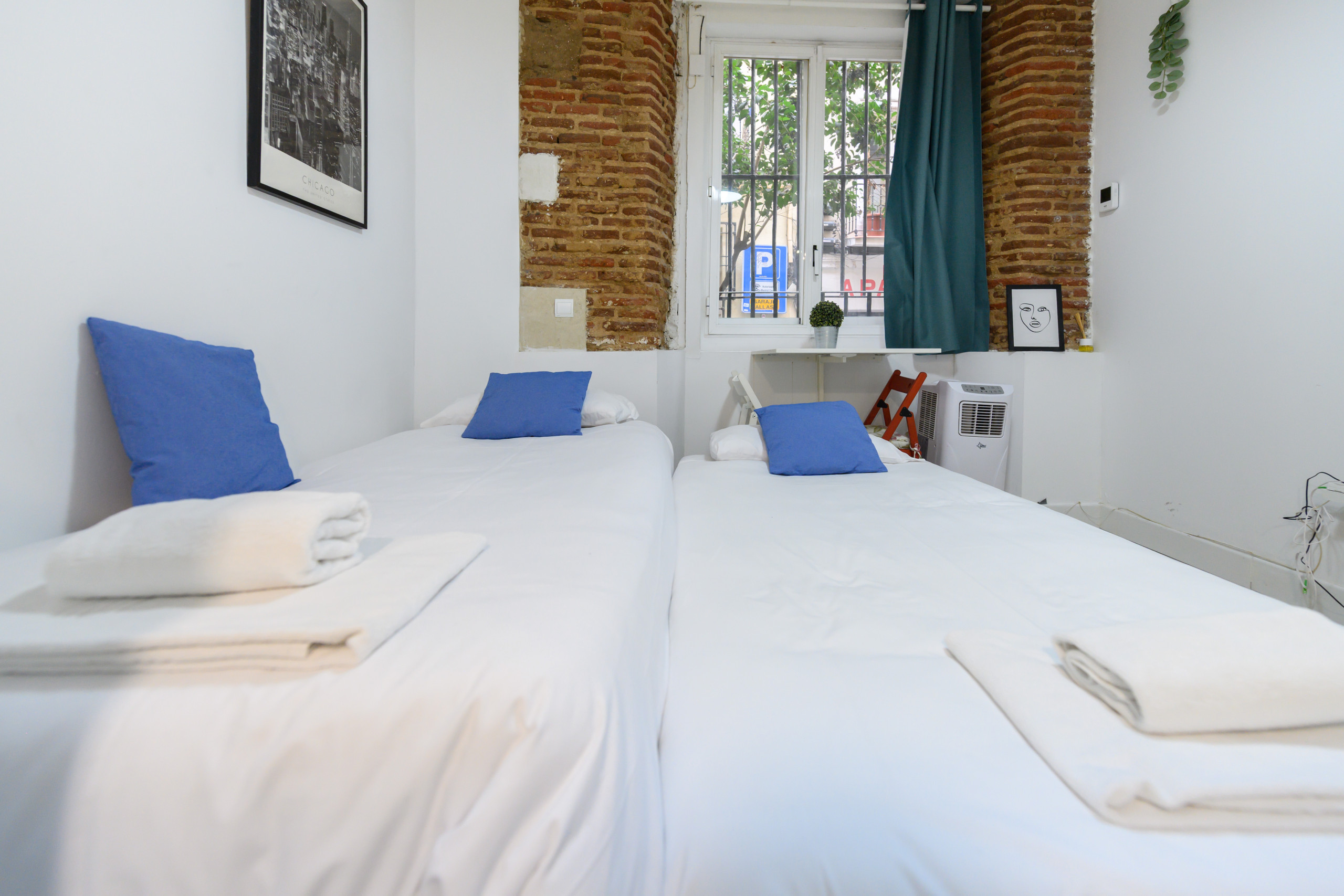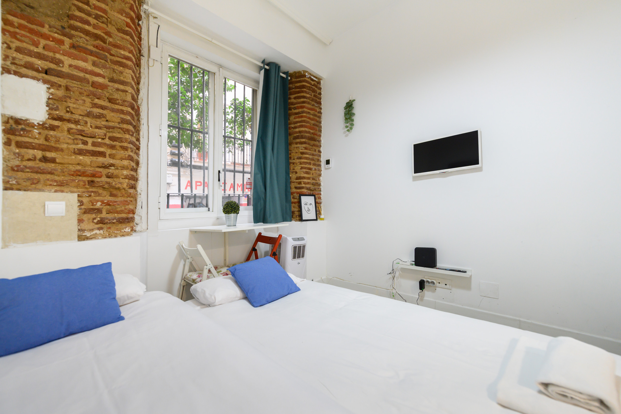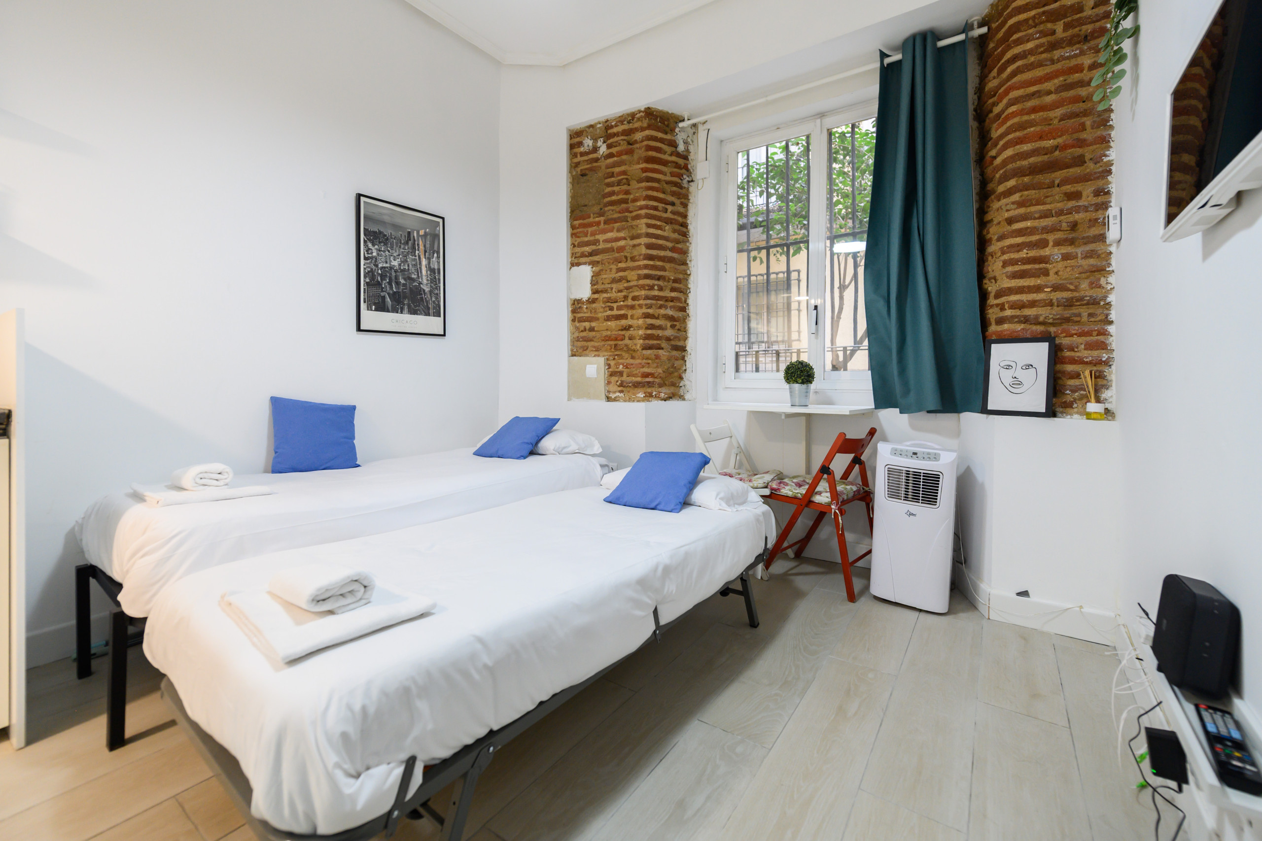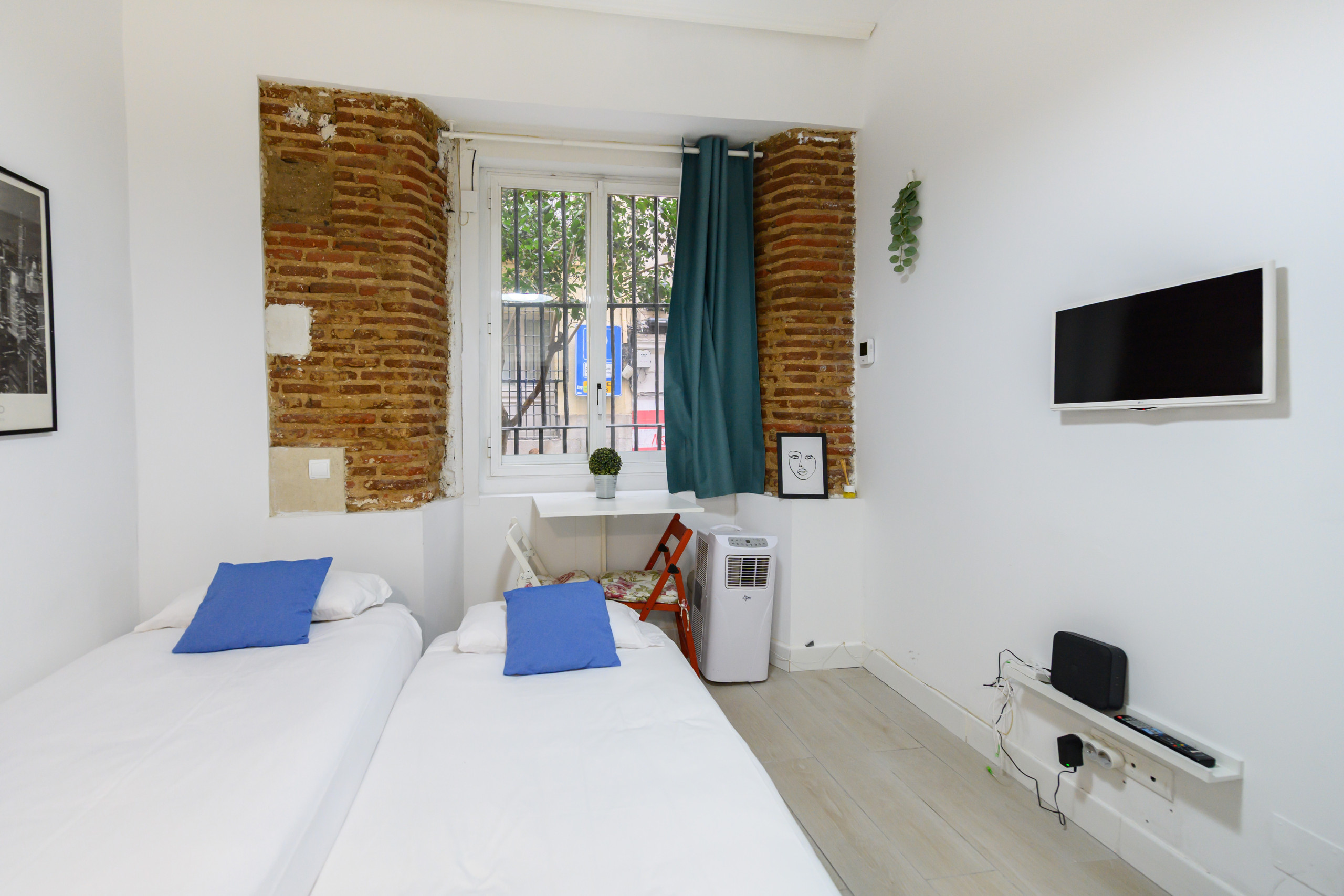• Deux lits simples, télévision, table, pompe à chaleur et climatisation, miroir et portant.