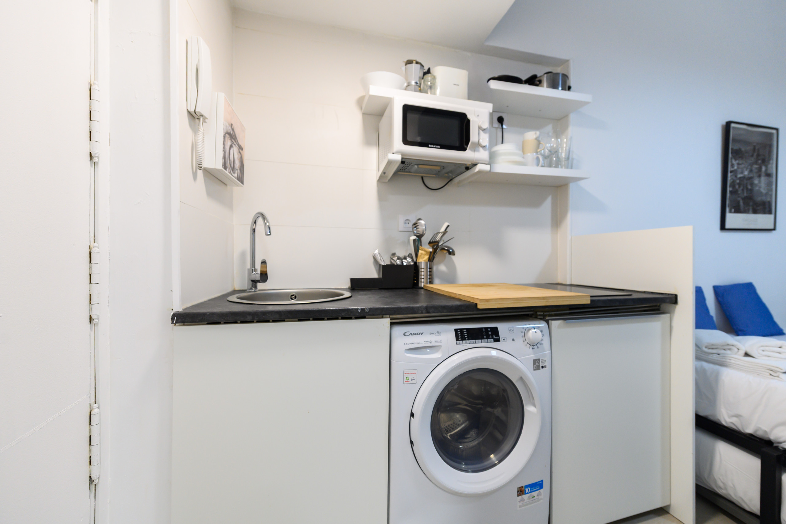 • Cuisine équipée avec micro-ondes, lave-linge, réfrigérateur et ustensiles de cuisine.
