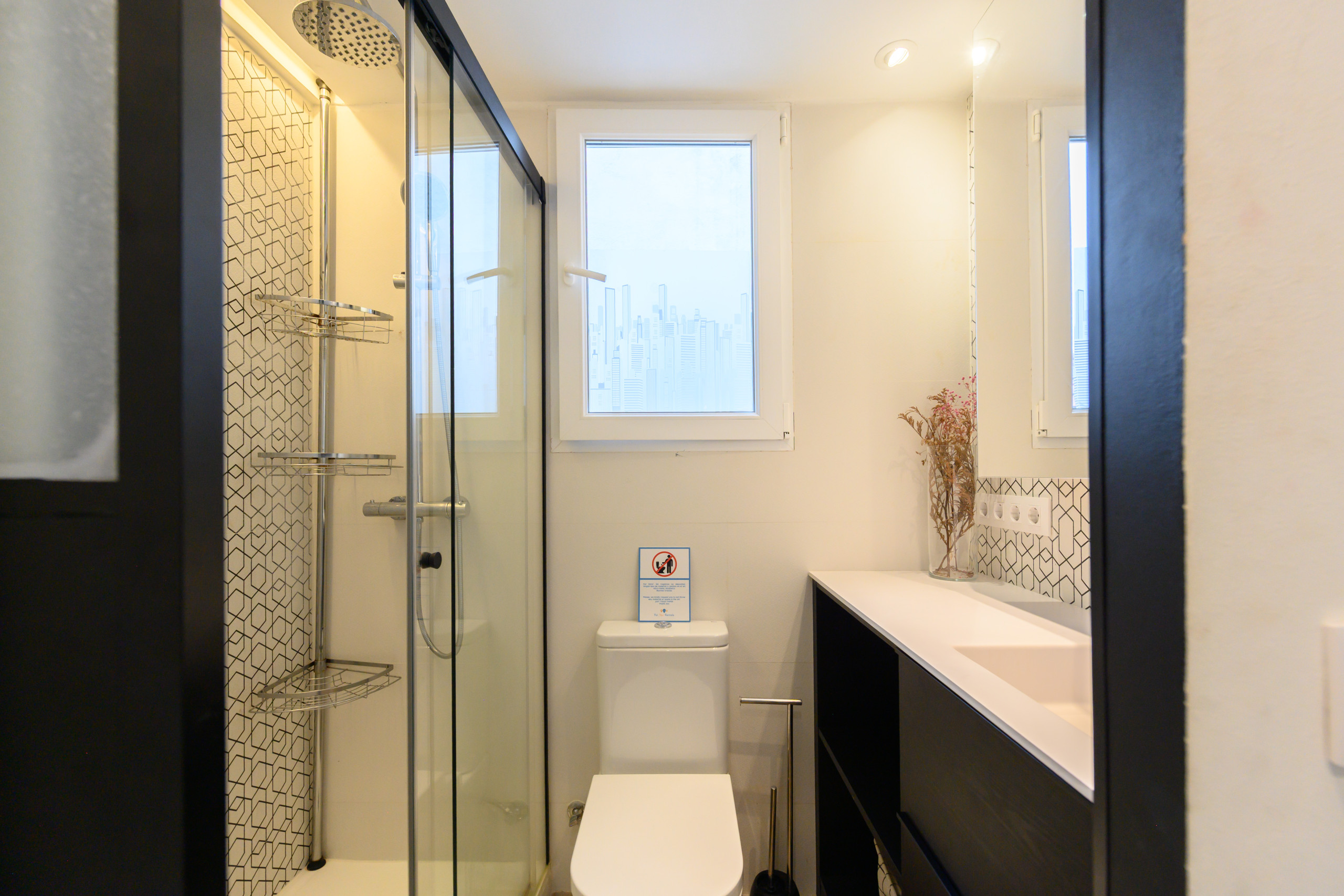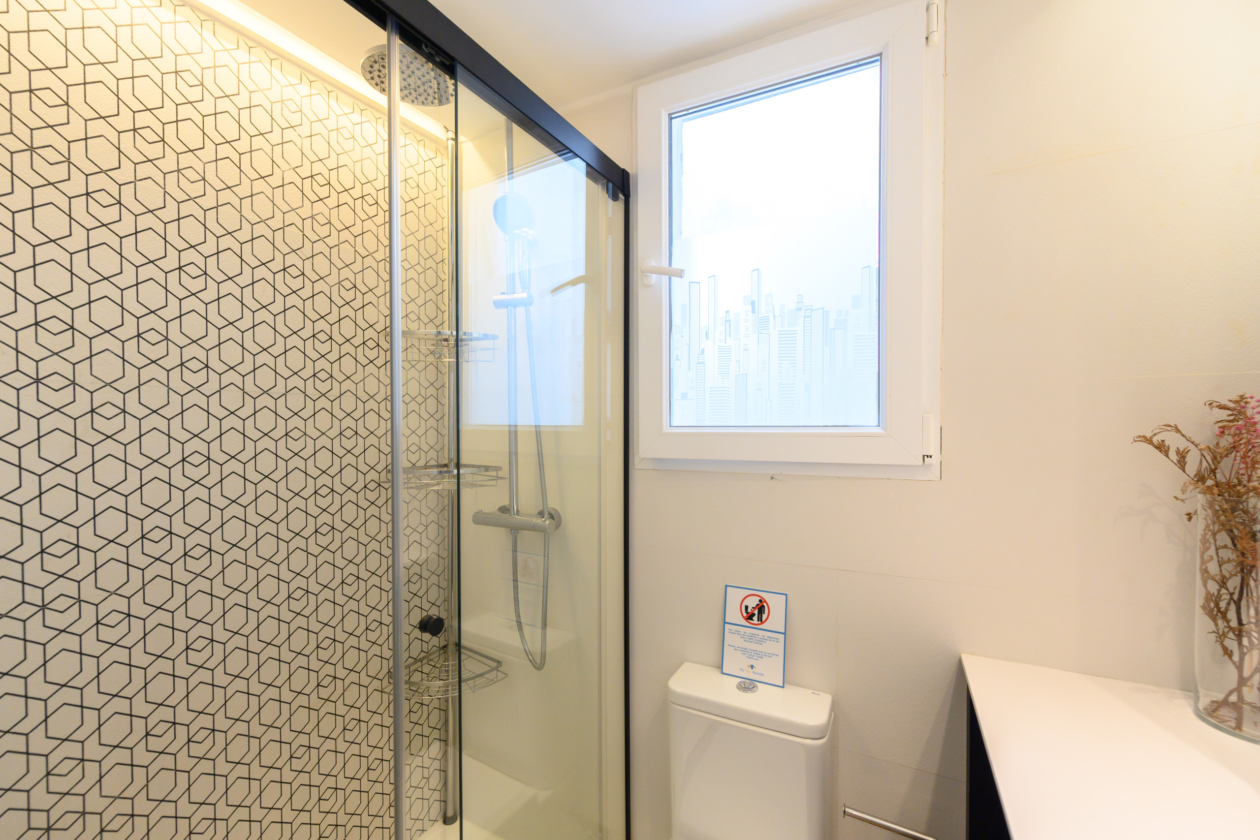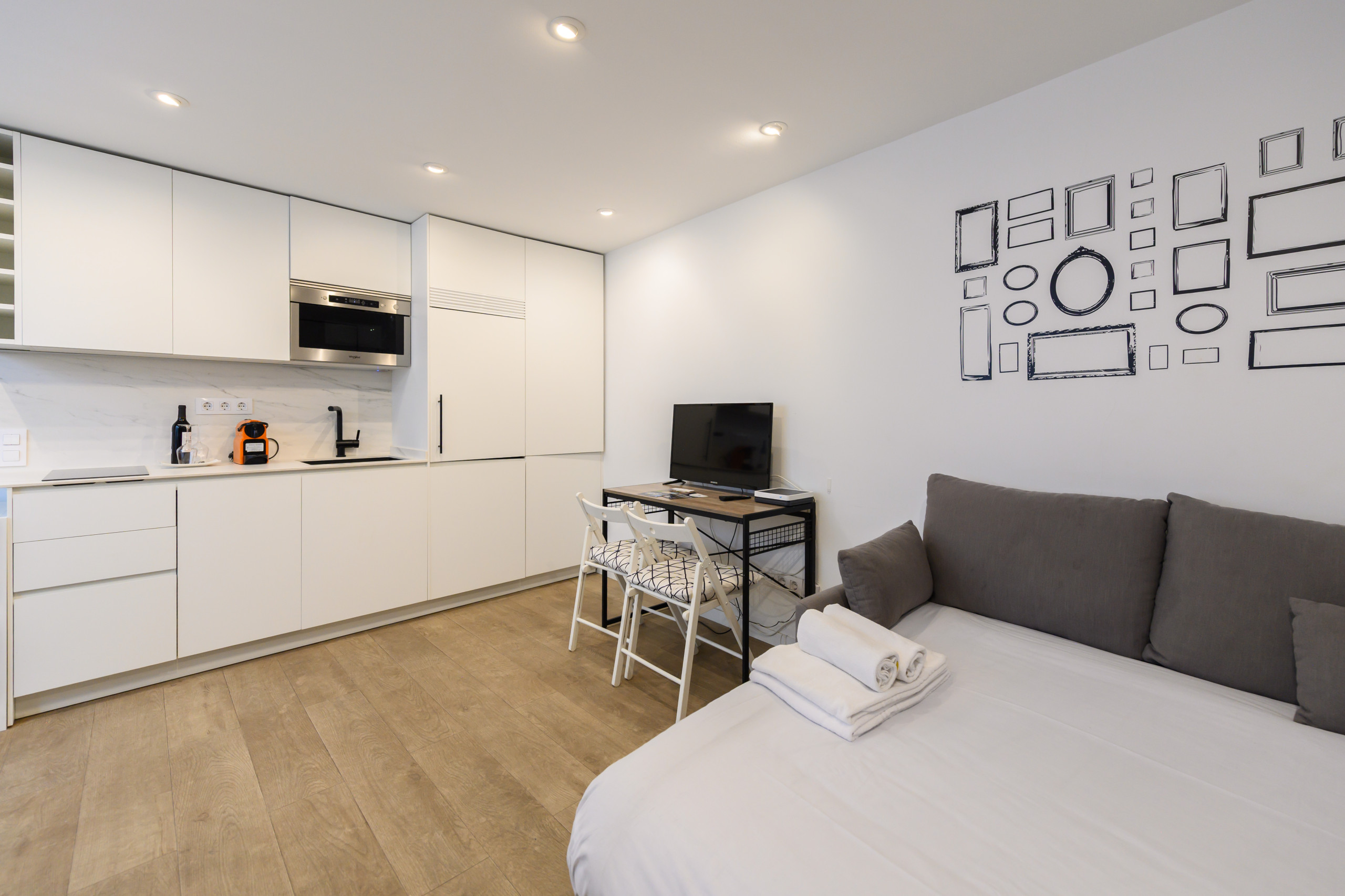 Un canapé-lit deux places, des tiroirs de rangement, une armoire, un bureau, une télévision, la climatisation et un sèche-cheveux. Une salle de bain complète avec WC, douche, miroir et rangements. Une cuisine entièrement équipée avec micro-ondes, cafetière, lave-linge, lave-vaisselle et réfrigérateur. L’immeuble dispose d’un ascenseur.