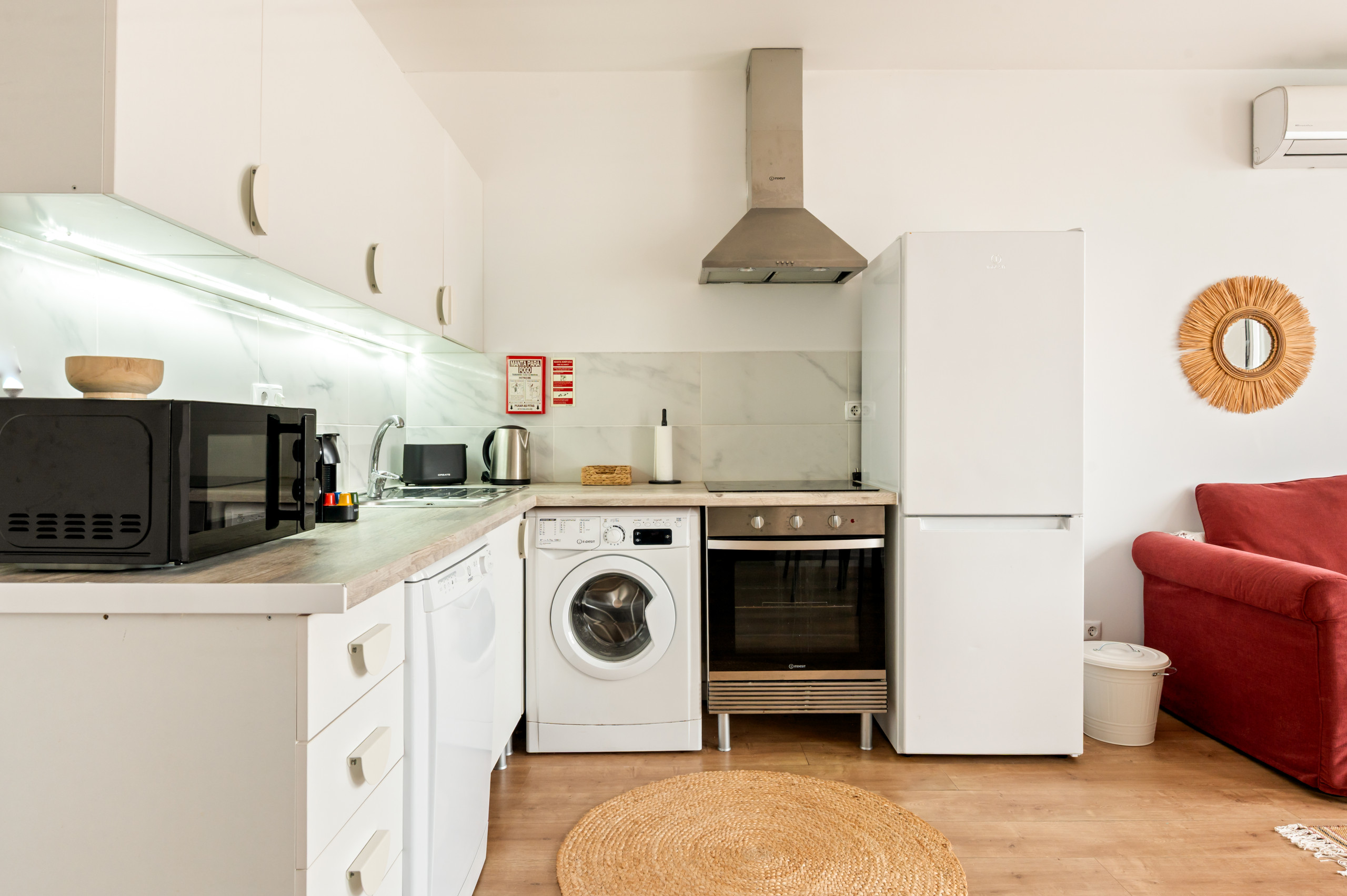 A sala de estar é espaçosa e confortável, equipada com ar condicionado e um sofá-cama, proporcionando espaço adicional para hóspedes extra. A cozinha está totalmente equipada, permitindo preparar refeições com toda a comodidade.