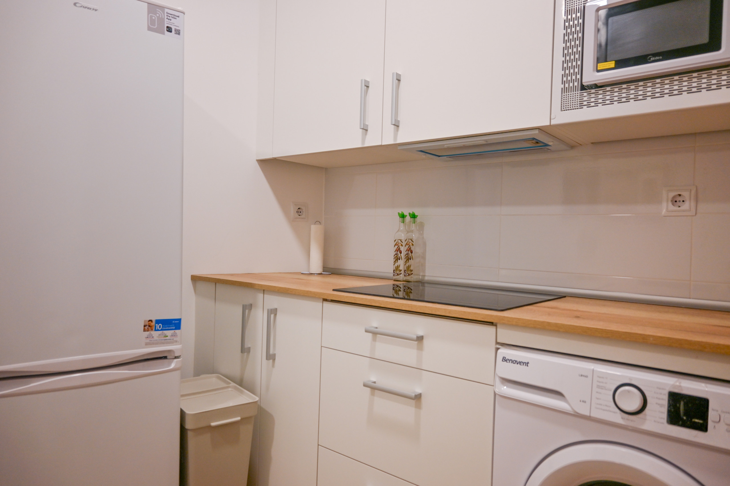 A kitchenette, de inducção, está equipada com frigorífico, microondas, congelador, louça/talheres, utensílios/cozinha, máquina de café, torradeira e jarro eléctrico.