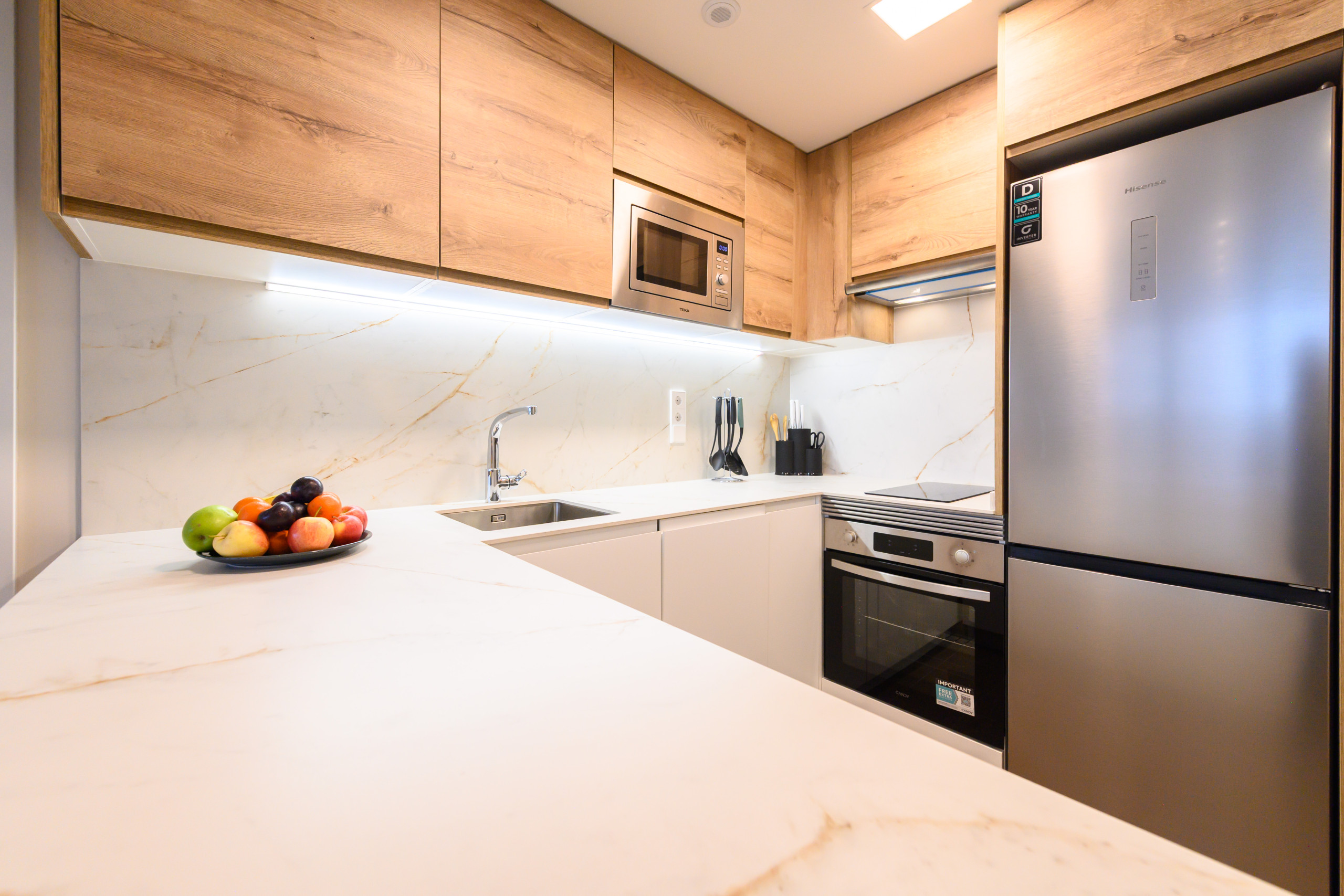 A kitchenette, de inducção, está equipada com frigorífico, microondas, forno, congelador, máquina de lavar louça, louça/talheres, utensílios/cozinha, máquina de café e máquina de sumos.