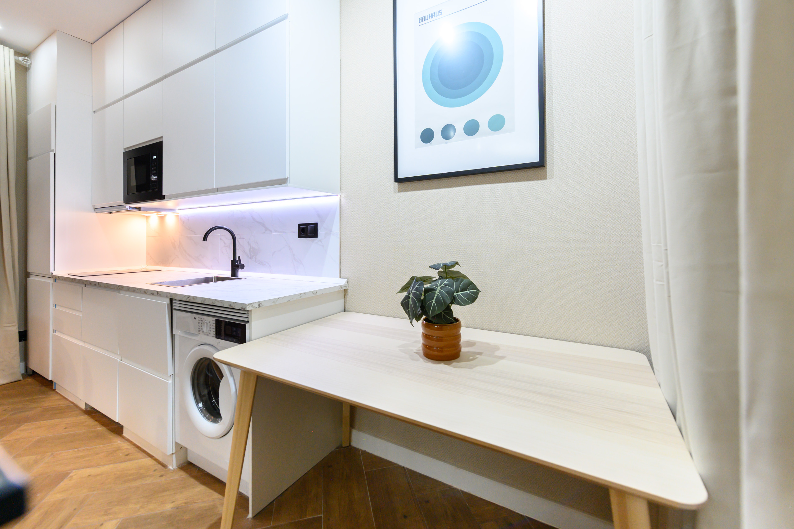 A kitchenette, de inducção, está equipada com frigorífico, microondas, congelador, máquina de lavar louça, louça/talheres, utensílios/cozinha, máquina de café, torradeira e jarro eléctrico.