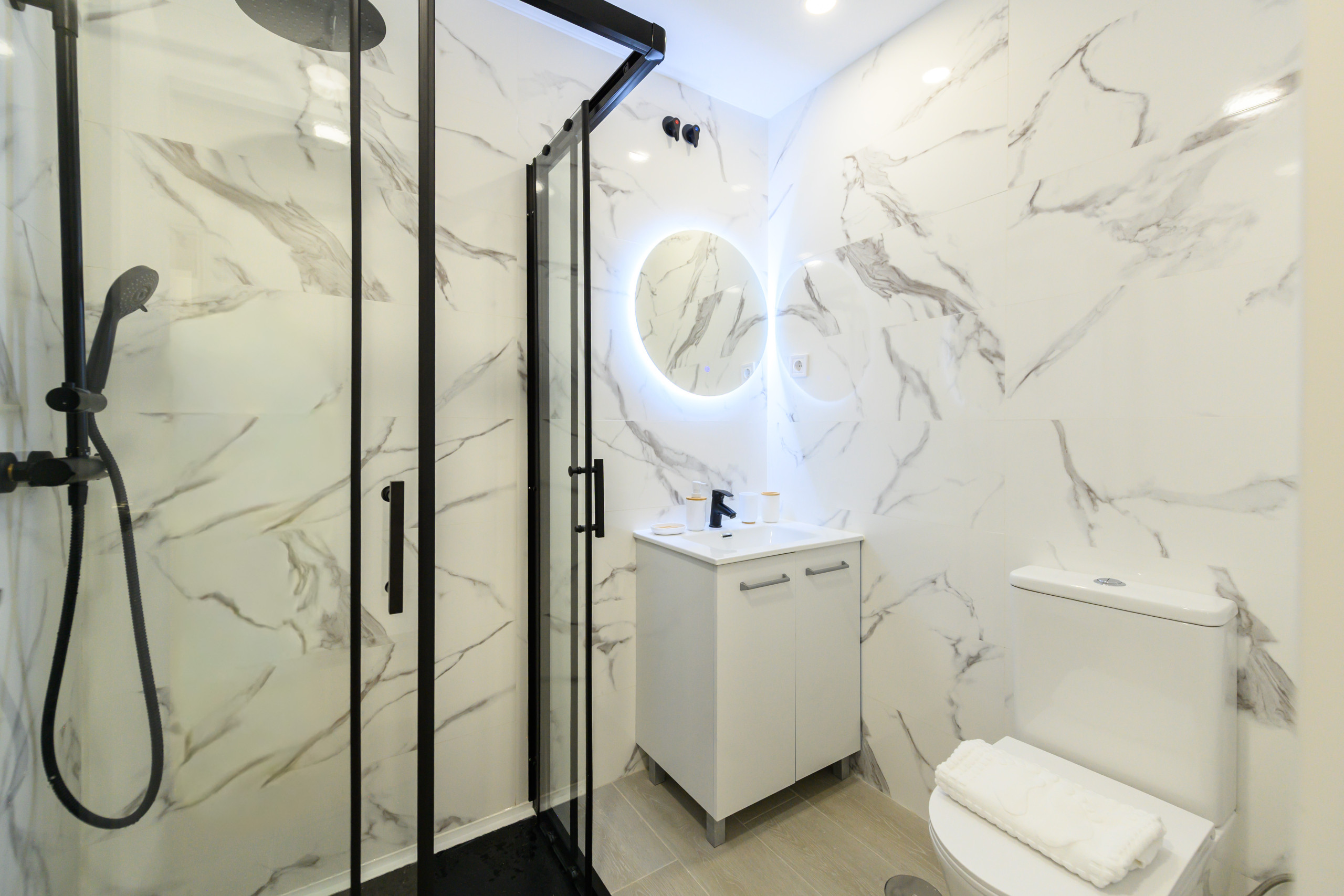 • Second bedroom with a double bed, desk, bedside tables, large built-in wardrobe, mirror, air conditioning, and a private terrace with a table and chairs, also offering beautiful city views. And inside, a full en-suite bathroom with toilet, shower, mirror, and storage space.