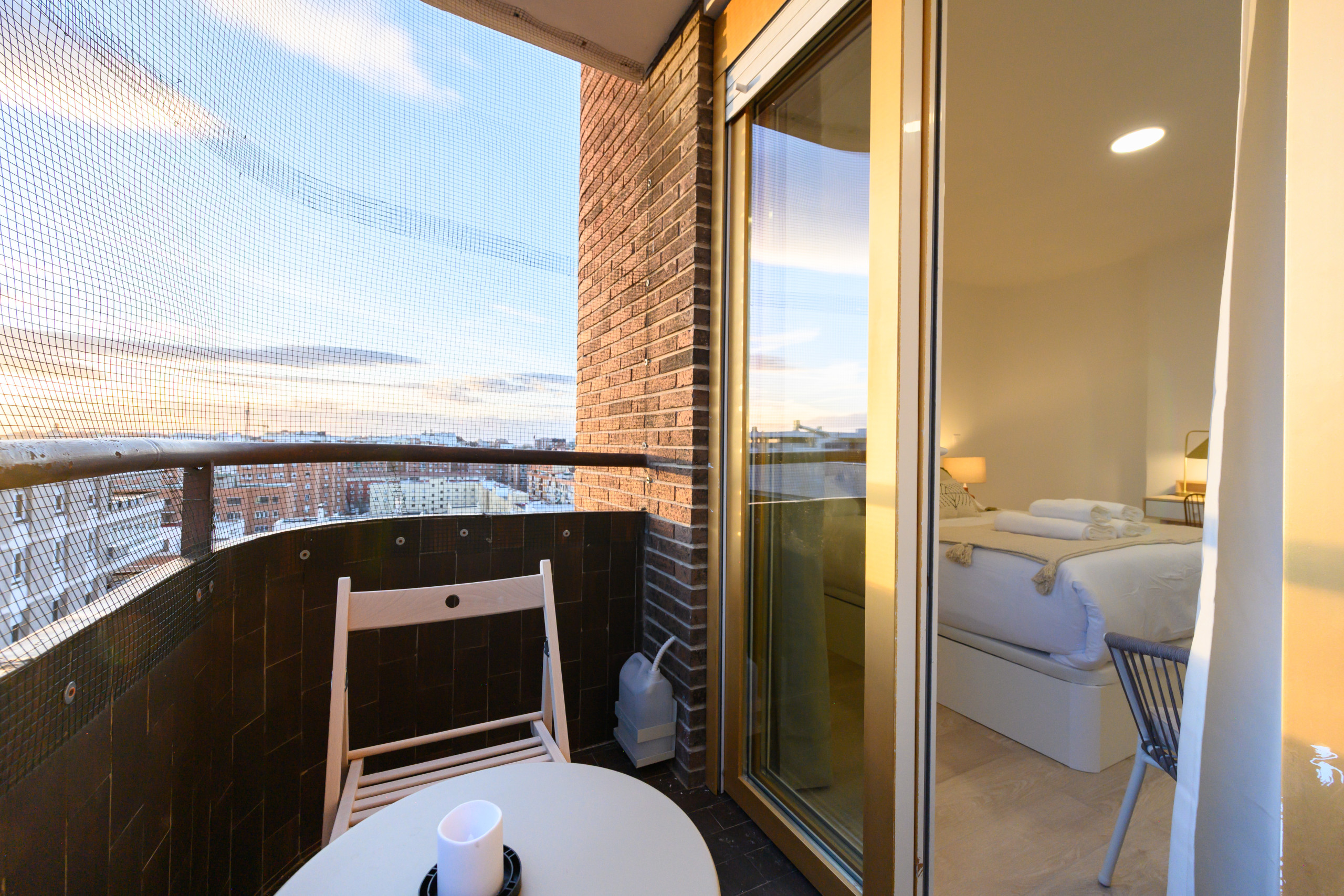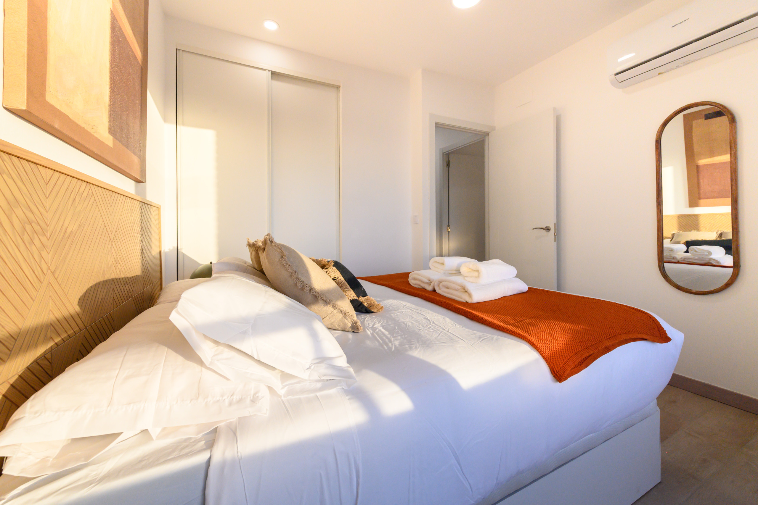 • First bedroom with a double bed, built-in wardrobe, mirror, air conditioning and heating, and a private terrace with a table and chairs, offering beautiful city views and spectacular sunsets.