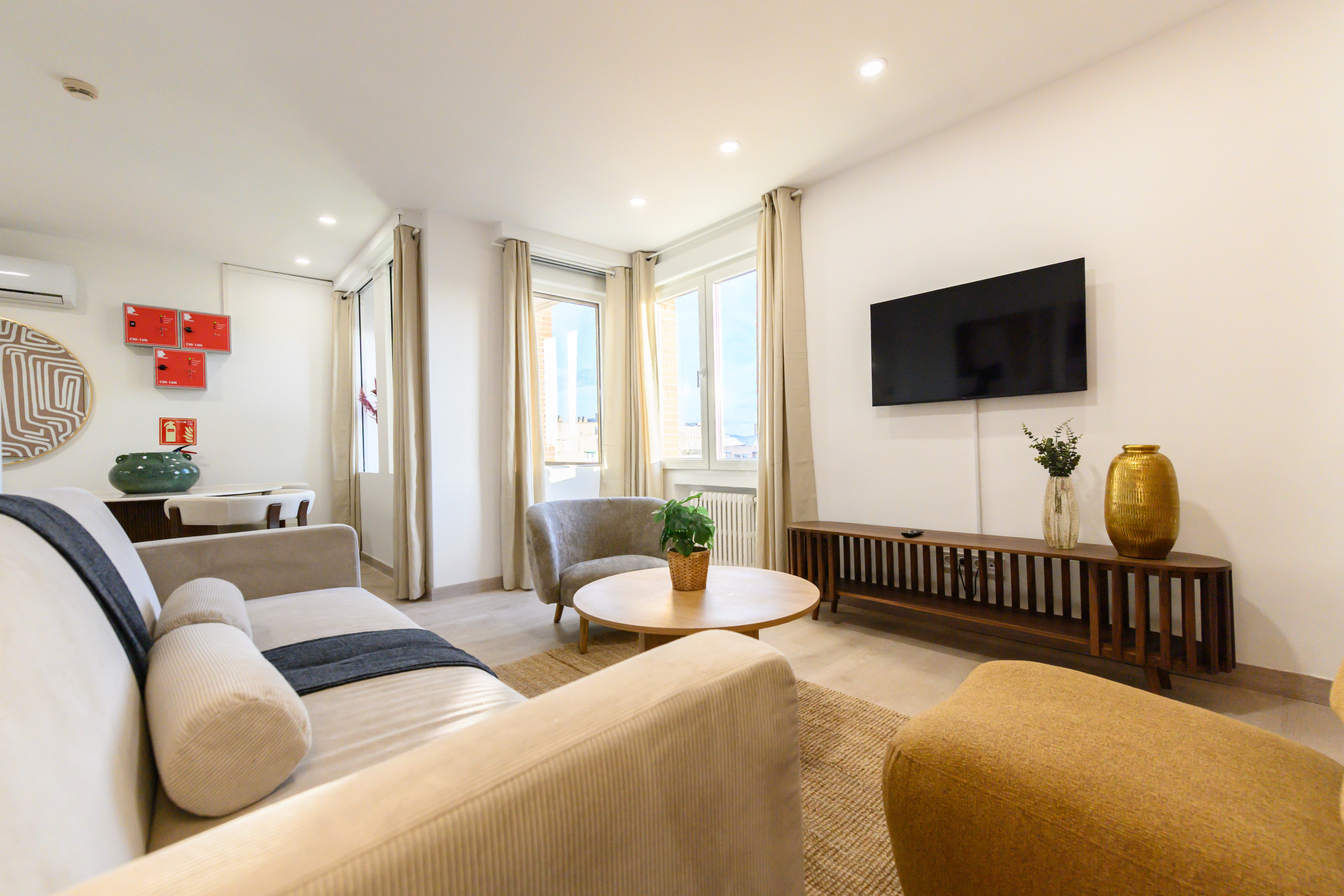 • Spacious and bright living room with dining table, sofa, armchairs, TV, mirror, air conditioning, and heating. Large windows with beautiful city views.