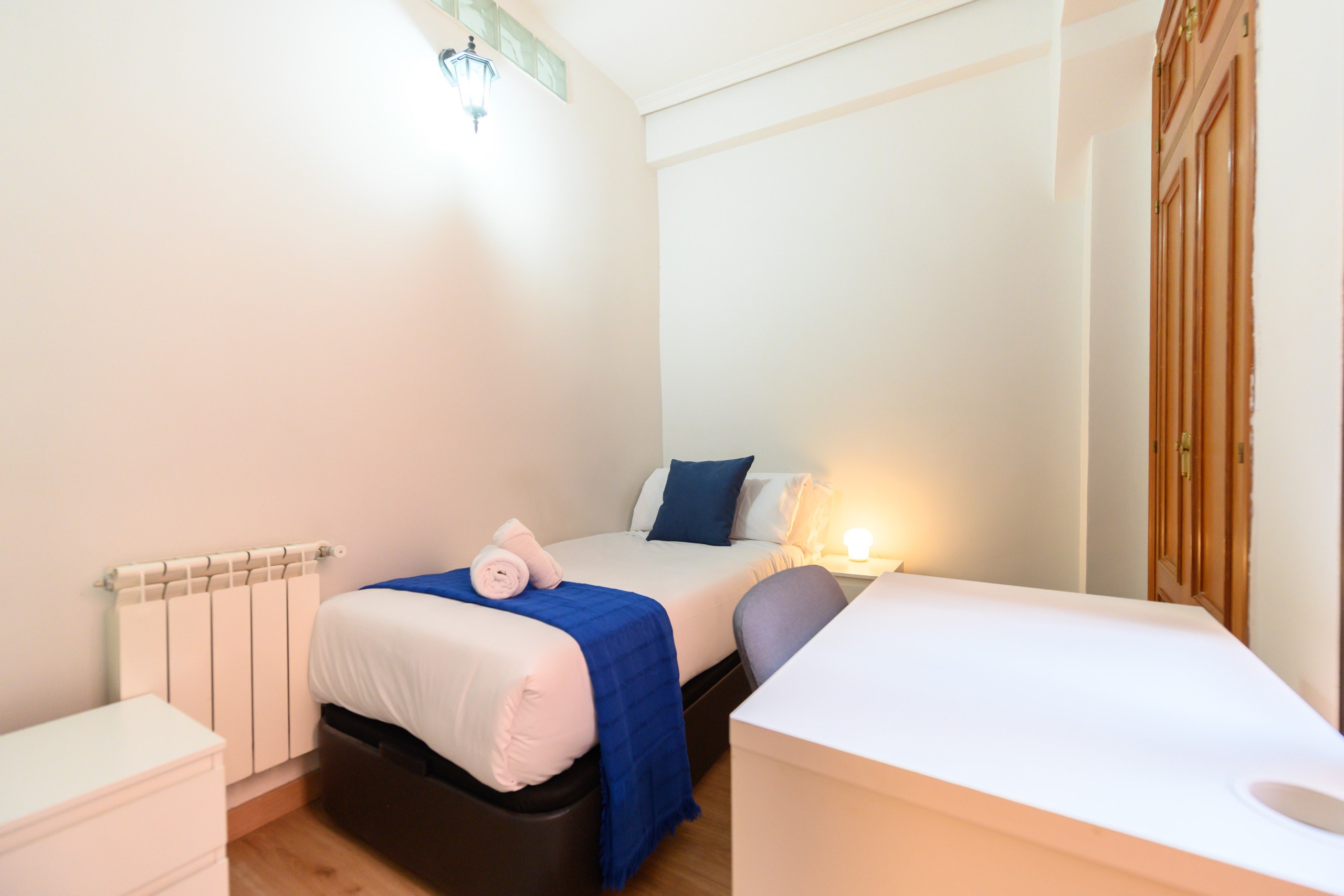 • Second bedroom with a single bed, built-in wardrobe, desk, and bedside tables.