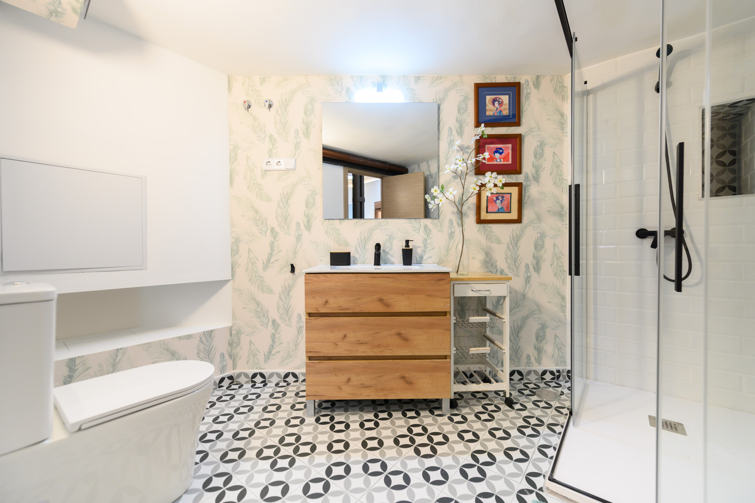 The full bathroom is equipped with a shower tray, washbasin with mirror, and all the necessary elements for your comfort.