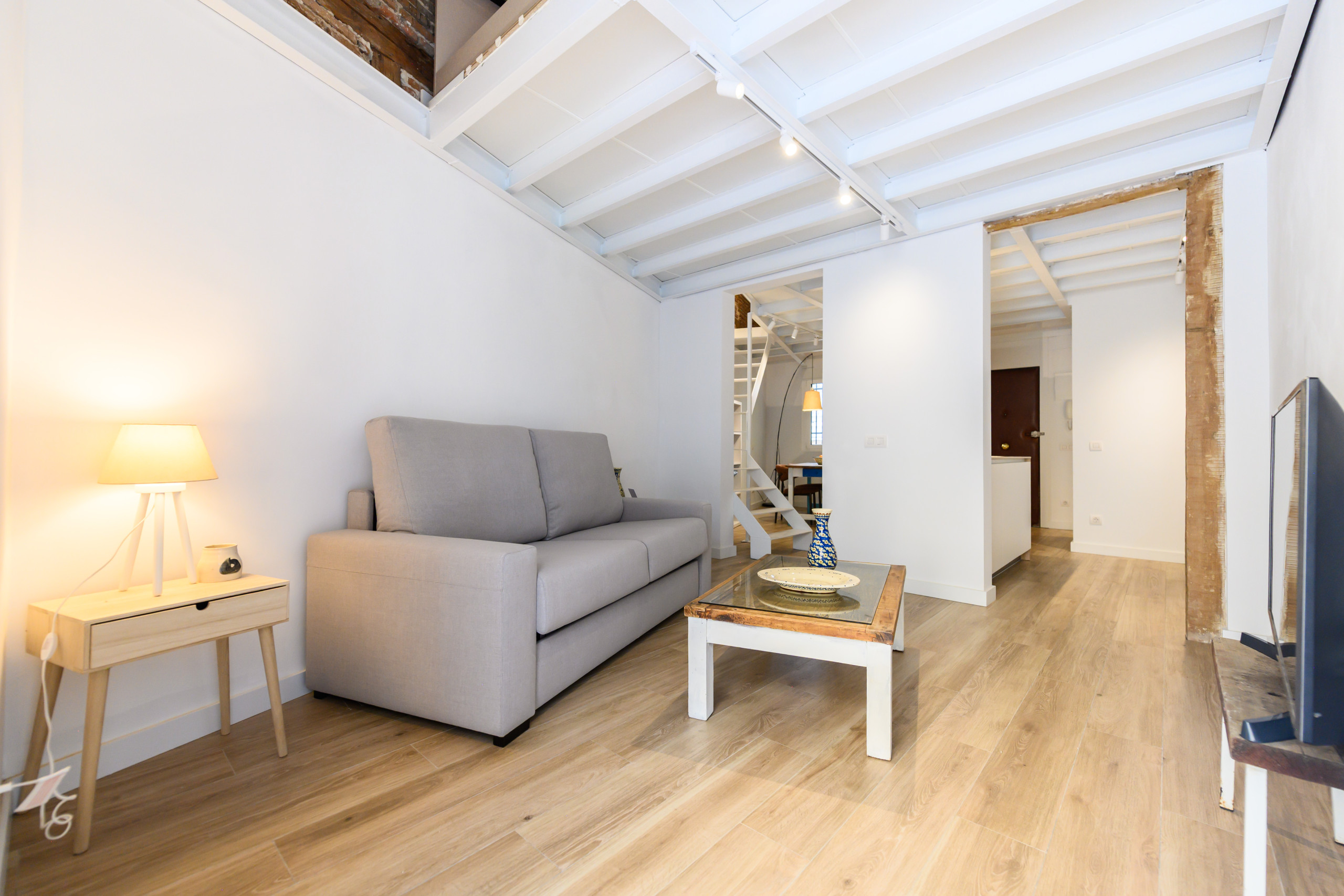 • A bright living room with a sofa that converts into a double sofa bed, a TV, and a table.