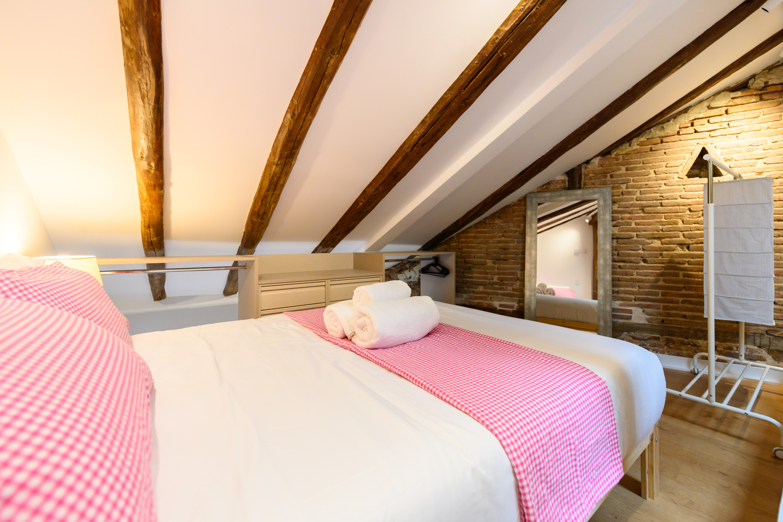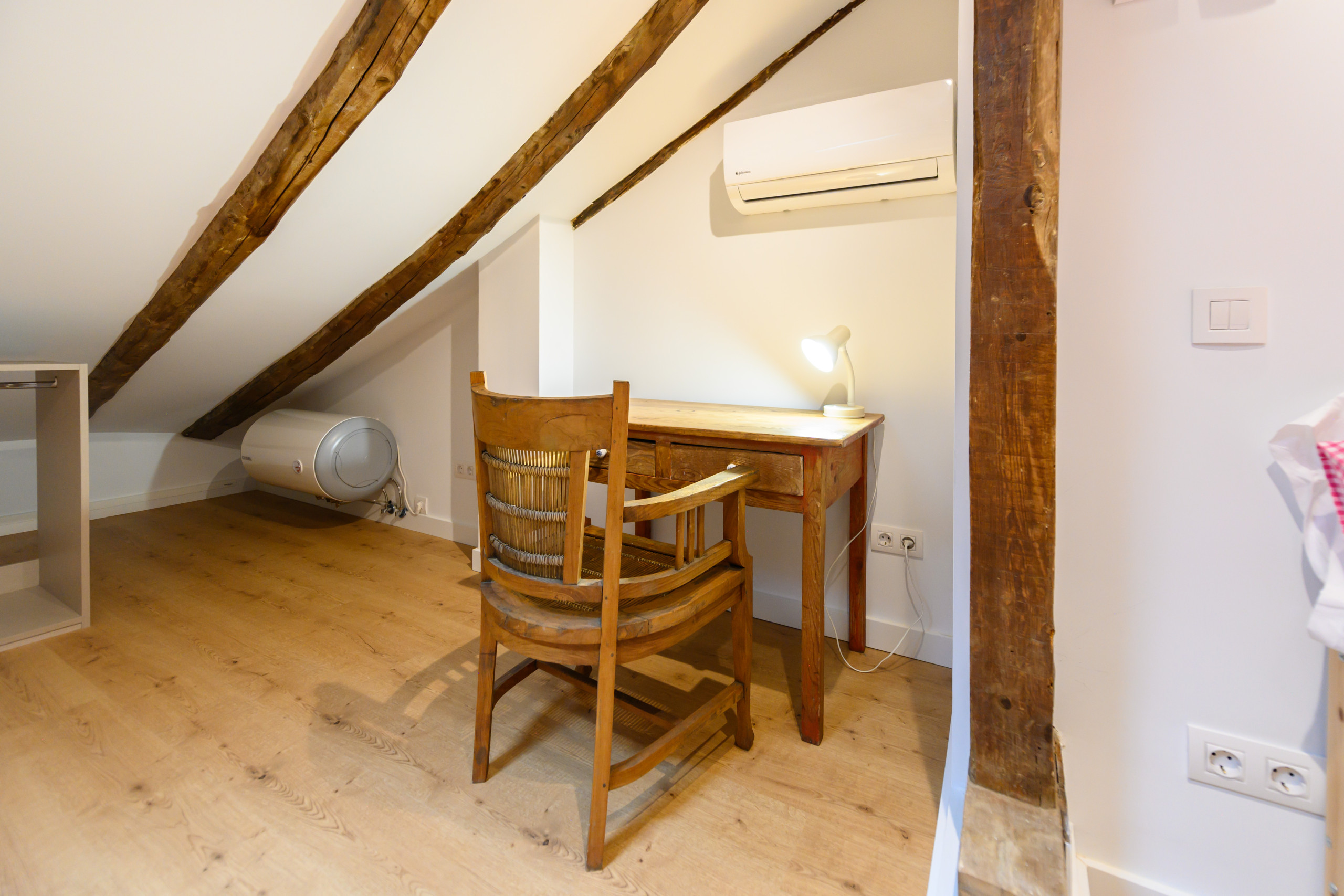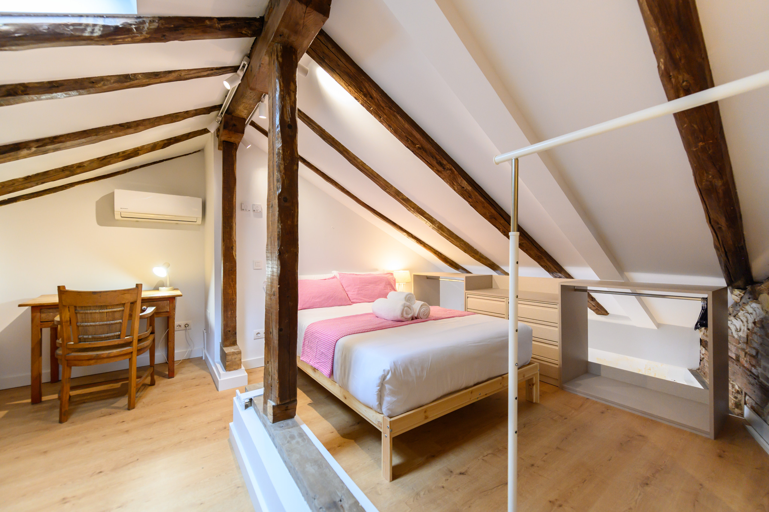 • An upstairs bedroom with a double bed, a desk ideal for working from home or studying, ample dressers, a clothes rack, a mirror, and air conditioning.